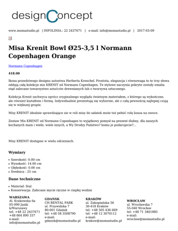 www.momastudio.pl | INFOLINIA.: 22 2437671 | e-mail: [email protected] | 2017-03-09 Misa Krenit Bowl Ø25-3,5 l Normann Copenhagen Orange Normann Copenhagen 418.00 Ikona prawdziwego designu autostwa Herberta Krenchel. Prostota, elegancja i równowaga to te trzy słowa oddają całą kolekcje mis KRENIT od Normann Copenhagen. Te stylowe naczynia pokryte zostały emalia stąd zalecane towarzystwo sztućców drewnianych lub z tworzywa sztucznego. Kolekcja Krenit zachwyca oprócz oryginalnego wyglądu świetnym materiałem, z którego są wykończne, ale również kształtem i formą. Indywidualnie prezentują się wybornie, ale z całą pewnością najlepiej czują się w większej grupie. Misy KRENIT idealnie sprawdzające sie w roli misy do sałatek może też pełnić rolę kosza na owoce. Zestaw Mis KRENIT od Normann Copenhagen to wyjątkowy pomysł na prezent ślubny, dla naszych kochanych mam i wiele, wiele innych, a Wy Drodzy Państwo? komu je podarujecie?... Misy KRENIT dostępne w wielu odcieniach. Wymiary ● ● ● ● Szerokość: 0.00 cm Wysokość: 14.00 cm Głębokość: 0.00 cm Średnica : 25 cm Dane techniczne ● ● Materiał: Stal Konserwacja: Zalecane mycie ręczne w ciepłej wodzie WARSZAWA Al. Krakowska 6a 05-090 Janki k/Warszawy tel: +48 22 2437671 +48 664 890 337 e-mail: [email protected] GDAŃSK CH RENTAL PARK ul. Przywidzka 7 80-001 Gdańsk tel: +48 58 3508790 e-mail: [email protected] KRAKÓW ul. Zakopiańska 56 30-418 Kraków tel: +48 505 436 669 tel: +48 12 3070112 e-mail: [email protected] WROCŁAW ul. Wrocławska 7 55-040 Wrocław tel: +48 71 3461885 e-mail: [email protected]