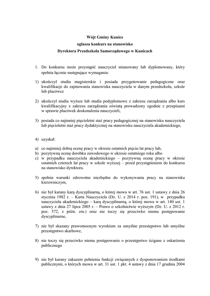Wójt Gminy Kunice ogłasza konkurs na stanowisko Dyrektora Przedszkola Samorządowego w Kunicach 1. Do konkursu może przystąpić nauczyciel mianowany lub dyplomowany, który spełnia łącznie następujące wymagania: 1) ukończył studia magisterskie i posiada przygotowanie pedagogiczne oraz kwalifikacje do zajmowania stanowiska nauczyciela w danym przedszkolu, szkole lub placówce 2) ukończył studia wyższe lub studia podyplomowe z zakresu zarządzania albo kurs kwalifikacyjny z zakresu zarządzania oświatą prowadzony zgodnie z przepisami w sprawie placówek doskonalenia nauczycieli, 3) posiada co najmniej pięcioletni staż pracy pedagogicznej na stanowisku nauczyciela lub pięcioletni staż pracy dydaktycznej na stanowisku nauczyciela akademickiego, 4) uzyskał: a) co najmniej dobrą ocenę pracy w okresie ostatnich pięciu lat pracy lub, b) pozytywną ocenę dorobku zawodowego w okresie ostatniego roku albo c) w przypadku nauczyciela akademickiego – pozytywną ocenę pracy w okresie ostatnich czterech lat pracy w szkole wyższej – przed przystąpieniem do konkursu na stanowisko dyrektora. 5) spełnia warunki zdrowotne niezbędne do wykonywania pracy na stanowisku kierowniczym, 6) nie był karany karą dyscyplinarną, o której mowa w art. 76 ust. 1 ustawy z dnia 26 stycznia 1982 r. – Karta Nauczyciela (Dz. U. z 2014 r. poz. 191), w przypadku nauczyciela akademickiego – karą dyscyplinarną, o której mowa w art. 140 ust. 1 ustawy z dnia 27 lipca 2005 r. – Prawo o szkolnictwie wyższym (Dz. U. z 2012 r. poz. 572, z późn. zm.) oraz nie toczy się przeciwko niemu postępowanie dyscyplinarne, 7) nie był skazany prawomocnym wyrokiem za umyślne przestępstwo lub umyślne przestępstwo skarbowe, 8) nie toczy się przeciwko niemu postępowanie o przestępstwo ścigane z oskarżenia publicznego 9) nie był karany zakazem pełnienia funkcji związanych z dysponowaniem środkami publicznymi, o których mowa w art. 31 ust. 1 pkt. 4 ustawy z dnia 17 grudnia 2004 r. o odpowiedzialności za naruszenie dyscypliny finansów publicznych (Dz. U. z 2013 r. poz. 168). 2. Do konkursu może przystąpić również nauczyciel mianowany lub dyplomowany, który ukończył studia pierwszego stopnia lub studia wyższe zawodowe i posiada przygotowanie pedagogiczne lub ukończył kolegium nauczycielskie albo nauczycielskie kolegium języków obcych, posiada kwalifikacje do zajmowania stanowiska nauczyciela w danym przedszkolu, szkole, placówce i spełnia wymagania określone w ust. 1 pkt. 2-9. 3. Do konkursu może przystąpić również nauczyciel mianowany lud dyplomowany, zatrudniony na stanowisku wymagającym kwalifikacji pedagogicznych w urzędzie organu administracji rządowej, kuratorium oświaty, Centrum Edukacji Artystycznej, Centralnej Komisji Egzaminacyjnej o okręgowych komisjach egzaminacyjnych oraz nauczyciel mianowany lub dyplomowany urlopowany lub zwolniony z obowiązku świadczenia pracy na podstawie przepisów ustawy z dnia 23 maja 1991 r. o związkach zawodowych (Dz. U. z 2014 r. poz. 167), spełniający wymagania określone w ogłoszeniu, z wyjątkiem wymogu posiadania dobrej oceny pracy albo pozytywnej pracy dorobku zawodowego. 4. Do konkursu może przystąpić osoba niebędąca nauczycielem, która spełnia łącznie następujące wymagania: 1) posiada obywatelstwo polskie, z tym że wymóg ten nie dotyczy obywateli państw członkowskich Unii Europejskiej, państw członkowskich Europejskiego Porozumienia o Wolnym Handlu (EFTA) – stron umowy o Europejskim Obszarze Gospodarczym oraz Konfederacji Szwajcarskiej, 2) ukończyła studia magisterskie, 3) posiada co najmniej pięcioletni staż pracy, w tym co najmniej dwuletni staż pracy na stanowisku kierowniczym, 4) ma pełną zdolność do czynności prawnych i korzysta z praw publicznych, 5) nie toczy się przeciwko niej postepowanie o przestępstwo ścigane z oskarżenia publicznego lub postępowanie dyscyplinarne, 6) ukończyła studia wyższe lub studia podyplomowe z zakresu zarządzania albo kurs kwalifikacyjny z zakresu zarządzania oświatą, prowadzony zgodnie z przepisami w sprawie placówek doskonalenia zawodowego, 7) spełnia warunki zdrowotne niezbędne do wykonywania pracy na stanowisku kierowniczym, 8) nie był skazany prawomocnym wyrokiem za umyślne przestępstwo lub umyślne przestępstwo skarbowe, 9) nie był karany zakazem pełnienia funkcji związanych z dysponowaniem środkami publicznymi, o których mowa w art. 31 ust. 1 pkt 4 ustawy z dnia 17 grudnia 2004 r. o odpowiedzialności za naruszenie dyscypliny finansów publicznych (DZ. U. z 2013 r. poz. 168). 5. Wymagane dokumenty: 1) uzasadnienie przystąpienia do konkursu wraz z koncepcją funkcjonowania i rozwoju publicznej szkoły lub publicznej placówki, 2) poświadczoną przez kandydata za zgodność z oryginałem kopię dowodu osobistego lub innego dokumentu potwierdzającego tożsamość oraz poświadczającego obywatelstwo kandydata, 3) życiorys z opisem przebiegu pracy zawodowej, zawierający w szczególności informację o: - stażu pracy pedagogicznej – w przypadku nauczyciela albo - stażu pracy dydaktycznej – w przypadku nauczyciela akademickiego, - stażu pracy, w tym stażu pracy na stanowisku kierowniczym – w przypadku osoby niebędącej nauczycielem, 4) oryginały lub poświadczone przez kandydata za zgodność z oryginałem kopie dokumentów potwierdzających posiadanie wymaganego stażu pracy, o którym mowa w pkt. 3, 5) oryginały lub poświadczone przez kandydata za zgodność z oryginałem kopie dokumentów potwierdzających posiadanie wymaganego wykształcenia, w tym dyplomu ukończenia studiów wyższych lub świadectwa ukończenia studiów podyplomowych z zakresu zarządzania albo świadectwa ukończenia kursu kwalifikacyjnego z zakresu zarządzania oświatą, 6) zaświadczenie lekarskie o braku przeciwwskazań zdrowotnych do wykonywania pracy na stanowisku kierowniczym, 7) oświadczenie, że przeciwko kandydatowi nie toc