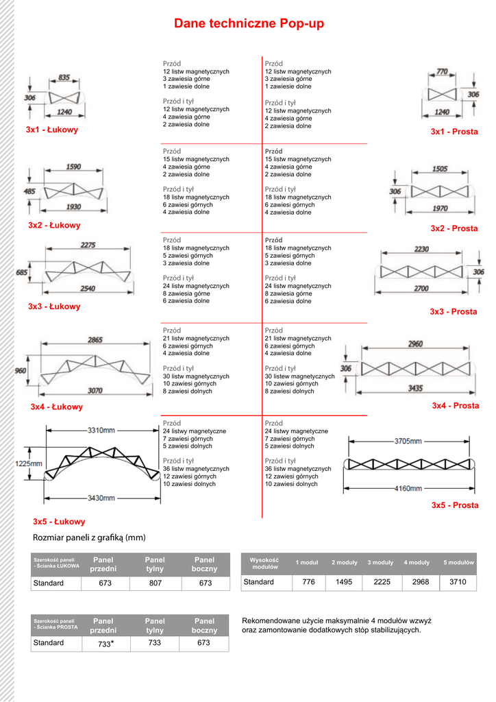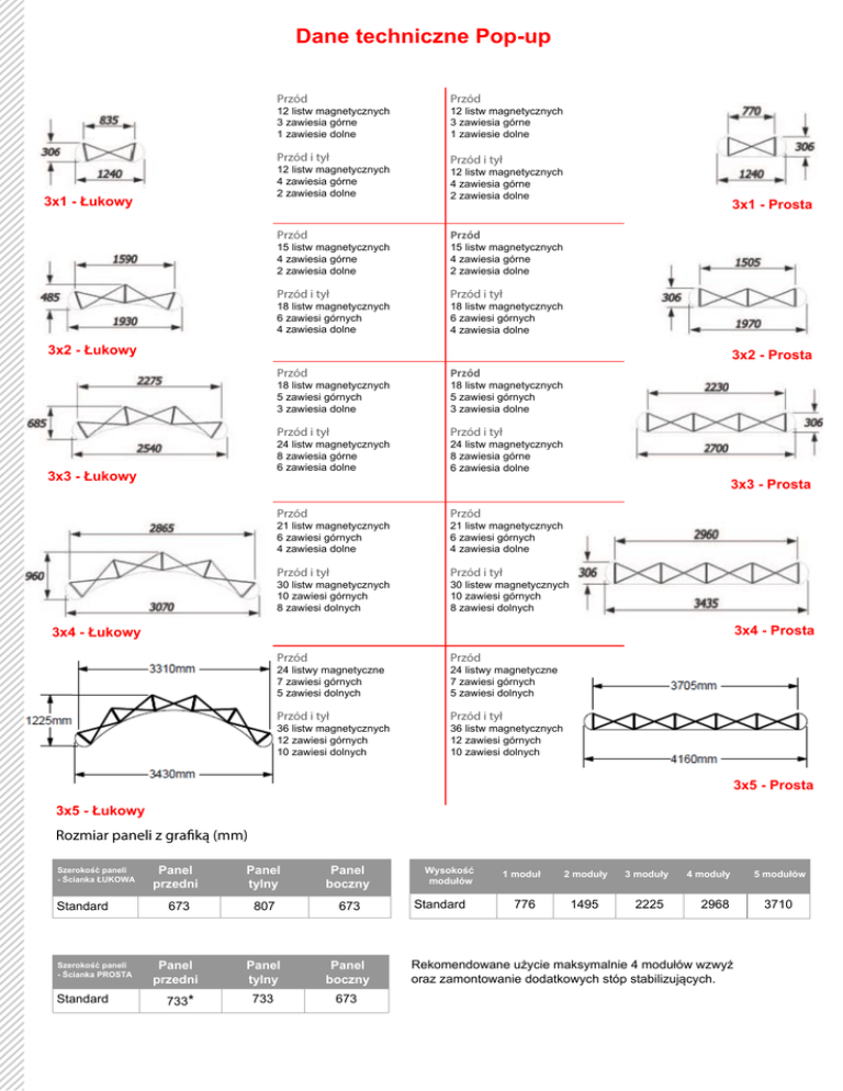 Dane techniczne Pop-up Przód Przód Przód i tył Przód i tył 12 listw magnetycznych 3 zawiesia górne 1 zawiesie dolne 12 listw magnetycznych 4 zawiesia górne 2 zawiesia dolne 3x1 - Łukowy 12 listw magnetycznych 3 zawiesia górne 1 zawiesie dolne 12 listw magnetycznych 4 zawiesia górne 2 zawiesia dolne Przód Przód Przód i tył Przód i tył Przód Przód Przód i tył Przód i tył 15 listw magnetycznych 4 zawiesia górne 2 zawiesia dolne 18 listw magnetycznych 6 zawiesi górnych 4 zawiesia dolne 3x1 - Prosta 15 listw magnetycznych 4 zawiesia górne 2 zawiesia dolne 18 listw magnetycznych 6 zawiesi górnych 4 zawiesia dolne 3x2 - Łukowy 3x2 - Prosta 18 listw magnetycznych 5 zawiesi górnych 3 zawiesia dolne 24 listw magnetycznych 8 zawiesia górne 6 zawiesia dolne 3x3 - Łukowy 18 listw magnetycznych 5 zawiesi górnych 3 zawiesia dolne 24 listw magnetycznych 8 zawiesia górne 6 zawiesia dolne 3x3 - Prosta Przód Przód 21 listw magnetycznych 6 zawiesi górnych 4 zawiesia dolne 21 listw magnetycznych 6 zawiesi górnych 4 zawiesia dolne Przód i tył Przód i tył 30 listw magnetycznych 10 zawiesi górnych 8 zawiesi dolnych 30 listew magnetycznych 10 zawiesi górnych 8 zawiesi dolnych 3x4 - Prosta 3x4 - Łukowy Przód Przód Przód i tył Przód i tył 24 listwy magnetyczne 7 zawiesi górnych 5 zawiesi dolnych 36 listw magnetycznych 12 zawiesi górnych 10 zawiesi dolnych 24 listwy magnetyczne 7 zawiesi górnych 5 zawiesi dolnych 36 listw magnetycznych 12 zawiesi górnych 10 zawiesi dolnych 3x5 - Prosta 3x5 - Łukowy Rozmiar paneli z grafiką (mm) Szerokość paneli - Ścianka ŁUKOWA Standard Szerokość paneli - Ścianka PROSTA Standard Panel przedni Panel tylny Panel boczny 673 807 673 Panel przedni Panel tylny Panel boczny 733 673 733* Wysokość modułów Standard 1 moduł 776 2 moduły 3 moduły 1495 2225 4 moduły 2968 Rekomendowane użycie maksymalnie 4 modułów wzwyż oraz zamontowanie dodatkowych stóp stabilizujących. 5 modułów 3710