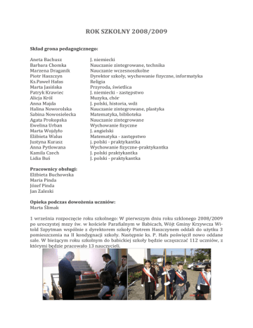 ROK SZKOLNY 2008/2009 Skład grona pedagogicznego: Aneta Bachusz Barbara Chomka Marzena Draganik Piotr Haszczyn Ks.Paweł Hałas Marta Jasińska Patryk Krawiec Alicja Król Anna Majda Halina Noworolska Sabina Nowosielecka Agata Prokopska Ewelina Urban Marta Wojdyło Elżbieta Walus Justyna Kurasz Anna Pytlowana Kamila Czech Lidia Buś J. niemiecki Nauczanie zintegrowane, technika Nauczanie wczesnoszkolne Dyrektor szkoły, wychowanie fizyczne, informatyka Religia Przyroda, świetlica J. niemiecki - zastępstwo Muzyka, chór J. polski, historia, wdż Nauczanie zintegrowane, plastyka Matematyka, biblioteka Nauczanie zintegrowane Wychowanie fizyczne J. angielski Matematyka - zastępstwo j. polski - praktykantka Wychowanie fizyczne-praktykantka J. polski praktykantka J. polski - praktykantka Pracownicy obsługi: Elżbieta Buchowska Maria Pinda Józef Pinda Jan Zaleski Opieka podczas dowożenia uczniów: Marta Ślimak 1 września rozpoczęcie roku szkolnego: W pierwszym dniu roku szklonego 2008/2009 po uroczystej mszy św. w kościele Parafialnym w Babicach, Wójt Gminy Krzywcza Witold Szpytman wspólnie z dyrektorem szkoły Piotrem Haszczynem oddali do użytku 3 pomieszczenia na II kondygnacji szkoły. Następnie ks. P. Hałs poświęcił nowo oddane sale. W bieżącym roku szkolnym do babickiej szkoły będzie uczęszczać 112 uczniów, z którymi będzie pracowało 13 nauczycieli. W dniach 3 – 5 września uczniowie naszej szkoły wzięli udział w Misjach, które odbyły się w parafii z okazji 500 lecia jej istnienia. Uczniowie wysłuchali nauk rekolekcyjnych oraz brali udział w naukach śpiewu. W dniu 13 września (sobota) w szkole odbyły się zajęcia; ze względu na odrabianie dnia 10 XI. W tym też dniu przypadała 69 rocznica bitwy o Krzywczę. Z tego względu panowie z Przemyskiej Grupy Rekonstrukcji Wydarzeń Historycznych przedstawili mundury w jakich walczyli Polacy z Niemcami, a p. Mirosław Majakowski prezes grupy, przedstawił szlak bojowy 11 Karpackiej Dywizji Piechoty pod dowództwem gen. Prugara – Ketlinga i przebieg bitwy o Krzywczę. Panowie odpowiedzieli również na liczne pytania uczniów. Dlaczego to robimy? Żeby oddać hołd wszystkim żołnierzom, którzy brali udział w walkach o wolną Polskę. 13 września po informacjach w prasie o groźbach pod adresem prof. Franka Wilczka w związku z otwarciem laboratorium w Szwajcarii otrzymaliśmy list od żony Franka Betsy: Proszę się niepokoić o Franka. Jest dokładnie jedna zwariowana osoba, która pisze grożące listy do Franka, ale on mieszka bardzo daleko od nas i policja ma go na oku. Ten człowiek jest pod nadzorem policji, żeby nie zrobił czegoś złego. To dostało się do wiadomości, ponieważ Frank wspomniał o tym do przyjaciela, który bardzo głupio opowiedział gazecie dużo więcej przerażającą wersję historii, robiąc wydźwięk, jak gdyby wielu ludzi wysyłało groźby. Często myślimy o tobie i Babicach. Nie zapomniałam o twoim życzeniu, by zobaczyć zdjęcie Franka grającego w szachy, ale on zawsze gra z komputerem zamiast na szachownicy, która jest bardziej fotogeniczna. Jesteśmy w tej chwili w Nowym Jorku, ponieważ wydawca Franka promuje jego nową książkę pt. Lekkości Bycia. Jest to zajęcie bardzo przyjemne, ale pracochłonne. Najcieplejszy życzenia dla ciebie i twojej szkoły, Betsy 4 września odbyła się szkolna wywiadówka. Na spotkaniu ogólnym obecnych było 53 rodziców, co stanowi 73%. Dyrektor szkoły przedstawił Plan Pracy Szkoły na rok 2008/2009 oraz w sprawach bieżących przedstawił stan organizacji świetlicy szkolnej. Opiekunka Rady Rodziców p. B. Chomka przedstawiał preliminarz wydatków RR na rok szkolny. Informujemy, że składka na Radę Rodziców wynosi w bieżącym roku szkolnym 4 zł od rodziny (na miesiąc). Wychowawcy klas zapoznali rodziców z wymaganiami edukacyjnymi, Szkolnym Systemem Oceniania oraz zatwierdzali Klasowe Plany Wychowawcze. 18 września uczennice klasy VI brały udział w lekcji nauki pływania pod kierunkiem p. Eweliny Urban na pływalni w Przemyślu. Lekcje będą prowadzone raz w miesiącu w ramach zajęć rekreacyjno - sportowych. 26 września w ramach zajęć świetlicowych odbyło się spotkanie z absolwentką naszej szkoły P. JOANNĄ ZALESKĄ, która z grupą przyjaciół odbyła podróż do Azji samochodem marki "Nysa". Podróżniczka opowiedziała o niezwykłych wydarzeniach i przygodach podczas podróży np; jak natknęli się na rosyjskie czołgi jadące na Gruzję. Dodatkową atrakcją były zdjęcia wyświetlane podczas opowieści. 9 października odbył się w naszej szkole konkurs pt. "Ochrona środowiska a zdrowie człowieka". W konkursie wzięło udział 5 uczniów. Najlepsze wyniki uzyskali: Maciej Krzywiński – 24 punkty, Szpiech Kamila - 21 punkty, Rafał Osypanka – 20 punkty. Wyżej wymienieni uczniowie kwalifikują się do następnego etapu no kursu. Konkurs przeprowadziła i nadzorowała p. Marta Jasińska. 6 października Justyna Durys brała udział w wojewódzkich zawodach lekkoatletycznych w Rzeszowie. Uczennica kl.V uzyskała bardzo dobry rezultat rzucając piłeczką palantową 36,5 m. Opiekę nad zawodniczką sprawowała p. E.Urban. 6 października szkoła wzbogaciła się o sprzęt sportowy 6 piłek, koszulki treningowe oraz 50 szt. oznaczników boiskowych, dzięki zaangażowaniu p. E. Urban, która zakupiła wymieniony sprzęt w Anglii za kwotę 200 zł z funduszy szkoły. 3 października biblioteka szkolna wzbogaciła się o 60 książek uzyskanych od Fundacji Pomocy Bibliotekom Polskim z Warszawy. Duże zasługi w pozyskaniu książek ma p. Andrzej Sikorski, który w Warszawie odebrał książki i wysłał do naszej szkoły. 1 października drużyna chłopców w składzie: D.Beer, M.Bugiel, M.Krzywiński, S.Pempek, P.Przepaśniak, K.Wilczek, S.Piekarz, P.Szpiech, F.Chruścicki, J.Ślimak brała udział w Turnieju Piłki Nożnej w Przemyślu z okazji 100 lecia powstania Miejskiego Klubu