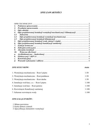 SPIS ZAWARTOŚCI OPIS TECHNICZNY ............................................................................................................. 2 1. Podstawa opracowania ................................................................................................... 2 2. Przedmiot opracowania .................................................................................................. 2 3. Opis obiektu .................................................................................................................... 2 4. Opis projektowanej instalacji wentylacji mechanicznej i klimatyzacji ......................... 2 4.1 Założenia ..................................................................................................................... 2 4.2 Opis projektowanej instalacji wentylacji mechanicznej ............................................ 3 4.3 Opis projektowanej instalacji klimatyzacji ................................................................ 4 5. Opis projektowanej instalacji wody zimnej i ciepłej ...................................................... 4 6. Opis projektowanej instalacji kanalizacji sanitarnej .................................................... 4 7. Izolacje termiczne ........................................................................................................... 5 8. Zabezpieczenia p.poż. ..................................................................................................... 5 9. Akustyka instalacji ......................................................................................................... 5 10. Wytyczne dla branż ..................................................................................................... 5 a. Architektoniczno – budowlanej...................................................................................... 5 b. Elektrycznej i AKP iA ..................................................................................................... 6 c. Konstrukcyjnej ................................................................................................................ 6 d. Warunki wykonania i odbioru ....................................................................................... 6 SPIS RYSUNKÓW: skala 1. Wentylacja mechaniczna – Rzut I piętra 1:50 2. Wentylacja mechaniczna – Rzut poddasza 1:50 3. Wentylacja mechaniczna – Rzut dachu 1:50 4. Instalacja wod-kan, c.o. – Rzut I piętra 1:100 5. Instalacja wod-kan – Rzut parteru 1:100 6. Rozwinięcie Kanalizacji sanitarnej 1:100 7. Schemat rozwinięcia wody 1:100 SPIS ZAŁĄCZNIKÓW: 1. Bilans powietrza 2. Karta doboru centrali 3. Specyfikacja elementów wentylacji 1 OPIS TECHNICZNY do projektu instalacji sanitarnych oraz wentylacji mechanicznej i klimatyzacji w Centrum Dyspozytorskim mieszczącym się na 1 piętrze w budynku Wojewódzkiej Stacji Pogotowia Ratunkowego i Transportu Sanitarnego „MEDITRANS” w Warszawie ul. Poznańska 22/Hoża56. 1. Podstawa opracowania - Umowa; - Uzgodnienia z Zamawiającym; - Projekt Technologiczny 2. Przedmiot opracowania Przedmiotem opracowania są instalacje sanitarne oraz wentylacja mechaniczna i klimatyzacja w Centrum Dyspozytorskim mieszczącym się na 1 piętrze w budynku Wojewódzkiej Stacji Pogotowia Ratunkowego i Transportu Sanitarnego „MEDITRANS” w Warszawie ul. Poznańska 22/Hoża56. 3. Opis obiektu Budynek znajduje się w Warszawie przy ul. Poznańskiej 22 róg ul. Hożej. W istniejącym budynku znajduje się Stacja Pogotowia Ratunkowego. Budynek posiada 4 kondygnacje z piwnicą. Budynek zbudowany jest w technologii tradycyjnej. 4. Opis projektowanej instalacji wentylacji mechanicznej i klimatyzacji 4.1 Założenia Dla potrzeb wentylacji przyjęto następujące założenia: w pomieszczeniu dyspozytorium przyjęto 50 m3/h na osobę (stale przebywa 18 osób) w pozostałych pomieszczeniach przyjęto następującą krotność wymian powietrza: - szatnia - 4 wymiany w ciągu godziny - komunikacja - 1,5 wymiany w ciągu godziny - pozostałe pomieszczenia - 2 wymiany w ciągu godziny Temperatura nawiewu 18oC 2 Przyjęte parametry powietrza zewnętrznego: lato temperatura t= 32˚C wilgotność względna φ =45% zima temperatura t= -20˚C wilgotność względna φ =90% Parametry powietrza wewnętrznego: lato temperatura t= 24˚C wilgotność względna φ min=70% zima temperatura t= 22˚C wilgotność względna φ min=60% 4.2 Opis projektowanej instalacji wentylacji mechanicznej Instalacja obsługuje pomieszczenia na kondygnacji +1, wchodzących w skład centrum dyspozytorskiego. Rdzeniem układu jest centrala wentylacyjna nawiewno-wywiewna z odzyskiem ciepła w postaci wymiennika krzyżowego. Centrala jest ponadto wyposażona w nagrzewnicę elektryczną, chłodnicę freonową, nawilżacz parowy, a także filtry powietrza. Centrala zlokalizowana jest na poddaszu budynku. Szafa automatyki zamontowana zostanie w pobliżu centrali, na poddaszu. Instalacja N (nawiew) – Instalację zrealizowano za pomocą sieci kanałów blaszanych ze stali ocynkowanej ułożonych w przestrzeni stropu podwieszonego, oraz częściowo w obudowie z płyt gipsowo-kartonowych w pomieszczeniach. We wszystkich pomieszczeniach nawiew zrealizowano za pomocą anemostatów sufitowych ze skrzynką rozprężną i przepustnicami regulacyjnymi. Regulację instalacji należy wykonać na nawiewnikach, oraz za pomocą przepustnic regulacyjnych na odgałęzieniach instalacji. Instalacja W (wywiew) – Instalację zrealizowano za pomocą sieci kanałów blaszanych ze stali ocynkowanej ułożonych w przestrzeni stropu podwieszonego, oraz częściowo w obudowie z płyt gipsowo-kartonowych w pomieszczeniach. W pomieszczeniu dyspozytorium wywiew zrealizowano poprzez usuwanie powietrza z przestrzeni stropu podwieszonego, zaopatrzonego w kratki transferowe. W pozostałych pomieszczeniach wywiew zrealizowano za pomocą anemostatów sufitowych ze skrzynką rozprężną i przepustnicami regulacyjnymi. Regulację instala