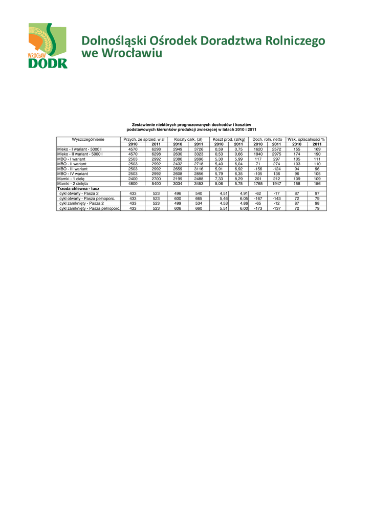 Dolnośląski Ośrodek Doradztwa Rolniczego we Wrocławiu Zestawienie niektórych prognozowanych dochodów i kosztów podstawowych kierunków produkcji zwierzęcej w latach 2010 i 2011 Wyszczególnienie Mleko - I wariant - 5000 l Mleko - II wariant - 5000 l MBO - I wariant MBO - II wariant MBO - III wariant MBO - IV wariant Mamki - 1 cielę Mamki - 2 cielęta Trzoda chlewna - tucz cykl otwarty - Pasza 2 cykl otwarty - Pasza pełnoporc. cykl zamknięty - Pasza 2 cykl zamknięty - Pasza pełnoporc. Przych. ze sprzed. w zł 2010 2011 4570 6298 4570 6298 2503 2992 2503 2992 2503 2992 2503 2992 2400 2700 4800 5400 433 433 433 433 523 523 523 523 Koszty całk. (zł) 2010 2011 2949 3726 2630 3323 2386 2696 2432 2718 2659 3116 2608 2856 2199 2488 3034 3453 496 600 499 606 540 665 534 660 Koszt prod. (zł/kg) 2010 2011 0,59 0,75 0,53 0,66 5,30 5,99 5,40 6,04 5,91 6,92 5,79 6,35 7,33 8,29 5,06 5,75 4,51 5,46 4,53 5,51 4,91 6,05 4,86 6,00 Doch. roln. netto 2010 2011 1620 2572 1940 2975 117 297 71 274 -156 -124 -105 136 201 212 1765 1947 -62 -167 -65 -173 -17 -143 -12 -137 Wsk. opłacalności % 2010 2011 155 169 174 190 105 111 103 110 94 96 96 105 109 109 158 156 87 72 87 72 97 79 98 79