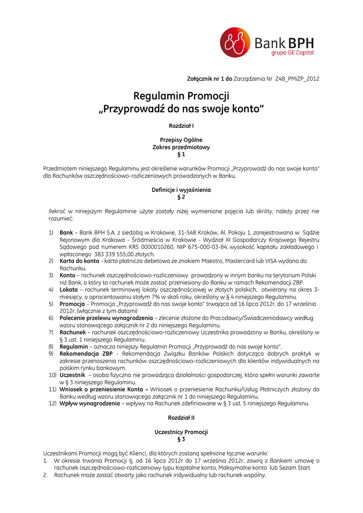 Załącznik nr 1 do Zarządzenia Nr Z48_PMiZP_2012 Regulamin Promocji „Przyprowadź do nas swoje konto” Rozdział I Przepisy Ogólne Zakres przedmiotowy §1 Przedmiotem niniejszego Regulaminu jest określenie warunków Promocji „Przyprowadź do nas swoje konto” dla Rachunków oszczędnościowo-rozliczeniowych prowadzonych w Banku. Definicje i wyjaśnienia §2 Ilekroć w niniejszym Regulaminie użyte zostały niżej wymienione pojęcia lub skróty, należy przez nie rozumieć: 1) Bank – Bank BPH S.A. z siedzibą w Krakowie, 31-548 Kraków, Al. Pokoju 1, zarejestrowana w Sądzie Rejonowym dla Krakowa - Śródmieścia w Krakowie - Wydział XI Gospodarczy Krajowego Rejestru Sądowego pod numerem KRS 0000010260, NIP 675-000-03-84, wysokość kapitału zakładowego i wpłaconego 383 339 555,00 złotych. 2) Karta do konta - karta płatnicza debetowa ze znakiem Maestro, Mastercard lub VISA wydana do Rachunku. 3) Konto – rachunek oszczędnościowo-rozliczeniowy prowadzony w innym banku na terytorium Polski niż Bank, a który to rachunek może zostać przeniesiony do Banku w ramach Rekomendacji ZBP. 4) Lokata – rachunek terminowej lokaty oszczędnościowej w złotych polskich, otwierany na okres 3miesięcy, o oprocentowaniu stałym 7% w skali roku, określony w § 4 niniejszego Regulaminu. 5) Promocja – Promocja „Przyprowadź do nas swoje konto” trwająca od 16 lipca 2012r. do 17 września 2012r. (włącznie z tym datami) 6) Polecenie przelewu wynagrodzenia – zlecenie złożone do Pracodawcy/Świadczeniodawcy według wzoru stanowiącego załącznik nr 2 do niniejszego Regulaminu. 7) Rachunek – rachunek oszczędnościowo-rozliczeniowy Uczestnika prowadzony w Banku, określony w § 3 ust. 1 niniejszego Regulaminu. 8) Regulamin – oznacza niniejszy Regulamin Promocji „Przyprowadź do nas swoje konto”. 9) Rekomendacja ZBP - Rekomendacja Związku Banków Polskich dotycząca dobrych praktyk w zakresie przenoszenia rachunków oszczędnościowo-rozliczeniowych dla klientów indywidualnych na polskim rynku bankowym. 10) Uczestnik – osoba fizyczna nie prowadząca działalności gospodarczej, która spełni warunki zawarte w § 3 niniejszego Regulaminu. 11) Wniosek o przeniesienie Konta – Wniosek o przeniesienie Rachunku/Usług Płatniczych złożony do Banku według wzoru stanowiącego załącznik nr 1 do niniejszego Regulaminu. 12) Wpływ wynagrodzenia – wpływy na Rachunek zdefiniowane w § 3 ust. 5 niniejszego Regulaminu. Rozdział II Uczestnicy Promocji §3 Uczestnikami Promocji mogą być Klienci, dla których zostaną spełnione łącznie warunki: 1. W okresie trwania Promocji tj. od 16 lipca 2012r do 17 września 2012r. zawrą z Bankiem umowę o rachunek oszczędnościowo-rozliczeniowy typu Kapitalne konto, Maksymalne konto lub Sezam Start 2. Rachunek może zostać otwarty jako rachunek indywidualny lub rachunek wspólny. 3. 4. 5. 6. 7. W dniu otwarcia Rachunku zostanie złożony w Banku Wniosek o przeniesienie Konta z innego banku w ramach Rekomendacji ZBP. Wraz z Wnioskiem o przeniesienie Konta, o którym mowa w ust.3 powyżej zostanie złożone w Banku Polecenie przelewu wynagrodzenia na nowo otwarty Rachunek. Rachunek określony w ust. 1 niniejszego paragrafu zostanie zasilony środkami w dowolnej wysokości z co najmniej jednego z następujących tytułów: a) umowy o pracę lub b) umowy zlecenia, umowy o dzieło, lub c) kontraktu managerskiego, lub d) emerytury, lub e) renty, lub f) świadczenia z Zakładu Ubezpieczeń Społecznych , lub g) premii lub nagrody wypłaconej przez zakład pracy Uczestnika, Zasilenie Rachunku, z tytułu wskazanego w pkt 5 powyżej, nastąpi w okresie trwania Promocji. W okresie trwania Promocji zawrą z Bankiem umowę o Kartę do konta, wydawaną do Rachunku określonego w ust.1 powyżej. Zasady Promocji §4 1. 2. 3. 4. 5. Niniejsza Promocja polega na oferowaniu przez Bank Uczestnikowi możliwości zawarcia umowy o Lokatę pod warunkiem uprzedniego łącznego spełnienia przez Uczestnika warunków określonych w § 3 niniejszego Regulaminu oraz posiadania przez niego Rachunku w chwili zawarcia umowy o tę Lokatę. Z zastrzeżeniem ust. 1, powyżej, umowę o Lokatę Uczestnik może zawrzeć z Bankiem jedynie w okresie od 16 sierpnia 2012r do 17 października 2012r i jedynie w oddziałach własnych Banku (w agencjach uniwersalnych ani placówkach partnerskich Banku nie ma możliwości zawarcia umowy o promocyjną Lokatę). Informacja na temat oddziałów własnych Banku dostępna jest w każdym oddziale własnym, agencji uniwersalnej lub placówce partnerskiej Banku oraz na stronie internetowej www.bph.pl. Maksymalna kwota środków możliwych do zdeponowania na Lokacie to 40.000,00 zł (czterdzieści tysięcy złotych). Minimalna kwota środków możliwych do zdeponowania na Lokacie to 5.000,00 zł (pięć tysięcy złotych). Środki na Lokacie oprocentowane są według stawki stałej 7% w skali roku. Lokata i jest prowadzona w złotych polskich, odsetki są naliczane na koniec okresu umownego prowadzenia Lokaty. Zasady prowadzenia Lokaty określa „Umowa terminowej lokaty oszczędnościowej”, „Regulamin rachunków terminowych lokat oszczędnościowych” oraz „Taryfa opłat i prowizji Banku BPH SA dla Klientów Indywidualnych”. Wzory tych dokumentów są dostępne w oddziałach własnych Banku oraz na stronie internetowej www.bph.pl. Lokata jest nieodnawialna. Każdy z Uczestników Promocji może zawrzeć z Bankiem tylko jedną umowę Lokaty. Dla Uczestników będących współposiadaczami Rachunku istnieje możliwość otwarcia tylko 1 (jednej) Lokaty w ramach niniejszej Promocji. . Reklamacje §5 1. 2. 3. Reklamacje związane z Ofertą Specjalną mogą być składane: a) pocztą na adres korespondencyjny: 80-868 Gdańsk, ul. Marynarki Polskiej 177, b) telefonicznie, faksem lub pocztą elektroniczną (dane kontaktowe dostępne na stronie internetowej: www.bph.pl), c) w placówkach Banku w formie pisemnej. Reklamacje powi