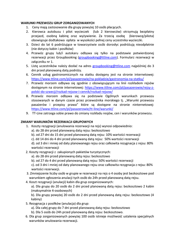 WARUNKI PRZEWOZU GRUP ZORGANIZOWANYCH 1. Ceny mają zastosowanie dla grupy powyżej 10 osób płacących. 2. Kierowca autobusu i pilot wycieczek (lub 2 kierowców) otrzymują bezpłatny przejazd, osobną kabinę oraz wyżywienie. Za trzecią osobę (kierowcę/pilota) obowiązuje dodtakowa opłata w wysokości pełnej ceny uczestnika wycieczki. 3. Dzieci do lat 6 podróżujące w towarzystwie osób dorosłyc podróżują nieodpłatnie (nie dotyczy kabin i posiłków) 4. Przewóz grupy lub/i autokaru odbywa się tylko na podstawie potwierdzonej rezerwacji przez Groupbooking ([email protected]). Formularz rezerwacji w załączniku nr 1. 5. Listę uczestników należy dosłać na adres [email protected] najpóźniej do 3 dni przed planowaną datą podróży. 6. Cennik usług gastronomicznych na statku dostępny jest na stronie internetowej: https://www.ttline.com/pl/pasazerowie/na-pokladzie/gastronomia-na-statku/ 7. Przewóz morzem odbywa się zgodnie z obowiązującym na linii rozkładem rejsów dostępnym na stronie internetowej: https://www.ttline.com/pl/pasazerowie/rejsy-zpolski-do-szwecji/rozkad-rejsow-i-cennik/rozkad-rejsow/ 8. Przewóz morzem odbywa się na podstawie Ogólnych warunkach przewozu stosowanych w danym czasie przez przewoźnika morskiego tj. „Warunki przewozu pasażerów i przepisy prawa” które są dostępne na stronie ninternetowej: https://www.ttline.com/pl/pasazerowie/tt-line/warunki/ 9. TT-Line zatrzega sobie prawo do zmiany rozkładu resjów, cen i warunków przewozu. ZMIANY WARUNKÓW REZERWACJI GRUPOWYCH 1. Koszty rezygnacji (anulowania rezerwacji na rejs) wynosi odpowiednio: a). do 28 dni przed planowaną datą rejsu: bezkosztowo b). od 27 dni do 15 dni przed planowaną datą rejsu: 10% wartości rezerwacji c). dd 14 dni do 4 dni przed planowaną datą rejsu: 50% wartości rezerwacji d). od 3 dni i mniej od daty planowanego rejsu oraz całkowita rezygnacja z rejsu: 80% wartości rezerwacji 2. Koszty rezygnacji z zakupionych pakietów turystycznych: a). do 28 dni przed planowaną datą rejsu: bezkosztowo b). od 27 do 4 dni przed planowaną datą rejsu: 50% wartości rezerwacji c). od 3 dni i mniej od daty planowanego rejsu oraz całkowita rezygnacja z rejsu: 80% wartości rezerwacji. 3. Zmniejszenie liczby osób w grupie w rezerwacji na rejs o 4 osoby jest bezkosztowe pod warunkiem zgłoszenia anulacji tych osób do 24h przed planowaną datą rejsu. 4. Koszt rezygnacji (anulacji) kabin dla grup zorganizowanych: a). Dla grupy do 20 osób do 2 dni przed planowaną datą rejsu: bezkosztowo 2 kabin (maksymalnie 4-osobowych) b). Dla grupy powyżej 20 osób do 2 dni przed planowaną datą rejsu: bezkosztowo (4 kabiny) 5. Rezygnacja z posiłków (anulacja) dla grup: a). Dla całej grupy do 7 dni przed planowaną datą rejsu: bezkosztowo b). Dla 5 osób do 24h przed planowaną datą rejsu: bezkosztowo. 6. Dla grup zorganizowanych powyżej 100 osób istnieje możliwość ustalenia specjalnych warunków anulowania rezerwacji.