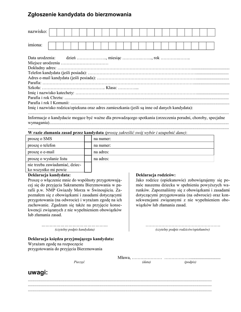Zgłoszenie kandydata do bierzmowania nazwisko: imiona: Data urodzenia: dzień …………….….., miesiąc ………….…….., rok ………….…….. Miejsce urodzenia …………………………… Dokładny adres: …………………………………………………………………………………................................... Telefon kandydata (jeśli posiada): ………………………………………………………………….............................. Adres e-mail kandydata (jeśli posiada): …………………………………………………………….............................. Parafia: ……………………………………………………………………………………………................................. Szkoła: …………………………………….. Klasa: …………... Imię i nazwisko katechety: ………………………………………………………………………….............................. Parafia i rok Chrztu: ........................................................................................................................................................ Parafia i rok I Komunii: ................................................................................................................................................... Imię i nazwisko rodzica/opiekuna oraz adres zamieszkania (jeśli są inne od danych kandydata): .......................................................................................................................................................................................... Informacje o kandydacie mogące być ważne dla prowadzącego spotkania (orzeczenia poradni, choroby, specjalne wymagania)...................................................................................................................................................................... .......................................................................................................................................................................................... W razie złamania zasad przez kandydata (proszę zakreślić swój wybór i uzupełnić dane): proszę o SMS na numer: proszę o telefon na numer: proszę o e-mail na adres: proszę o wysłanie listu na adres: nie trzeba zawiadamiać, dziecko wszystko mi powie Deklaracja kandydata: Proszę o włączenie mnie do wspólnoty przygotowującej się do przyjęcia Sakramentu Bierzmowania w parafii p.w. NMP Gwiazdy Morza w Świnoujściu. Zapoznałem się z obowiązkami i zasadami dotyczącymi przygotowania (na odwrocie) i wyrażam zgodę na ich zachowanie. Zgadzam się także na przyjęcie konsekwencji związanych z nie wypełnieniem obowiązków lub złamania zasad. Deklaracja rodziców: Jako rodzice (opiekunowie) zobowiązujemy się pomóc naszemu dziecku w spełnieniu powyższych warunków. Zapoznaliśmy się z obowiązkami i zasadami dotyczącymi przygotowania (na odwrocie) oraz konsekwencjami związanymi z nie wypełnieniem obowiązków lub złamania zasad. ……………………………………………. ……………………………………………. (czytelny podpis kandydata) (czytelny podpis rodziców/opiekunów) Deklaracja księdza przyjmującego kandydata: Wyrażam zgodę na rozpoczęcie przygotowania do przyjęcia Bierzmowania Mława, ………………… ………………............................ Pieczęć (data) (podpis) uwagi: .......................................................................................................................................................................... .......................................................................................................................................................................... .......................................................................................................................................................................... PRZYGOTOWANIE do bierzmowania Obowiązki i zasady Bierzmowanie może przyjąć osoba wierząca, ochrzczona, praktykująca systematycznie wiarę (niedzielna Msza Święta, rekolekcje, spowiedź, Komunia Święta, codzienna modlitwa), żyjąca w zgodzie z zasadami moralności chrześcijańskiej, biorąca udział w spotkaniach przygotowujących do udzielenia tego sakramentu. Brak któregokolwiek z tych warunków powoduje odłożenie przyjęcia sakramentu do czasu osiągnięcia należytej dojrzałości. Kandydat do bierzmowania przyjmuje następujące obowiązki i zasady: 1. Systematyczny i zaangażowany udział w szkolnej katechezie (dotyczy uczniów). Katecheta wyraża zgodę na przyjęcie bierzmowania przez kandydata. Brak zgody oznacza przełożenie przygotowania na kolejny rok. 2. Świadectwo chrześcijańskiego życia. Dotyczy to nie tylko Parafii, ale także rodziny, szkoły i innych miejsc. Brak właściwego świadectwa oznacza przełożenie przygotowania na kolejny rok. 3. Systematyczny i zaangażowany udział w spotkaniach dla kandydatów. Dwukrotna nieusprawiedliwiona nieobecność na spotkaniach powoduje przełożenie przygotowania na kolejny rok. Ewentualne nieobecności należy usprawiedliwiać (na formularzach znajdujących się w materiałach dla kandydata lub według tego wzoru) w ciągu siedmiu następujących po spotkaniu dni. Usprawiedliwienie podpisuje kandydat i rodzic (opiekun) składający podpis na niniejszym dokumencie. Usprawiedliwienia można składać w kancelarii lub zakrystii na ręce jakiegokolwiek księdza. W razie niepokonalnych trudności w czasowym złożeniu usprawiedliwienia należy informować o tym telefonicznie, jeśli trzeba nagrywając się na pocztę głosową. 4. Kandydat zachowujący się nieodpowiednio na spotkaniu (np.: rozmowy, śmiechy, przepychania, przeszkadzanie innym, niewykonywanie poleceń prowadzącego) może zostać wyproszony. Sytuację taką traktuje się jako nieobecność na spotkaniu bez możliwości uspraw