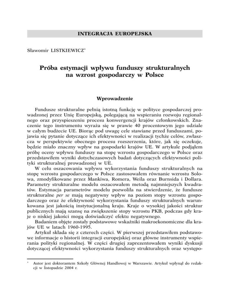 INTEGRACJA EUROPEJSKA S∏awomir LISTKIEWICZ* Próba estymacji wp∏ywu funduszy strukturalnych na wzrost gospodarczy w Polsce Wprowadzenie Fundusze strukturalne pe∏nià istotnà funkcj´ w polityce gospodarczej prowadzonej przez Uni´ Europejskà, polegajàcà na wspieraniu rozwoju regionalnego oraz przyspieszeniu procesu konwergencji krajów cz∏onkowskich. Znaczenie tego instrumentu wyra˝a si´ w prawie 40 procentowym jego udziale w ca∏ym bud˝ecie UE. Bioràc pod uwag´ cele stawiane przed funduszami, pojawia si´ pytanie dotyczàce ich efektywnoÊci w realizacji tych˝e celów, zw∏aszcza w perspektywie obecnego procesu rozszerzenia, które, jak si´ oczekuje, b´dzie mia∏o znaczny wp∏yw na gospodarki krajów UE. W artykule podjà∏em prób´ oceny wp∏ywu funduszy na stop´ wzrostu gospodarczego w Polsce oraz przedstawi∏em wyniki dotychczasowych badaƒ dotyczàcych efektywnoÊci polityki strukturalnej prowadzonej w UE. W celu oszacowania wp∏ywu wykorzystania funduszy strukturalnych na stop´ wzrostu gospodarczego w Polsce zastosowa∏em równanie wzrostu Solowa, zmodyfikowane przez Mankiwa, Romera, Weila oraz Burnsida i Dollara. Parametry strukturalne modelu oszacowa∏em metodà najmniejszych kwadratów. Estymacja parametrów modelu pozwoli∏a na stwierdzenie, ˝e fundusze strukturalne per se majà negatywny wp∏yw na poziom stopy wzrostu gospodarczego oraz ˝e efektywnoÊç wykorzystania funduszy strukturalnych warunkowana jest jakoÊcià instytucjonalnà kraju. Kraje o wysokiej jakoÊci struktur publicznych majà szans´ na zwi´kszenie stopy wzrostu PKB, podczas gdy kraje o niskiej jakoÊci mogà doÊwiadczyç efektu negatywnego. Badaniem obj´te zosta∏y podstawowe wskaêniki makroekonomiczne dla krajów UE w latach 1960-1995. Artyku∏ sk∏ada si´ z czterech cz´Êci. W pierwszej przedstawi∏em podstawowe informacje o historii integracji europejskiej oraz g∏ówne instrumenty wspierania polityki regionalnej. W cz´Êci drugiej zaprezentowa∏em wyniki dyskusji dotyczàcej efektywnoÊci wykorzystania funduszy strukturalnych oraz wyst´po* Autor jest doktorantem Szko∏y G∏ównej Handlowej w Warszawie. Artyku∏ wp∏ynà∏ do redakcji w listopadzie 2004 r. 124 GOSPODARKA NARODOWA Nr 1-2/2005 wania efektu konwergencji w krajach UE. Cz´Êç trzecia zawiera wyniki badania stopy wzrostu gospodarczego Polski, dokonanego w oparciu o zmodyfikowany model wzrostu Solowa, uwzgl´dniajàcy korzystanie z funduszy strukturalnych. W cz´Êci ostatniej dokona∏em podsumowania oraz sformu∏owa∏em sugestie odnoÊnie po˝àdanych kierunków wykorzystywania funduszy strukturalnych w pierwszych latach cz∏onkostwa Polski w UE. Zarys historyczny integracji europejskiej oraz zasady polityki strukturalnej Koncepcja integracji europejskiej Poczàtek integracji europejskiej datowany jest na rok 1951, kiedy Belgia, Niemcy Zachodnie, Luksemburg, Francja, W∏ochy oraz Holandia utworzy∏y Europejskà Wspólnot´ W´gla i Stali. W roku 1967 powo∏ano Komisj´ Europejskà, Rad´ Europejskà oraz Parlament Europejski. Nast´pnie w roku 1992 podj´to decyzj´ o rozpocz´ciu integracji politycznej, której istotà jest obj´cie wspólnym ustaleniom znacznej iloÊci obszarów ˝ycia spo∏eczeƒstw wspólnot europejskich. Aktualnie finalizowany proces rozszerzenia rozpoczà∏ si´ w roku 1988, w momencie podpisania pierwszego uk∏adu w sprawie handlu i wspó∏pracy z W´grami [Boldrin, Canova, 2003]. 1 maja 2004 r. do UE przystàpi∏y Cypr, Czechy, Estonia, W´gry, Litwa, ¸otwa, Malta, Polska, S∏owacja i S∏owenia (tzw. grupa Luksemburska). Polityka strukturalna Do roku 1974 polityka regionalna EWG zmierzajàca do ∏agodzenia ró˝nic w rozwoju gospodarczym regionów (konwergencji) prowadzona by∏a na niewielkà skal´. G∏ównym argumentem za zintensyfikowaniem dzia∏aƒ by∏o utrzymywanie si´ znacznych rozpi´toÊci (dywergencji) w poziomie rozwoju gospodarczego mi´dzy poszczególnymi regionami, które w trakcie procesów integracji ulega∏y dalszemu zwi´kszaniu. Podstawowymi narz´dziami realizowania polityki strukturalnej w okresie programowym 2000-2006 sà Europejski Fundusz Rozwoju Regionalnego, Europejski Fundusz Spo∏eczny, Sekcja Orientacji Europejskiego Funduszu Orientacji i Gwarancji Rolnej, Finansowy Instrument Wspierania Rolnictwa (fundusze strukturalne) oraz utworzony w 1993 r. na mocy postanowieƒ traktatu z Maastricht fundusz spójnoÊci [Jankowska i in., 2003], [EC, 1999]. Poza funduszami strukturalnymi i spójnoÊci Êrodki na rozwój desygnowane sà tak˝e przez EBI, EBOR, MBOR i inne mi´dzynarodowe organizacje finansowe. Podstawowymi obszarami interwencji sà ochrona Êrodowiska oraz infrastruktura transportowa (g∏ównie sieç transeuropejska). S∏awomir Listkiewicz, Próba estymacji wp∏ywu funduszy strukturalnych na wzrost... 125 Dotychczasowe wyniki badaƒ dotyczàcych efektywnoÊci wykorzystania funduszy strukturalnych w krajach UE Zjawisko konwergencji w teorii ekonomii W teorii wzrostu gospodarczego wykszta∏ci∏y si´ dwa podstawowe nurty dotyczàce zjawiska konwergencji. Pierwszy neoklasyczny, potwierdzajàcy konwergencj´, reprezentowany g∏ównie przez [Solowa, 1956] i jego nast´pców, opiera si´ na twierdzeniu, ˝e gospodarki otwarte dà˝à do wyrównywania poziomów rozwoju gospodarczego. Konwergencj´ mo˝na obserwowaç na dwóch p∏aszczyznach [Islam, 1995]: – w zakresie poziomu dochodów – konwergencja absolutna; ten rodzaj konwergencji dotyczy tego samego stanu wzrostu równomiernego (ang. steady state); – w zakresie stopy wzrostu – warunkowa, dotyczy uzyskiwania ró˝nych poziomów dochodów per capita, przy takiej samej stopie wzrostu [Barro, 1991], [Mankiw, Romer, Weil, 1992]. W modelu Solowa zak∏ada si´, ˝e dynamika procesu konwergencji zale˝y od zmniejszajàcej si´ kraƒcowej stopy zwrotu z kapita∏u. W krajach rozwijajàcych si´ i otwierajàcych gospodarki, stopa zwrotu z inwestycji jest w