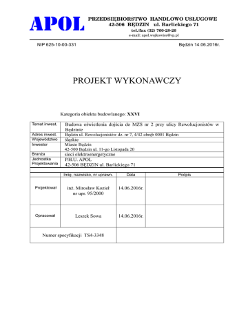 APOL PRZEDSIĘBIORSTWO HANDLOWO USŁUGOWE 42-506 BĘDZIN ul. Barlickiego 71 tel./fax (32) 760-28-26 e-mail: [email protected] NIP 625-10-00-331 Będzin 14.06.2016r. PROJEKT WYKONAWCZY Kategoria obiektu budowlanego: XXVI Temat inwest. Budowa oświetlenia dojścia do MZS nr 2 przy ulicy Rewolucjonistów w Będzinie Adres inwest. Województwo Inwestor Będzin ul. Rewolucjonistów dz. nr 7, 4/42 obręb 0001 Będzin Branża Jednostka Projektowania śląskie Miasto Będzin 42-500 Będzin ul. 11-go Listopada 20 sieci elektroenergetyczne P.H.U. APOL 42-506 BĘDZIN ul. Barlickiego 71 Imię, nazwisko, nr uprawn. Data Projektował inż. Mirosław Kozieł nr upr. 95/2000 14.06.2016r. Opracował Leszek Sowa 14.06.2016r. Numer specyfikacji TS4-3348 Podpis 2 ZAWARTOŚCI OPRACOWANIA 1. Strona tytułowa. 2. Oświadczenie. 3. Zawartość projektu. CZĘŚĆ PRAWNA 1. Warunki przyłączenia nr WP/030163/2016/O07R03 z dnia 12.05.2016r. 2. Uprawnienia projektanta. 3. Zaświadczenie Śląskiej Okręgowej Izby Inżynierów Budownictwa w Katowicach. PROJEKT WYKONAWCZY 1. Opis techniczny 2. Obliczenia techniczne 3. Zestawienie podstawowych materiałów SPIS RYSUNKÓW 1. Projekt zagospodarowania terenu skala 1:500 .......................................................................3348-W/E-01 2. Schemat – oświetlenie zewnętrzne ......................................................................................... 3348-W/E-02 3. Karty katalogowe słupa i oprawy 3 II. OPIS TECHNICZNY 1. Lokalizacja i stan prawny Przedmiotowa inwestycja będzie zlokalizowana w poboczu dojścia do Miejskiego Zespołu Szkół nr 2 przy ul. Rewolucjonistów w Będzinie. 2. Zakres opracowania. Niniejsze opracowanie obejmuje: - Budowę linii kablowej oświetlenia zewnętrznego dojścia do MZS nr 2 przy ul. Rewolucjonistów. - Budowa dwunastu słupów oświetlenia ulicznego w odcinku linii oświetleniowej j.w. 4. Charakterystyka stanu istniejącego Przedmiotowy teren na którym projektuje się budowę linii kablowej oświetlenia zewnętrznego jest terenem przeznaczonym pod zabudowę mieszkalną wielorodzinną. Na przedmiotowym terenie znajduję się także szkoła i parking. 4. Opis projektowanego zadania. Zgodnie z wydanymi warunkami przyłączenia przez TAURON-Dystrybucja S.A. Oddział w Będzinie oraz z ustaleniami z Inwestorem dla zapewnienia oświetlenia zewnętrznego dojścia do zepołu szkół przy ul. Rewolucjonistów projektuje się linię kablową oświetlenia zewnętrznego wraz ze słupami oświetleniowymi. 4.1 Projektowana linia kablowa. Dla zasilania oświetlenia dojazdu i alejki do MZS nr 2 przy ul. Rewolucjonistów projektuje się ułożenie linii kablowej wykonanej kablem ziemnym 1kV typu YAKXS 4 x 25mm2 o całkowitej długości 429,0m. Trasy projektowanej linii kablowej oświetlenia zewnętrznego przedstawiono na planie sytuacyjnym nr 3348/E-01. Wszelkie skrzyżowania projektowanej linii kablowej oświetlenia zewnętrznego z istniejącym uzbrojeniem podziemnym oraz wjazdami zabezpieczyć rurami ochronnymi z PVC DVK50 lub rurami ochronnymi przewiertowymi SRS50. 4.2 Projektowana słupy oświetlenia zewnętrznego. Jako konstrukcje wsporcze projektowanych punktów świetlnych projektuje się zastosowanie słupów stalowych malowanych proszkowo w kolorze papielatym typu S-40C o wysokości nadziemnej 4m. Słupy lokalizować tak jak na załączonym do projektu planie zagospodarowania. Słupy mocować do fundamentów prefabrykowanych typu F-75/200. Zasypując ziemię wokół fundamentu grunt odpowiednio zagęszczać. Dla podłączenia projektowanych kabli YAKXS 4 x 25mm2 i podłączenia przewodu zasilającego oprawę oświetleniową w słupach zastosowano tabliczki bezpiecznikowe typu PB-1 z wkładką bezpiecznikową o prądzie znamionowym 6A. Do podłączenia oprawy oświetleniowej z tabliczką TB-1 zastosowano przewód kabelkowy typu YDY 2 x 1,5mm 2 w izolacji 750V, w osłonie z rurki karbowanej o średnicy 15mm. Dla przewodu ochronnego wykonać uziemienia. Uziemienie wykonać bednarką stalową ocynkowaną Fe/Zn 30x4mm ułożoną w rowie kablowym 10cm poniżej podsypki piaskowej tj. na głębokości co najmniej 70cm. Jako punkty świetlne zaprojektowano oprawy oświetleniowe typu ELBA-01 70W wykonane w II klasie ochronności IP 65 mocowane na szczycie słupa. W oprawach instalować lampy sodowe typu SON 70W-E o mocy 70W i strumieniu 2923lm. 4.3 Podstawowe parametry projekt. linii oświetlenia zewnętrznego - typ zastosowanych kabli - długości linii kablowych - typ projekt. słupów ośw. - typ projekt. opraw ośw. - typu zastosowanych osłon dla kabli - ochrona przeciwporażeniowa - YAKXS 4 x 25mm2 - 367m - słupy stalowy malowany proszkowo typu S-40C - ELBA-01 70W - rury DVK 50, SRS50 AROT - TN-C 5. Ochrona przeciwporażeniowa i przeciwprzepięciowa. 4 W istniejącej sieci oświetlenia zastosowany jest układ ochrony p. porażeniowej typu TN-C. Projektowane urządzenia posiadają drugą klasę z wyjątkiem słupów stalowych. Zaprojektowane urządzenia elektroenergetyczne niskiego napięcia nie wymagają zastosowania ochrony przeciwporażeniowej drugiego stopnia. 6. Wytyczne realizacji. Przed przystąpieniem do prac należy powiadomić właścicieli terenu o terminie przystąpienia do robót. Odległości kabli od innych urządzeń podziemnych winny spełniać wymogi obowiązującej normy. Projektowane kable oświetlenia zewnętrznego przy wszelkich skrzyżowaniach i zbliżeniach do istniejących sieci podziemnych winny być zabezpieczone rurami ochronnymi typu DVK AROT i SRS AROT. Projektowane kable ułożyć we wspólnym wykopie na minimalnej głębokościach 0,5m. Kable ułożyć linią falistą z 3% zapasem. Grubość podsypki i nasypki piaskowej winna być zgodna z obowiązującą normą tj. minimum po 10cm. Należy pozostawić zapasy kabli w pobliżu: słupów oświetleniowych i szafki oświetleniowej nN 2,5m. W długości kabla ujęto zapasy. Trasę kabla, na całej długości należy oznaczyć folią koloru