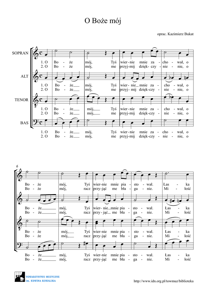 O Boże mój oprac. Kazimierz Bukat SOPRAN ° &c œ 1. O 2. O &c œ ALT 1. O 2. O TENOR BAS ° ˙ & 6 ¢ ¢ & ‹ Bo ? że że mój, mój, œ œ œ œ Bo Bo ˙ - że że œ œ Bo Bo - że że 1. O 2. O Bo Bo - że że ?c œ ˙ œ œ œ œ ˙ mój, mój, œœœœ ˙ ˙ - że Bo - że ˙ - ˙ 2. O Bo - że Bo - że ˙ Bo Bo ˙ &c œ ‹ 1. O Bo - że Bo - że & ˙ ˙ mój, mój, mój, mój, Œ œ ˙ mój, mój, mój, mój, mnie za - cho dzięk - czy - nie - œ œœ œ œ Tyś wier - nie mnie za me przyj - mij dzięk - czy - œœœ Œ œ mój, mój, œ œœ ˙ œ œ Tyś wier - nie me przyj - mij mój, mój, Œ œ œ œ œ œ œ œ mnie za - cho dzięk - czy - nie - œ œœ œ œ œ Œ Tyś wier - nie mnie pia - sto - wał. racz przy - jąć me bła - ga - nie. Œ œ œ œœœ œ ˙ Tyś wier - nie mnie pia - sto racz przy - jąć me bła - ga - œ œ Tyś wier - nie mnie pia racz przy - jąć me bła - Œ #œ œ œ œ bœ œ Tyś wier - nie me przyj - mij œ œ œ œ œ Œ wał. nie. œ œ œ Œ sto - wał. ga - nie. ˙ Tyś wier - nie mnie pia - sto racz przy - jąć me bła - ga - œ Œ wał. nie. wał, o nie, o cho - wał, o nie - nie, o mnie za dzięk - czy - œ œ œ œ œ bœ œ nœ Tyś wier - nie me przyj - mij Œ œ œœœ Œ œ œœ œ ˙ œœœœ Bo - że Bo - że ˙ Œ œ œ cho - wał, o nie - nie, o ˙ œ œ wał, o nie, o ˙™ Łas Mi œ - ka łość œ #œ nœ œ Łas Mi - ka łość Łas Mi - ka łość Łas Mi - ka łość œ œ œ œ œ œ œ œ http://www.idn.org.pl/towmuz/biblioteka ° ˙™ œ & œ œ œ 2 11 œ Two - ja mnie o Two - ja mnie pro - œ œ œ Œ ˙ ta - cza - ła, wa - dzi - ła, j œ & œ ™ #œ œ œ œ œ œ Two - ja mnie o Two - ja mnie pro - ¢ œ ? - œ œ œ ˙™ Two - ja mnie o Two - ja mnie pro ° & œ ™ œJ œ œ 17 wa mi - ła, bym - ła, bo - ˙ & ‹ ¢ ˙ wa mi ? ˙ - wa - mi - ła, bym - ła, bo œ œ - - ła, bym ła, bo œ ˙ - cza - ła, wa - dzi - ła, mi łas - łość ka ta - cza - ła, wa - dzi - ła, mi łas - łość ka œ œ Œ ˙ œ œ ła, bym ła, bo ˙ ce o - grze mnie na - kar - œ œ œ œ ˙™ łość ka ˙ - œ œ ˙ - ˙ ser - ce o - grze Twa mnie na - kar - ser Twa - ˙ ce o - grze mnie na - kar - œ Œ œ œ œ œ ˙ #œ #œ ˙ nœ œ œ # œ n œ œ œ œ œ ˙ pra - wy źród - łem pra źród - ser Twa mi łas pra - wy źród - łem ˙ łość ka œ ˙ œ Œ œ œ œ œ œ œ œ œ #˙ ˙™ œ był, sił bym Tyś j ™ œ & #œ œ nœ œ œ œ œ œ ˙ ™ wa mi - ˙™ ta - cza - ła, wa - dzi - ła, œ œ œ œ œ œ œ & œ ‹ Two - ja mnie o - ta Two - ja mnie pro ˙ mi łas ˙ był, sił œ bym Tyś œ œ œ œœœ œ wy łem był, sił ˙™ œ œ œ œ pra - wy źród - łem był, sił bym Tyś ˙ ser - ce o - grze Twa mnie na - kar - ˙ ˙™ do - bry zaw - sze był. był, Twa więc œ œ œ œ œ œ #œ#œ œ œ do - bry zaw - sze ˙ ˙ do - bry zaw - sze œœ œ œ ˙ bym Tyś œ do - bry zaw - sze był. był, ˙™ Twa więc Œ był. był, ˙™ Œ był. był, http://www.idn.org.pl/towmuz/biblioteka ° œ & œ & œ #œ 22 3 rę - ka racz mi mnie bro si - ły œ rę - ka racz mi & Œ ‹ ? ¢ Œ ° ˙ & mnie si - œ œ Twa więc œ Twa więc 25 - ła, dać, Twe bym nœ nœ œ œ œ œ ła, dać, Twe bym bro ły - ni do - ˙ rę - ka bro - ni racz si - ły do œ œ rę - ka bro - ni racz si - ły do - ła, dać, œ œ ˙ po w bu wszy & œ œ œ œ ‰ cho ? œ kry cho - œ - ła, dać, œ œ œ J J ło wać & ˙ ‹ kry œ - - - œ ni do œ œ J J œ œ - kry cho - kry - cho ¢ ˙ œ œ ło wać œ ło wać po œ w bu wszy po œ - ‰ œ #œ ˙ ło wać po w bu wszy œ w bu wszy - œ Twe bym œ Twe bym - œ œ - - - œ œ skrzy - dło wier - ność œ #œ skrzy - dło wier - ność œ œ mnie mógł o za œ œ œ skrzy - dło wier - ność œ œ œ skrzy - dło wier - ność o za œ œ mnie mógł o za mnie mógł ˙ ˙™ rzy stek czas. czas. œ œ œ œ œ rzy stek czas. czas. - rzy stek czas. czas. ˙ - - #œ o za - ˙™ - œ œ œ mnie mógł œ - ˙™ ˙™ rzy stek czas. czas. http://www.idn.org.pl/towmuz/biblioteka