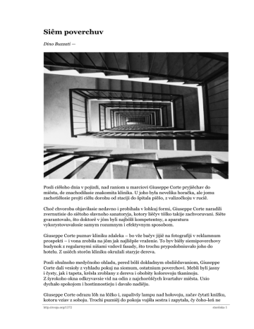 Siêm poverchuv Dino Buzzati — Posli ciêłoho dnia v pojizdi, nad raniom u marciovi Giuseppe Corte pryjiêchav do miêsta, de znachodiłasie znakomita klinika. U joho była nevelika horačka, ale jomu zachotiêłosie projti ciêłu dorohu od staciji do špitala piêšo, z valizočkoju v ruciê. Choč chvoroba objaviłasie nedavno i probihała v lohkuj formi, Giuseppe Corte naradili zvernutisie do siêtoho słavnoho sanatoryja, kotory liêčyv tôlko takije zachvoruvani. Siête gvarantovało, što doktorê v jôm byli najbôlš kompetentny, a aparatura vykorystovuvałosie samym rozumnym i efektyvnym sposobom. Giuseppe Corte puznav kliniku zdaleka – bo vže bačyv jijiê na fotografiji v reklamnum prospekti – i vona zrobiła na jôm jak najliêpše vraženie. To byv biêły siemipoverchovy budynok z regularnymi nišami vzdovž fasady, što trochu prypodobniuvało joho do hotelu. Z usiêch storôn kliniku okružali staryje dereva. Posli ohulnoho medyčnoho ohladu, pered bôlš dokładnym obsliêduvaniom, Giuseppe Corte dali vesioły z vyhladu pokuj na siomum, ostatnium poverchovi. Mebli byli jasny i čysty, jak i tapeta, krêsła zroblany z dereva i obobity kolorovoju tkaninoju. Z šyrokoho okna odkryvavsie vid na odin z najchorôščych kvartałuv miêsta. Usio dychało spokojom i hostinnostieju i davało nadiêju. Giuseppe Corte odrazu lôh na łôžko i, zapalivšy lampu nad hołovoju, začav čytati knižku, kotoru vziav z soboju. Trochi puzniêj do pokoja vujšła sestra i zapytała, čy čoho-leń ne http://svoja.org/1372 storônka 1 Dino Buzzati — Siêm poverchuv treba. Giuseppe Corte ničoho ne potrebovav, ale vôn ochôtno vstupiv u rozhovôr z diêvčynoju, rozpytujučy jijiê pro kliniku. Tak vôn doznavsie pro odnu osoblivosť siêtoho špitala. Chvorych ode rozdilali po poverchach stosôvno do tiažkosti chvoroby. Siomy byv dla samych lohkich prypadkuv. Na šostum byli tože ne tiažki, ale vže takije, na kotory treba było miêti oko. Na pjatum liêčyli vže považno obnedužałych, i tak daliêj, z povercha na poverch. Na druhum byli najpovažniêj chvory. Na peršum tyje, dla kotorych ne było žadnoji nadiêji. Siêta osobliva systema ne tôlko značno oblohčała obsłuhovuvanie, ale i stvorała na kažnum poverchovi odnorôdny obstaviny, vyłučajučy vypadki, koli lohko chvorych mohli b nepokojiti susiêdy v agoniji. Z druhoho boku vona davała možlivosť najlepi rozpodiliti sposoby liêčby. U vyniku chvory byli podiêlany na siêm hierarchičnych grup. Kažny poverch ujavlav soboju jakby osôbny mały sviêt zo svojimi spicijalnymi praviłami i svojimi osoblivymi tradycijami. I pokôlko kažny oddiêł miêv svoho hołôvnoho doktora, siête spryčyniało choč i małyje, ale vyrazny raznici v metodach liêčby, ale generalny dyrektor nadavav siêtuj lečêbnuj instytuciji odin osnôvny kirunok. Koli sestra vyjšła, Giuseppe Corte, odčuvajučy, što temperatura vpała, pudyjšov do okna i vyhlanuv na dvôr, ne tomu, kob polubovatisie panoramoju neznakomoho miêsta, a v nadiêji zobačyti čerez šyby chvorych z nižšych poverchuv. Struktura budynku, z velikimi nišami, davała takuju možlivosť dla observatora. Pered usiêm Giuseppe Corte skupiv uvahu na oknach peršoho poverchu, kotory byli najdaliêj i na kotory možna było podivitisie tôlko skosom. Ale vôn ne zobačyv ničoho cikavoho. Bôlšosť z jich była ščêlno zatiahnuta šarymi roletami. I tut Corte zavvažyv, što v okniê susiêdnioho pokoja pokazavsie jakiś čołoviêk. Obadva dovhi čas pryhladalisie do sebe z štoraz bôlšoju sympatyjoju, ale ne viêdali, jak perełomati movčanie. Nakuneć Giuseppe Corte zobravsie z odvahoju i skazav: – Viête tut tože nedavno? – O niê, – odkazav čołoviêk, – ja tut uže dva miseciê... – Vôn pomovčav, ne viêdajučy, jak prodovžyti rozhovôr, potum dodav: – Same vyhladaju svoho brata. – Vašoho brata? – Tak, – skazav neznakomy. – My pryjiêchali siudy v toj samy deń, jak siête ne divno, ale jomu ciêły čas pohôršuvałosie, i vôn uže na četvertum. – Na jakôm četvertum? – Na četvertum poverchovi, – potłumačyv toj z vyrazom takoho spuvčutia i žachu na tvarovi, što Giuseppe Corte až pochołodiêv. – Nevže na četvertum poverchovi takije tiažko chvory? – zapytavsie vôn ostorôžno. – Môj Bože, – čołôviêk pomału pochitav hołovoju. – Vony tam šče ne beznadiêjny, ale siodno radosti mało. http://svoja.org/1372 storônka 2 Dino Buzzati — Siêm poverchuv – Ale koli na četvertum takije tiažko chvory, – povtoryv Corte z žartôvnoju neprymušanostieju, z jakoju lude hovorat pro tragičny rečy, kotory jich ne dotyčat, – to koho kładut na peršum? – Och, na peršum tôlko smertelniki. Tam nanizi doktoram nema čoho robiti. Tam robota tôlko dla sviaščennika. I, naturalno... – Ale na peršum poverchovi nemnôho chvorych, – perebiv Giuseppe Corte, jak buďto chotiêv otrymati pudtverdženie, – bo tam čuť ne vsiê pokoji zamknuty. – Teper mało, ale rano jich byłô mnôho, – odkazav neznakomy z utłoju vsmiêškoju. – De opuščany rolety, tam chtoś tôlko što vmer. Ne bačyte, što na inšych poverchach vsiê rolety pudniaty? Vy mniê probačte, – dodav vôn, pomału odstupajučysie od okna, – zdajetsie, što chołodniêje. Ja vernusie na łôžko. Usioho dobroho... Čołoviêk znik z projomu okna, vono energično začyniłosie, potum u seredini pokoja zapaliłosie sviêtło. Giuseppe Corte daliêj stojav neruchomo koło okna, pilno divlačysie na opuščany rolety peršoho poverchu. Divivsie neodryvno, z chvoroblivoju napruhoju, starajučysie proniknuti dumkoju v sekrety siêtoho strašnoho peršoho poverchu, kudy chvorych zsyłajut umirati; podumavšy, nakôlko vôn od siêtoho daleko, odčuv pudjôm nastroju. Tymčasom na miêsto opustivsie večêrni zmrok. Odno za odnym rozsviêčuvalisie sotni okon sanatoryja, zdaleka joho možna było pryniati 
