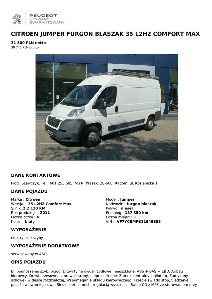 CITROEN JUMPER FURGON BLASZAK 35 L2H2 COMFORT MAX 31 500 PLN netto 38 745 PLN brutto DANE KONTAKTOWE Piotr, Szewczyk, Tel.: 601 255 685, M.i R. Prasek, 26-600, Radom, ul. Kozienicka 1 DANE POJAZDU Marka : Citroen Wersja : 35 L2H2 Comfort Max Silnik :2.2 120 KM Rok produkcji : 2011 Liczba drzwi : 4 Kolor : biały Model : Jumper Nadwozie : furgon blaszak Paliwo : diesel Przebieg : 187 350 km Liczba miejsc : 3 VIN : VF7YCBMFB11949853 WYPOSAŻENIE elektryczne szyby WYPOSAŻENIE DODATKOWE serwisowany w ASO OPIS POJAZDU El. podnoszenie szyb, przód, Drzwi tylne dwuskrzydłowe, nieoszklone, ABS + BAS + EBD, Airbag kierowcy, Drzwi przesuwne z prawej strony, nieprzeszklone, Zamek centralny z pilotem, Zamykany schowek w desce rozdzielczej, Wspomaganie układu kierowniczego, Trzecie światło stop, Siedzenie pasażera dwumiejscowe, Siedz. kier. z mech. regulacją wysokości, Radio CD z MP3 ze sterowaniem przy kierownicy, Obrotomierz, Komputer pokładowy, Mech. regulacja położenia kierownicy, Klimatyzacja, Instalacja radiowa, Immobilizer, Gniazdo 12V, Drabinka oraz profesjonalny bagażnik dachowy Pierwszy właściciel, Pojazd regularnie serwisowany QR CODE DLA OGŁOSZENIA W SERWISIE UZYWANYGWARANTOWANY.PL Powered by TCPDF (www.tcpdf.org)