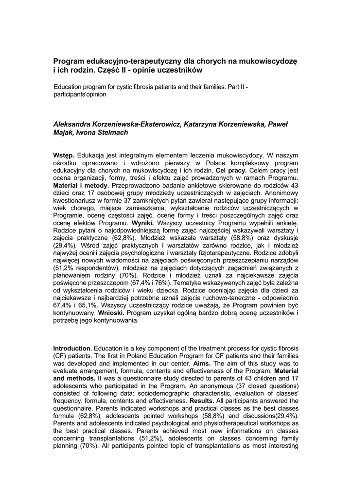 Program edukacyjno-terapeutyczny dla chorych na mukowiscydozę i ich rodzin. Część II - opinie uczestników Education program for cystic fibrosis patients and their families. Part II participants'opinion Aleksandra Korzeniewska-Eksterowicz, Katarzyna Korzeniewska, Paweł Majak, Iwona Stelmach Wstęp. Edukacja jest integralnym elementem leczenia mukowiscydozy. W naszym ośrodku opracowano i wdrożono pierwszy w Polsce kompleksowy program edukacyjny dla chorych na mukowiscydozę i ich rodzin. Cel pracy. Celem pracy jest ocena organizacji, formy, treści i efektu zajęć prowadzonych w ramach Programu. Materiał i metody. Przeprowadzono badanie ankietowe skierowane do rodziców 43 dzieci oraz 17 osobowej grupy młodzieży uczestniczących w zajęciach. Anonimowy kwestionariusz w formie 37 zamkniętych pytań zawierał następujące grupy informacji: wiek chorego, miejsce zamieszkania, wykształcenie rodziców uczestniczących w Programie, ocenę częstości zajęć, ocenę formy i treści poszczególnych zajęć oraz ocenę efektów Programu. Wyniki. Wszyscy uczestnicy Programu wypełnili ankietę. Rodzice pytani o najodpowiedniejszą formę zajęć najczęściej wskazywali warsztaty i zajęcia praktyczne (62,8%). Młodzież wskazała warsztaty (58,8%) oraz dyskusje (29,4%). Wśród zajęć praktycznych i warsztatów zarówno rodzice, jak i młodzież najwyżej ocenili zajęcia psychologiczne i warsztaty fizjoterapeutyczne. Rodzice zdobyli najwięcej nowych wiadomości na zajęciach poświęconych przeszczepianiu narządów (51,2% respondentów), młodzież na zajęciach dotyczących zagadnień związanych z planowaniem rodziny (70%). Rodzice i młodzież uznali za najciekawsze zajęcia poświęcone przeszczepom (67,4% i 76%). Tematyka wskazywanych zajęć była zależna od wykształcenia rodziców i wieku dziecka. Rodzice oceniając zajęcia dla dzieci za najciekawsze i najbardziej potrzebne uznali zajęcia ruchowo-taneczne - odpowiednio 67,4% i 65,1%. Wszyscy uczestniczący rodzice uważają, że Program powinien być kontynuowany. Wnioski. Program uzyskał ogólną bardzo dobrą ocenę uczestników i potrzebę jego kontynuowania. Introduction. Education is a key component of the treatment process for cystic fibrosis (CF) patients. The first in Poland Education Program for CF patients and their families was developed and implemented in our center. Aims. The aim of this study was to evaluate arrangement, formula, contents and effectiveness of the Program. Material and methods. It was a questionnaire study directed to parents of 43 children and 17 adolescents who participated in the Program. An anonymous (37 closed questions) consisted of following data: sociodemographic characteristic, evaluation of classes' frequency, formula, contents and effectiveness. Results. All participants answered the questionnaire. Parents indicated workshops and practical classes as the best classes formula (62,8%); adolescents pointed workshops (58,8%) and discussions(29,4%). Parents and adolescents indicated psychological and physiotherapeutical workshops as the best practical classes. Parents achieved most new informations on classes concerning transplantations (51,2%), adolescents on classes concerning family planning (70%). All participants pointed topic of transplantations as most interesting (parents - 67,4%, adolescents -76%). Pointed topice were depended on child s age and level of parents education. Parents indicated dance classes as most interesting (67,4%) and most needed (65,1%) classes for children. All participants pointed the need of Program continuation. Conclusions. Program was evaluated as very good. Indicated need of Program continuation showed the demand on education for CF patients and their families.