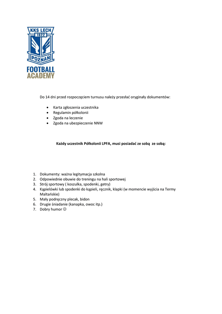 Do 14 dni przed rozpoczęciem turnusu należy przesład oryginały dokumentów: Karta zgłoszenia uczestnika Regulamin półkolonii Zgoda na leczenie Zgoda na ubezpieczenie NNW Każdy uczestnik Półkolonii LPFA, musi posiadad ze sobą ze sobą: 1. 2. 3. 4. Dokumenty: ważna legitymacja szkolna Odpowiednie obuwie do treningu na hali sportowej Strój sportowy ( koszulka, spodenki, getry) Kąpielówki lub spodenki do kąpieli, ręcznik, klapki (w momencie wyjścia na Termy Maltaoskie) 5. Mały podręczny plecak, bidon 6. Drugie śniadanie (kanapka, owoc itp.) 7. Dobry humor