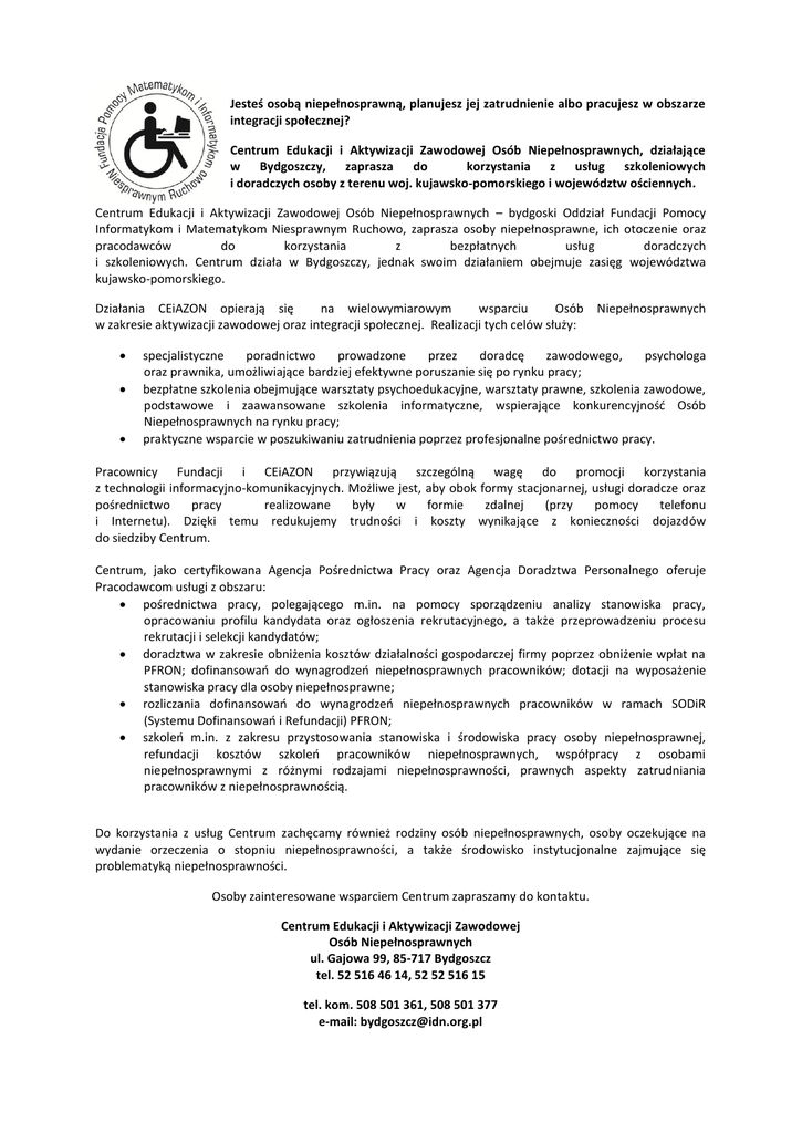 Jesteś osobą niepełnosprawną, planujesz jej zatrudnienie albo pracujesz w obszarze integracji społecznej? Centrum Edukacji i Aktywizacji Zawodowej Osób Niepełnosprawnych, działające w Bydgoszczy, zaprasza do korzystania z usług szkoleniowych i doradczych osoby z terenu woj. kujawsko-pomorskiego i województw ościennych. Centrum Edukacji i Aktywizacji Zawodowej Osób Niepełnosprawnych – bydgoski Oddział Fundacji Pomocy Informatykom i Matematykom Niesprawnym Ruchowo, zaprasza osoby niepełnosprawne, ich otoczenie oraz pracodawców do korzystania z bezpłatnych usług doradczych i szkoleniowych. Centrum działa w Bydgoszczy, jednak swoim działaniem obejmuje zasięg województwa kujawsko-pomorskiego. Działania CEiAZON opierają się na wielowymiarowym wsparciu Osób w zakresie aktywizacji zawodowej oraz integracji społecznej. Realizacji tych celów służy: Niepełnosprawnych specjalistyczne poradnictwo prowadzone przez doradcę zawodowego, psychologa oraz prawnika, umożliwiające bardziej efektywne poruszanie się po rynku pracy; bezpłatne szkolenia obejmujące warsztaty psychoedukacyjne, warsztaty prawne, szkolenia zawodowe, podstawowe i zaawansowane szkolenia informatyczne, wspierające konkurencyjność Osób Niepełnosprawnych na rynku pracy; praktyczne wsparcie w poszukiwaniu zatrudnienia poprzez profesjonalne pośrednictwo pracy. Pracownicy Fundacji i CEiAZON przywiązują szczególną wagę do promocji korzystania z technologii informacyjno-komunikacyjnych. Możliwe jest, aby obok formy stacjonarnej, usługi doradcze oraz pośrednictwo pracy realizowane były w formie zdalnej (przy pomocy telefonu i Internetu). Dzięki temu redukujemy trudności i koszty wynikające z konieczności dojazdów do siedziby Centrum. Centrum, jako certyfikowana Agencja Pośrednictwa Pracy oraz Agencja Doradztwa Personalnego oferuje Pracodawcom usługi z obszaru: pośrednictwa pracy, polegającego m.in. na pomocy sporządzeniu analizy stanowiska pracy, opracowaniu profilu kandydata oraz ogłoszenia rekrutacyjnego, a także przeprowadzeniu procesu rekrutacji i selekcji kandydatów; doradztwa w zakresie obniżenia kosztów działalności gospodarczej firmy poprzez obniżenie wpłat na PFRON; dofinansowań do wynagrodzeń niepełnosprawnych pracowników; dotacji na wyposażenie stanowiska pracy dla osoby niepełnosprawne; rozliczania dofinansowań do wynagrodzeń niepełnosprawnych pracowników w ramach SODiR (Systemu Dofinansowań i Refundacji) PFRON; szkoleń m.in. z zakresu przystosowania stanowiska i środowiska pracy osoby niepełnosprawnej, refundacji kosztów szkoleń pracowników niepełnosprawnych, współpracy z osobami niepełnosprawnymi z różnymi rodzajami niepełnosprawności, prawnych aspekty zatrudniania pracowników z niepełnosprawnością. Do korzystania z usług Centrum zachęcamy również rodziny osób niepełnosprawnych, osoby oczekujące na wydanie orzeczenia o stopniu niepełnosprawności, a także środowisko instytucjonalne zajmujące się problematyką niepełnosprawności. Osoby zainteresowane wsparciem Centrum zapraszamy do kontaktu. Centrum Edukacji i Aktywizacji Zawodowej Osób Niepełnosprawnych ul. Gajowa 99, 85-717 Bydgoszcz tel. 52 516 46 14, 52 52 516 15 tel. kom. 508 501 361, 508 501 377 e-mail: [email protected]