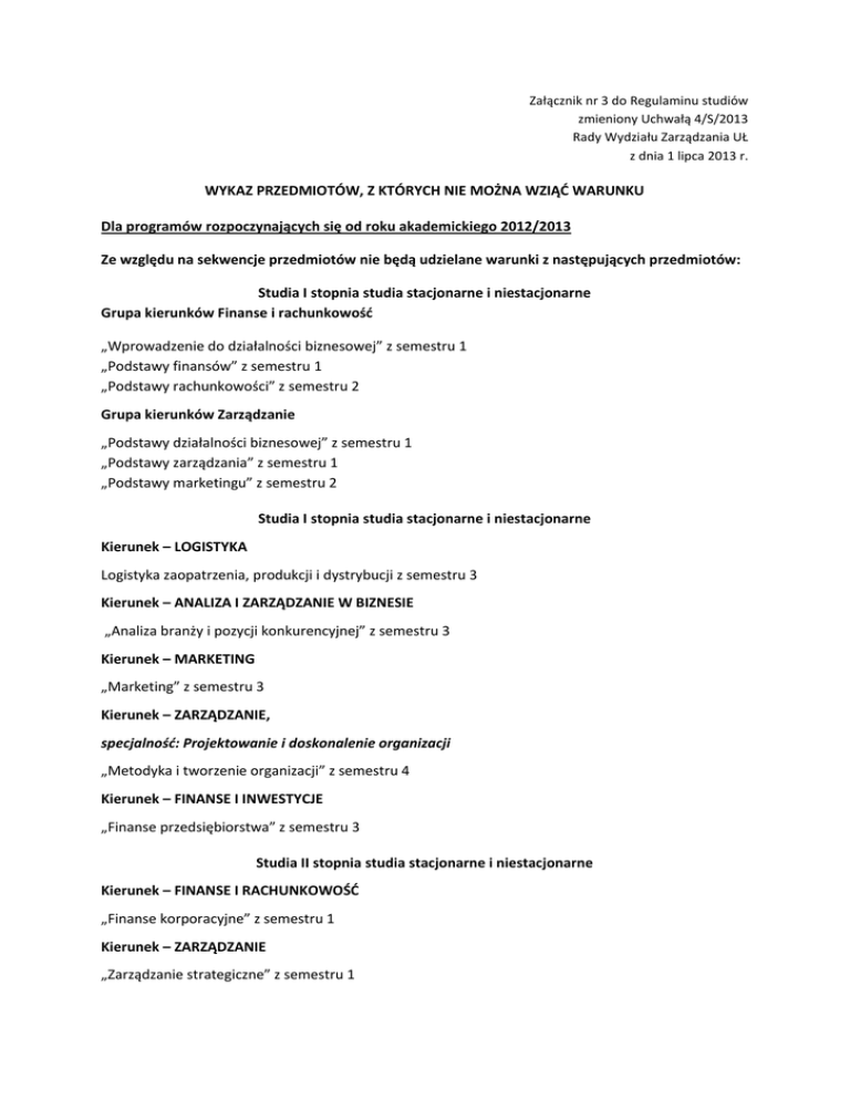 Załącznik nr 3 do Regulaminu studiów zmieniony Uchwałą 4/S/2013 Rady Wydziału Zarządzania UŁ z dnia 1 lipca 2013 r. WYKAZ PRZEDMIOTÓW, Z KTÓRYCH NIE MOŻNA WZIĄĆ WARUNKU Dla programów rozpoczynających się od roku akademickiego 2012/2013 Ze względu na sekwencje przedmiotów nie będą udzielane warunki z następujących przedmiotów: Studia I stopnia studia stacjonarne i niestacjonarne Grupa kierunków Finanse i rachunkowość „Wprowadzenie do działalności biznesowej” z semestru 1 „Podstawy finansów” z semestru 1 „Podstawy rachunkowości” z semestru 2 Grupa kierunków Zarządzanie „Podstawy działalności biznesowej” z semestru 1 „Podstawy zarządzania” z semestru 1 „Podstawy marketingu” z semestru 2 Studia I stopnia studia stacjonarne i niestacjonarne Kierunek – LOGISTYKA Logistyka zaopatrzenia, produkcji i dystrybucji z semestru 3 Kierunek – ANALIZA I ZARZĄDZANIE W BIZNESIE „Analiza branży i pozycji konkurencyjnej” z semestru 3 Kierunek – MARKETING „Marketing” z semestru 3 Kierunek – ZARZĄDZANIE, specjalność: Projektowanie i doskonalenie organizacji „Metodyka i tworzenie organizacji” z semestru 4 Kierunek – FINANSE I INWESTYCJE „Finanse przedsiębiorstwa” z semestru 3 Studia II stopnia studia stacjonarne i niestacjonarne Kierunek – FINANSE I RACHUNKOWOŚĆ „Finanse korporacyjne” z semestru 1 Kierunek – ZARZĄDZANIE „Zarządzanie strategiczne” z semestru 1