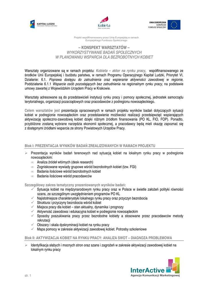 Projekt współfinansowany przez Unię Europejską w ramach Europejskiego Funduszu Społecznego – KONSPEKT WARSZTATÓW – WYKORZYSTYWANIE BADAŃ SPOŁECZNYCH W PLANOWANIU WSPARCIA DLA BEZROBOTNYCH KOBIET Warsztaty organizowane są w ramach projektu: Kobieta – aktor na rynku pracy, współfinansowanego ze środków Unii Europejskiej i budżetu państwa, w ramach Programu Operacyjnego Kapitał Ludzki, Priorytet VI, Działanie: 6.1. Poprawa dostępu do zatrudnienia oraz wspieranie aktywności zawodowej w regionie, Poddziałanie 6.1.1 Wsparcie osób pozostających bez zatrudnienia na regionalnym rynku pracy, na podstawie umowy zawartej z Wojewódzkim Urzędem Pracy w Krakowie. Warsztaty adresowane są do przedstawicieli instytucji rynku pracy i pomocy społecznej, jednostek samorządu terytorialnego, organizacji pozarządowych oraz pracodawców z podregionu nowosądeckiego. Celem warsztatów jest prezentacja opracowanych w ramach projektu wyników badań dotyczących sytuacji kobiet w podregionie nowosądeckim oraz przedstawienie możliwości realizacji przedsięwzięć wspierających aktywizację społeczno-zawodową kobiet dzięki różnym źródłom finansowania (PO KL, FIO, FOP). Ponadto, przybliżone zostaną wybrane narzędzia ekonomii społecznej, a pracodawcy będą mieli okazję zapoznać się z dostępnymi źródłami wsparcia ze strony Powiatowych Urzędów Pracy. Blok I: PREZENTACJA WYNIKÓW BADAŃ ZREALIZOWANYCH W RAMACH PROJEKTU Prezentacja wyników badań terenowych nad sytuacją kobiet na lokalnym rynku pracy w podregionie nowosądeckim: • Analiza źródeł wtórnych (desk research) • Zogniskowane wywiady grupowe wśród bezrobotnych kobiet (tzw. FGI) • Badania ilościowe wśród bezrobotnych kobiet • Badania ilościowe wśród pracodawców Szczegółowy zakres tematyczny prezentowanych wyników badań: Sytuacja kobiet na międzynarodowym rynku pracy oraz w Polsce w świetle założeń polityki równości szans, ze szczególnym uwzględnieniem programów PO KL Najistotniejsze charakterystyki lokalnego rynku pracy oraz przyczyn bezrobocia Struktura i przyczyny bezrobocia wśród kobiet Miejsca pracy dla kobiet – stan aktualny, dynamika i prognozy Aktywność zawodowa i edukacyjna kobiet w podregionie nowosądeckim Sposoby poszukiwania pracy przez bezrobotne kobiety a stosowane przez pracodawców metody rekrutacji Obszary i skala dyskryminacji kobiet na rynku pracy Mapa pomocy w zakresie aktywizacji zawodowej kobiet. Potrzeby szkoleniowe Blok II: AKTYWIZACJA KOBIET NA RYNKU PRACY: ANALIZA SWOT – DIAGNOZA PROBLEMOWA Identyfikacja słabych i mocnych stron oraz szans i zagrożeń w zakresie aktywizacji zawodowej kobiet na lokalnym rynku pracy str. 1 Projekt współfinansowany przez Unię Europejską w ramach Europejskiego Funduszu Społecznego Blok III: FORMY WSPARCIA KOBIET NA LOKALNYM RYNKU PRACY Dyskusja nad możliwościami zastosowania uzyskanych wyników badań w lokalnych strategiach rynku pracy Zagadnienia do dyskusji: • Ocena dotychczasowych metod aktywizujących bezrobotne kobiety na tle wyników badań: Proponowane sposoby aktywizacji bezrobotnych i ogólnej poprawy sytuacji kobiet na lokalnym rynku pracy Nowoczesne, elastyczne formy zatrudnienia kobiet – dotychczasowa praktyka i możliwości stosowania ich przez pracodawców Wspieranie i inicjowanie oddolnych działań oraz przedsiębiorczości kobiet Promocja zatrudniania kobiet wśród pracodawców Proponowane szkolenia zwiększające aktywność zawodową kobiet • Omówienie przewidywanych barier we wdrażaniu poszczególnych propozycji Blok IV: AKTYWIZACJA SPOŁECZNA I ZAWODOWA KOBIET – DOSTĘPNE FORMY I MOŻLIWOŚCI DOFINANSOWANIA Prezentacja dostępnych form i źródeł finansowania oraz dyskusja nad możliwościami aktywizacji społecznozawodowej kobiet I. Spółdzielnia socjalna jako instrument aktywizacji społeczno-zawodowej • Korzyści z założenia i prowadzenia spółdzielni dostępne wsparcie finansowe na rozpoczęcie działalności w spółdzielni socjalnej • Pomoc kobietom przy zakładaniu i prowadzeniu spółdzielni socjalnej jak animować powstanie spółdzielni socjalnych? jak przygotować osoby do założenia i prowadzenia działalności w spółdzielni socjalnej? II. Przegląd projektów finansowanych z PO KL mających na celu aktywizację społeczno-zawodową kobiet • Priorytet/Działanie 1.3. „Ogólnopolskie programy integracji i aktywizacji zawodowej”: Poddziałanie 1.3.2. „Projekty na rzecz promocji równych szans kobiet i mężczyzn oraz godzenia życia zawodowego i rodzinnego” – projekty konkursowe • Priorytet/Działanie 6.1. „Poprawa dostępu do zatrudnienia oraz wspieranie aktywności zawodowej w regionie”: Poddziałanie 6.1.1. „Wsparcie osób pozostających bez zatrudnienia na regionalnym rynku pracy – projekty konkursowe” • Priorytet/Działanie 6.2. „Wsparcie oraz promocja przedsiębiorczości i samozatrudnienia” • Priorytet/Działanie 6.3. „Inicjatywy lokalne na rzecz podnoszenia poziomu aktywności zawodowej na obszarach wiejskich” • Priorytet/Działanie 7.2. „Przeciwdziałanie wykluczeniu i wzmocnienie sektora ekonomii społecznej”: Poddziałanie 7.2.1. „Aktywizacja zawodowa i społeczna osób zagrożonych wykluczeniem społecznym” Poddziałanie 7.2.2. „Wsparcie ekonomii społecznej” • Priorytet/Działanie 7.3. „Inicjatywy lokalne na rzecz aktywnej integracji” • Priorytet/Działanie 9.5. „Oddolne inicjatywy edukacyjne na obszarach wiejskich” str. 2 Projekt współfinansowany przez Unię Europejską w ramach Europejskiego Funduszu Społecznego III. Pracodawca a aktywizacja społeczno-zawodowa kobiet • Subsydiowane zatrudnienie i inne dostępne instrumenty rynku pracy • Możliwe pola współpracy trójsektorowej (pracodawcy–NGO–OPS–PUP) główne korzyści przykłady polskie i zagraniczne IV. Dostępne źródła finansowania organizacji pozarządowych w zakresie aktywizacji kobiet • Krajo