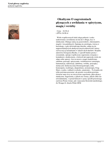 Tytuł główny nagłówka podtytuł nagłówka Okultyzm O zagrożeniach płynących z uwikłania w spirytyzm, magię i wróżby Cena: 18.30 zł (-27%) 24.90 zł Wielu współczesnych ludzi ulega pokusie i szuka uzdrowienia i uwolnienia od zła nie w Bogu, lecz w okultyzmie. Dlatego radzą się jasnowidzów, chiromantów, magów i im podobnych. Zajmują się astrologią, wierzą w horoskopy, a gdy doświadczają choroby, udają się do najprzeróżniejszych okultystycznych uzdrowicieli, którzy zazwyczaj są narzędziami w rękach złych duchów. Książka autorstwa Grzegorza Bacika, w sposób bardzo prosty i zrozumiały, opisuje współczesne zagrożenia związane z kontaktem z okultyzmem, z których tak naprawdę wielu nie zdaje sobie sprawy. Jest tu mowa o magii (maleficium, zabobon, przesąd), spirytyzmie, wróżbiarstwie (astrologia, kartomancja, radiestezja, zabobony, wróżby, przesądy), medycynie okultystycznej (bioenergoterapia, reiki, homeopatia, irydologia, akupunktura, aromaterapia, Feng Shui), o jodze, walkach wschodu, satanizmie... Ta książka nie tylko powinna przerażać, ale przede wszystkim powinna otwierać nam oczy na rzeczywiste zagrożenia, jakie płyną z okultyzmu. Zagrożenia, o jakich nie wiemy, jakich sobie nie uświadamiamy. A przed którymi w jasny sposób przestrzega zarówno Pismo święte, jak i nauczanie Kościoła katolickiego. Ze Wstępu O. Józefa Witki OFM 1/1 Powered by TCPDF (www.tcpdf.org)