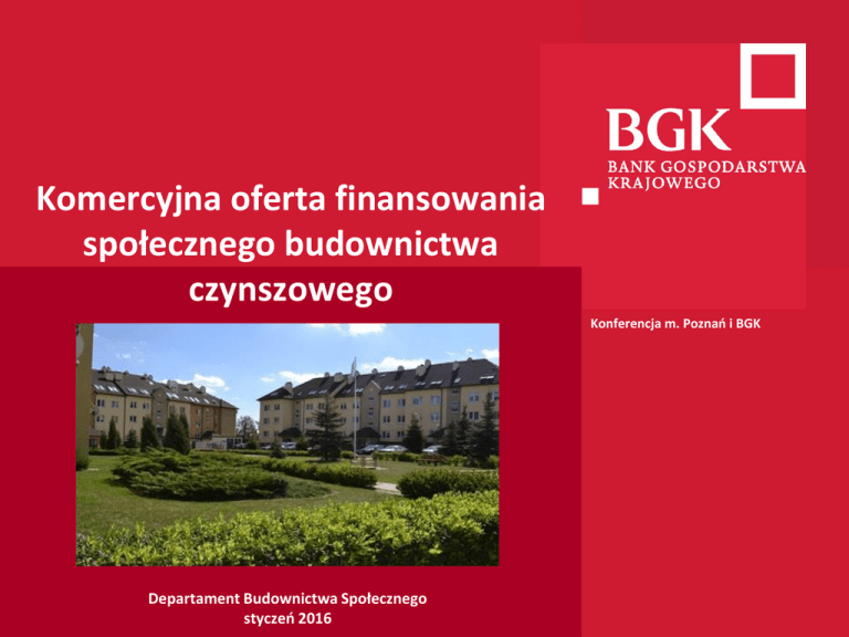 Komercyjna oferta finansowania społecznego budownictwa czynszowego Konferencja m. Poznań i BGK Departament Budownictwa Społecznego styczeń 2016 Produkty BGK dla sektora budownictwa społecznego Oferta BGK Produkty komercyjne kredyt budowlany obligacje Programy rządowe b. KFM (w obsłudze) nowy program 2 Finansowanie komercyjne TBS w BGK – wspólne cechy kredytów i obligacji (1/2) finansowana budowa, przebudowa, adaptacja – mieszkania na wynajem, ale także lokale użytkowe/miejsca postojowe/garaże (nie więcej niż 25% powierzchni) inwestycje na wynajem (możliwe wyodrębnienie na własność części mieszkań po 5 latach) lub z dojściem do własności; nie są finansowane projekty deweloperskie inwestycje na gruntach własnych Klienta, ew. użytkowanie wieczyste czynsz musi wystarczyć na spłatę kredytu/wykup obligacji, eksploatację i remonty stawka czynszu – uwolniona dla mieszkań niefinansowanych preferencyjnie brak limitów dochodowych dla najemców 3 Finansowanie komercyjne TBS w BGK – wspólne cechy kredytów i obligacji (2/2) maksymalny udział kredytu/obligacji w finansowaniu przedsięwzięcia 70%; środki BGK uruchamiane po zaangażowaniu środków własnych Klienta brak ograniczenia wysokości partycypacji najemców okres finansowania do 30 lat oprocentowanie WIBOR + marża; prowizja 1% + 0,25% za każdy kwartał po przekroczeniu 6 miesięcy od podpisania umowy do uruchomienia kredytu zabezpieczenia: hipoteka, cesja z czynszów i polis, pełnomocnictwa do rachunków bankowych, oświadczenie o poddaniu się egzekucji w trybie art. 777 KPC umowa z generalnym wykonawcą możliwa do przedłożenia w Banku przed uruchomieniem środków, a nie podpisaniem umowy 4 Cechy różnicujące komercyjne kredyty budowlane i emisje obligacji Kredyt budowlany: Emisja obligacji: kredytobiorcy: TBS, spółki komunalne emitenci: gminne TBS min. kwota kredytu 0,5 mln zł min. kwota emisji 3 mln zł postępowanie przetargowe na pozyskanie finansowania w przypadku gminnych TBS bezprzetargowy tryb pozyskania finansowania wpis do księgi wieczystej bez notariusza wpis do księgi wieczystej wyłącznie notarialnie 5 Role w procesie emisji obligacji TBS – emitent obligacji • emituje obligacje • otrzymuje środki z emisji • wykupuje obligacje Gmina/Miasto – właściciel TBS • wyraża zgodę na emisję obligacji (zgromadzenie wspólników TBS) Bank Gospodarstwa Krajowego – organizator i gwarant • • • • • organizuje proces emisji obligacji dokonuje rozliczeń emisji może być administratorem prawnych zabezpieczeń emisji gwarantuje nabycie na własny rachunek lub inwestora całości emisji (opcjonalnie) dokonuje sprzedaży obligacji na rynku wtórnym Inwestor zewnętrzny, np. otwarty fundusz emerytalny • może nabyć część lub całość emisji na rynku pierwotnym (przy emisji) lub wtórnym (w okresie wykupu obligacji) 6 BGK – dane kontaktowe Bank Gospodarstwa Krajowego Departament Budownictwa Społecznego Kontakt: • Beata Rozbiewska: [email protected] • Małgorzata Mroźnik: [email protected] 7