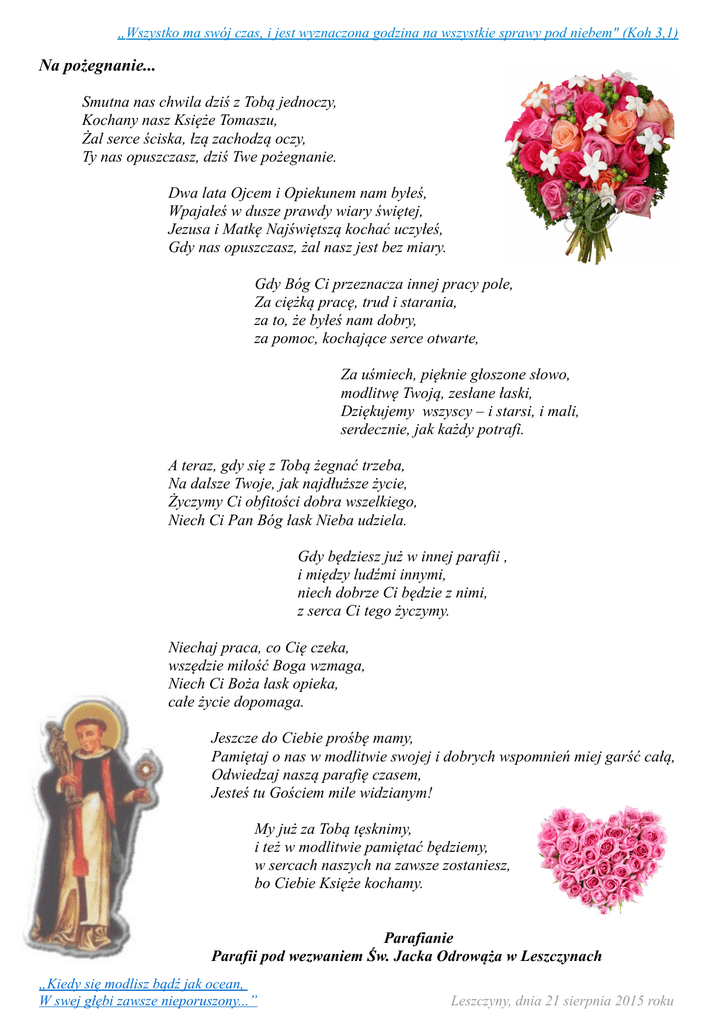 „Wszystko ma swój czas, i jest wyznaczona godzina na wszystkie sprawy pod niebem" (Koh 3,1) Na pożegnanie... Smutna nas chwila dziś z Tobą jednoczy, Kochany nasz Księże Tomaszu, Żal serce ściska, łzą zachodzą oczy, Ty nas opuszczasz, dziś Twe pożegnanie. Dwa lata Ojcem i Opiekunem nam byłeś, Wpajałeś w dusze prawdy wiary świętej, Jezusa i Matkę Najświętszą kochać uczyłeś, Gdy nas opuszczasz, żal nasz jest bez miary. Gdy Bóg Ci przeznacza innej pracy pole, Za ciężką pracę, trud i starania, za to, że byłeś nam dobry, za pomoc, kochające serce otwarte, Za uśmiech, pięknie głoszone słowo, modlitwę Twoją, zesłane łaski, Dziękujemy wszyscy – i starsi, i mali, serdecznie, jak każdy potrafi. A teraz, gdy się z Tobą żegnać trzeba, Na dalsze Twoje, jak najdłuższe życie, Życzymy Ci obfitości dobra wszelkiego, Niech Ci Pan Bóg łask Nieba udziela. Gdy będziesz już w innej parafii , i między ludźmi innymi, niech dobrze Ci będzie z nimi, z serca Ci tego życzymy. Niechaj praca, co Cię czeka, wszędzie miłość Boga wzmaga, Niech Ci Boża łask opieka, całe życie dopomaga. Jeszcze do Ciebie prośbę mamy, Pamiętaj o nas w modlitwie swojej i dobrych wspomnień miej garść całą, Odwiedzaj naszą parafię czasem, Jesteś tu Gościem mile widzianym! My już za Tobą tęsknimy, i też w modlitwie pamiętać będziemy, w sercach naszych na zawsze zostaniesz, bo Ciebie Księże kochamy. Parafianie Parafii pod wezwaniem Św. Jacka Odrowąża w Leszczynach „Kiedy się modlisz bądź jak ocean, W swej głębi zawsze nieporuszony...” Leszczyny, dnia 21 sierpnia 2015 roku