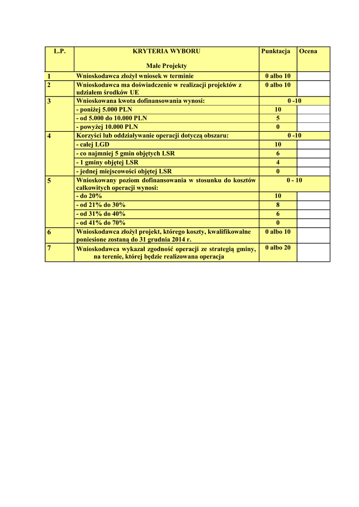 L.P. 1 2 3 4 5 6 7 KRYTERIA WYBORU Małe Projekty Wnioskodawca złożył wniosek w terminie Wnioskodawca ma doświadczenie w realizacji projektów z udziałem środków UE Wnioskowana kwota dofinansowania wynosi: - poniżej 5.000 PLN - od 5.000 do 10.000 PLN - powyżej 10.000 PLN Korzyści lub oddziaływanie operacji dotyczą obszaru: - całej LGD - co najmniej 5 gmin objętych LSR - 1 gminy objętej LSR - jednej miejscowości objętej LSR Wnioskowany poziom dofinansowania w stosunku do kosztów całkowitych operacji wynosi: - do 20% - od 21% do 30% - od 31% do 40% - od 41% do 70% Wnioskodawca złożył projekt, którego koszty, kwalifikowalne poniesione zostaną do 31 grudnia 2014 r. Wnioskodawca wykazał zgodność operacji ze strategią gminy, na terenie, której będzie realizowana operacja Punktacja Ocena 0 albo 10 0 albo 10 0 -10 10 5 0 0 -10 10 6 4 0 0 - 10 10 8 6 0 0 albo 10 0 albo 20