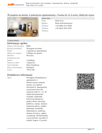 Nieruchomości we Lwowie: mieszkania, domy, budynki http://dim.lviv.ua/pl/ Wynajem na dzień, 2 pokojowe apartamenty, Vuzka St, 8, Lwów, Hałycki rejon Seller Info Imię: Spółka: Telefon: Telefon: Telefon: dimlvivua Dom Nieruchomości +38 (096) 614-5050 +38 (063) 964-2587 Listing details Informacje ogólne Numer referencyjny: Rodzaj transakcji: Pokoi: Miejsc do spania: Metrów kwadratowych: Piętro: Piętrowy dom: Typ budynku: Klasa mieszkania: Cena: 0094 Wynajem na dzień 2 pokojowe apartamenty 4 Miejsc do spania 60 m.kw. 2 podłoga 3 piętrowy Stary Funduszu Standard 750 UAH Dodatkowe informacje Opis: Wynajem dwupokojowy apartament w historycznym centrum miasta, na wąskich uliczkach 8. apartamenty są przeznaczone dla czterech osób (2 + 2). W skład nieruchomości wchodzi: piekarnik, telewizor plazmowy, pralka, Bron, telewizja kablowa, wanna, internet bezprzewodowy, pralka, piekarnik, kuchenka mikrofalowa, lodówka, ekspres do kawy, opłata za parking. Nieskazitelnie czysta pościel, ręczniki (2 sztuki), kapcie. Czystość page 1 / 2 Nieruchomości we Lwowie: mieszkania, domy, budynki http://dim.lviv.ua/pl/ w mieszkaniu mamy gwar antowane!Podróżnych wydawanie dokumentów zamieszkania. Аренда квартир во Львове посуточно без посредников Lokalizacja Kraj: Obwód: Miasto: Rejon: Ulice: Numer domu: Ukraina Obwód Lwowski Lwów Hałycki rejon Vuzka St 8 page 2 / 2 Powered by TCPDF (www.tcpdf.org)