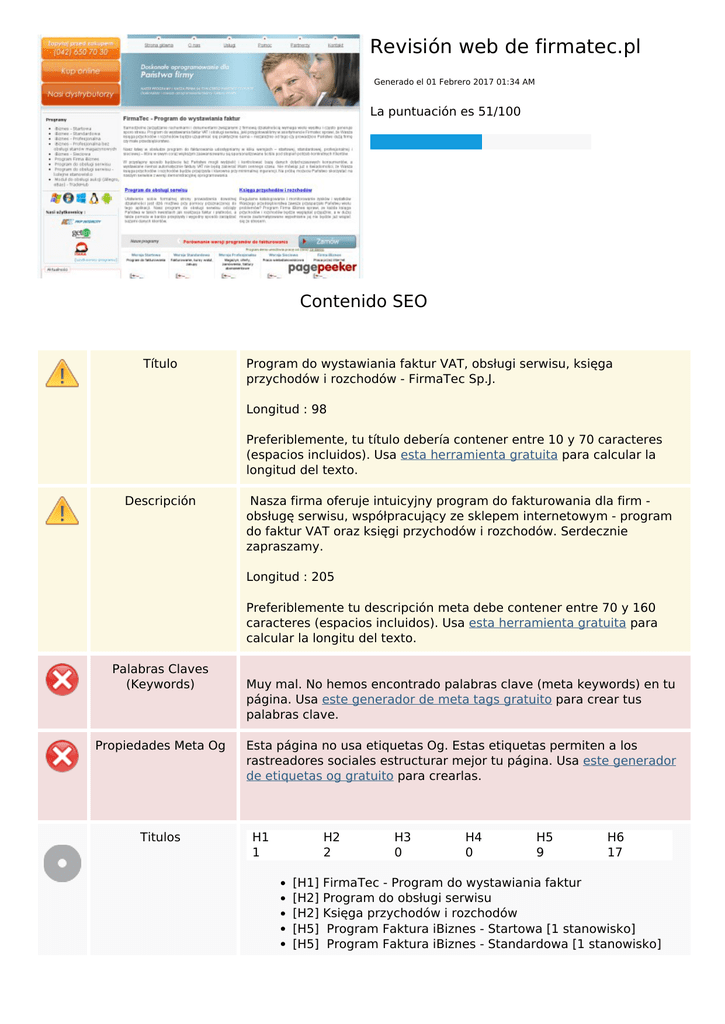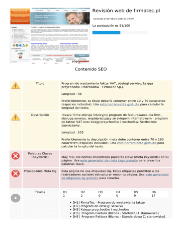 Revisión web de firmatec.pl Generado el 01 Febrero 2017 01:34 AM La puntuación es 51/100 Contenido SEO Título Program do wystawiania faktur VAT, obsługi serwisu, księga przychodów i rozchodów - FirmaTec Sp.J. Longitud : 98 Preferiblemente, tu título debería contener entre 10 y 70 caracteres (espacios incluidos). Usa esta herramienta gratuita para calcular la longitud del texto. Descripción Nasza firma oferuje intuicyjny program do fakturowania dla firm obsługę serwisu, współpracujący ze sklepem internetowym - program do faktur VAT oraz księgi przychodów i rozchodów. Serdecznie zapraszamy. Longitud : 205 Preferiblemente tu descripción meta debe contener entre 70 y 160 caracteres (espacios incluidos). Usa esta herramienta gratuita para calcular la longitu del texto. Palabras Claves (Keywords) Propiedades Meta Og Titulos Muy mal. No hemos encontrado palabras clave (meta keywords) en tu página. Usa este generador de meta tags gratuito para crear tus palabras clave. Esta página no usa etiquetas Og. Estas etiquetas permiten a los rastreadores sociales estructurar mejor tu página. Usa este generador de etiquetas og gratuito para crearlas. H1 1 H2 2 [H1] [H2] [H2] [H5] [H5] H3 0 H4 0 H5 9 H6 17 FirmaTec - Program do wystawiania faktur Program do obsługi serwisu Księga przychodów i rozchodów Program Faktura iBiznes - Startowa [1 stanowisko] Program Faktura iBiznes - Standardowa [1 stanowisko] Contenido SEO [H5] Program Faktura iBiznes - Profesjonalna [1 stanowisko] [H5] Program Faktura iBiznes - Profesjonalna bez obsługi stanów magazynowych [1 stanowisko] [H5] Program Faktura iBiznes - Sieciowa [1 stanowisko] [H5] Program Firma iBiznes [1 stanowisko] [H5] Program do Serwisu [1 stanowisko] [H5] Program do Serwisu- kolejne stanowisko [1 stanowisko] [H5] Program Faktura iBiznes - Synchro [1 stanowisko] [H6] Wersja na PC [H6] Wersja na USB [H6] Wersja na PC [H6] Wersja na USB [H6] Wersja na PC [H6] Wersja na USB [H6] Wersja na PC [H6] Wersja na USB [H6] Wersja na PC [H6] Wersja na USB [H6] Wersja na PC [H6] Wersja na USB [H6] Do serwisu [H6] Wersja na USB [H6] Do serwisu [H6] Wersja na USB [H6] Do synchronizacji danych Imagenes Hemos encontrado 41 imágenes en esta web. 40 atributos alt están vacios o no existen. Agrega texto alternativo para que los motores de búsqueda puedan entender las imágenes. Ratio Texto/HTML Ratio : 37% Ideal! El ratio entre texto y código HTML de esta página está entre 25 y 70 por ciento. Flash Iframe Perfecto, no se ha detectado contenido Flash en la página. Muy mal, tienes Iframes en la página, esto significa que el contenido no podrá ser indexado. Enlaces SEO Reescritura URL Bien. Tus enlaces parecen amigables Guiones bajos en las URLs Hemos detectado guiones bajos en tus URLs. Deberías usar guiones en su lugar para optimizar tu SEO. Enlaces SEO Enlaces en página Hemos encontrado un total de 47 enlaces incluyendo 0 enlace(s) a ficheros Statistics Enlaces Externos : noFollow 0% Enlaces Externos : Pasando Jugo 2.13% Enlaces Internos 97.87% Enlaces en página Ancla Tipo Jugo - Interna Pasando Jugo - Interna Pasando Jugo Strona główna Interna Pasando Jugo O nas Interna Pasando Jugo Usługi Interna Pasando Jugo Pomoc Interna Pasando Jugo Kontakt Interna Pasando Jugo iBiznes - Startowa Interna Pasando Jugo iBiznes - Standardowa Interna Pasando Jugo iBiznes - Profesjonalna Interna Pasando Jugo iBiznes - Profesjonalna bez obsługi stanów magazynowych Interna Pasando Jugo iBiznes - Sieciowa Interna Pasando Jugo Program Firma iBiznes Interna Pasando Jugo Program do obsługi serwisu Interna Pasando Jugo [użytkownicy programu] Interna Pasando Jugo - Externo Pasando Jugo Dowiedz się więcej >> Interna Pasando Jugo Program do obsługi serwisu Interna Pasando Jugo Księga przychodów i rozchodów Interna Pasando Jugo - Interna Pasando Jugo Enlaces en página Porównanie wersji programów do fakturowania Interna Pasando Jugo - Interna Pasando Jugo - Interna Pasando Jugo - Interna Pasando Jugo - Interna Pasando Jugo - Interna Pasando Jugo - Interna Pasando Jugo - Interna Pasando Jugo - Interna Pasando Jugo - Interna Pasando Jugo - Interna Pasando Jugo - Interna Pasando Jugo - Interna Pasando Jugo - Interna Pasando Jugo - Interna Pasando Jugo - Interna Pasando Jugo - Interna Pasando Jugo - Interna Pasando Jugo - Interna Pasando Jugo - Interna Pasando Jugo - Interna Pasando Jugo - Interna Pasando Jugo - Interna Pasando Jugo - Interna Pasando Jugo Pomoc on line Interna Pasando Jugo Produkty Interna Pasando Jugo Pobierz Interna Pasando Jugo Palabras Clave SEO Nube de Palabras Clave serwisu vat obsługi ibiznes wersja faktura stanowisko pln faktur program Consistencia de las Palabras Clave Palabra Clave (Keyword) Contenido vat 31 wersja 20 program 19 ibiznes 18 faktura 16 Título Palabras Claves (Keywords) Descripció n Titulos Usabilidad Url Dominio : firmatec.pl Longitud : 11 Favicon Genial, tu web tiene un favicon. Imprimibilidad No hemos encontrado una hoja de estilos CSS para impresión. Idioma Genial. Has declarado el idioma pl. Dublin Core Esta página no usa Dublin Core. Documento Tipo de documento (Doctype) HTML 4.01 Transitional Codificación Perfecto. Has declarado como codificación UTF-8. Documento Validez W3C Errores : 42 Avisos : 7 Privacidad de los Emails Atención! Hemos encontrado por lo menos una dirección de correo electrónico en texto plano. Usa este protector antispam gratuito para ocultarla de los spammers. HTML obsoleto Etiquetas obsoletas Ocurrencias <center> 2 <font> 6 <u> 1 Hemos detectado etiquetas HTML obsoletas que ya no se usa. Es recomendable que cambies esas etiquetas por otras similares. Consejos de Velocidad Excelente, esta web no usa tablas. Muy mal, tu web está usando estilos embenidos (inline CSS). Genial, tu página web usa muy pocos ficheros CSS. Perfecto, tu web usa pocos ficheros JavaScript. Su sitio web se beneficia del tipo de compresión gzip. ¡Perfecto! Movil Optimización Móvil Icono para Apple Etiq
