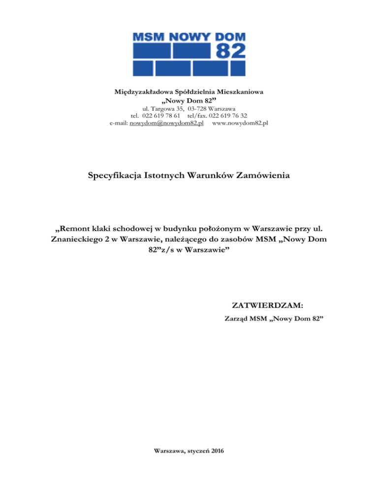 Międzyzakładowa Spółdzielnia Mieszkaniowa „Nowy Dom 82” ul. Targowa 35, 03-728 Warszawa tel. 022 619 78 61 tel/fax. 022 619 76 32 e-mail: [email protected] www.nowydom82.pl Specyfikacja Istotnych Warunków Zamówienia „Remont klaki schodowej w budynku położonym w Warszawie przy ul. Znanieckiego 2 w Warszawie, należącego do zasobów MSM „Nowy Dom 82”z/s w Warszawie” ZATWIERDZAM: Zarząd MSM „Nowy Dom 82” Warszawa, styczeń 2016 SPECYFIKACJA ISTOTNYCH WARUNKÓW ZAMÓWIENIA I. INFORMACJE O ZAMAWIAJĄCYM I PRZEDMIOCIE ZAMÓWIENIA. 1. Zamawiający: Międzyzakładowa Spółdzielnia Mieszkaniowa „Nowy Dom 82” w Warszawie z siedziba przy ul. Targowej 35, 03-728 Warszawa, tel. 22 619-78-61, NIP 525-00-12-219, REGON 000981966, KRS: 0000063049 2. Tryb Udzielenia zamówienia: Postępowanie o udzielenie zamówienia prowadzone jest w trybie przetargu nieograniczonego, zgodnie z„Regulaminem organizowania przetargów na roboty budowlane, remontowe, konserwacyjne oraz inne dostawy i usługi na rzez MSM „Nowy Dom 82” (Regulamin dostępny do wglądu w siedzibie MSM „Nowy Dom 82”). 2. Rodzaj zamówienia: Roboty budowlane. 3. Przedmiot zamówienia: Przedmiotem postępowania i zamówienia jest wyłonienie Wykonawcy na „Remont klatki schodowej w budynku przy ul. Znanieckiego 2 w Warszawie, należącego do zasobów „MSM Nowy Dom 82” w Warszawie”. 4. Zakres prac określa: • SIWZ. • Wzór umowy – zał. nr 1 • Warunki techniczne wykonania i odbioru robót – zał. nr 4. • Kosztorys inwestorski – zał. nr 6. • Wizja lokalna. 5.Opis przedmiotu zamówienia: • Gruntowanie preparatem wzmacniającym CT 17 jednokrotne- ściany; • Gruntowanie preparatem wzmacniającym CT 17 jednokrotnie - sufity, biegi, spoczniki • Wewnętrzne gładzie gipsowe dwuwarstwowe na ścianach • Wewnętrzne gładzie gipsowe dwuwarstwowe na sufitach z elementów prefabrykowanych i betonowych wylewanych • Gruntowanie podłoży preparatami "CERESIT CT 17" i "ATLAS UNIGRUNT" powierzchnie pionowe • Gruntowanie podłoży preparatami "CERESIT CT 17" i "ATLAS UNIGRUNT" powierzchnie poziome - sufit, bieg, spocznik • Dwukrotne malowanie farbami lateksowymi starych tynków wewnętrznych ścian • Dwukrotne malowanie farbami lateksowymi starych tynków wewnętrznych sufitów, biegów, spoczników 1 • • • • • • • • II. Czyszczenie przez szczotkowanie mechaniczne do drugiego stopnia czystości konstrukcji kratowych (stan wyjściowy powierzchni B) – balustrady Dwukrotne malowanie farbą olejną krat i balustrad z prętów prostych Dwukrotne malowanie farbą olejną uprzednio malowanej stolarki drzwiowej, ścianek i szafek o powierzchni do 1.0 m2 - pomalowanie skrzynek oraz grzejników Dwukrotne malowanie farbą olejną uprzednio malowanej stolarki drzwiowej oraz okiennej Dwukrotne malowanie farbą olejną rur gazowych, c.o. o średnicy do 50 mm Jednopomostowe rusztowania wewnętrzne rurowe do robót wykonywanych na sufitach przy wysokości do 4 m Wywiezienie gruzu spryzmowanego samochodami skrzyniowymi Mycie po robotach malarskich posadzek UWARUNKOWANIA ZAMÓWIENIA. WYKONANIA I REALIZACJI PRZEDMIOTU 1. Prace prowadzone będą przy założeniach ciągłości funkcjonowania budynku. 2. Zamawiający nie dostarcza sprzętu ani materiału potrzebnego do wykonania przedmiotu umowy. 3. Wykonawca dostarczy Zamawiającemu certyfikaty, aprobaty techniczne, deklaracje zgodności, materiałów użytych do wykonania przedmiotu zamówienia, przed ich wbudowaniem/użyciem w miejscu prac. 4. Prace należy prowadzić w dni powszednie od godz. 8:00 do godz. 18:00 prace uciążliwe dla mieszkańców od godz. 10:00 do godz. 16:00. 5. Wykonawca po każdym dniu pracy, uprzątnie i zabezpieczy teren prac. 6. Wykonawca zapewni we własnym zakresie kontener na odpady budowlane. 7. Wykonawca zapewni kierownika robót z uprawnieniami w specjalności konstrukcyjno – budowlanej do kierowania robotami budowlanymi bez ograniczeń. III. PREFEROWANY TERMIN REALIZACJI ZAMÓWIENIA. 1. Planowany termin realizacji robót: marzec – kwiecień 2016 roku IV. WARUNKI FINANSOWANIA. 1.Określone w ofercie wynagrodzenie Wykonawcy ma charakter ryczałtu i jest stałe oraz nie podlega waloryzacji w trakcie realizacji zamówienia. 2.Zamawiający nie dopuszcza fakturowania częściowego. 3.Płatność za wykonane prace odbędzie się w terminie 21 dni od daty dostarczenia protokołu odbioru prac podpisanego przez inspektora. 4.Wykonawca wykona przedmiot zamówienia siłami własnymi. 2 V. WYMAGANIA STAWIANE OFERENTOM. 1. Posiadanie uprawnień do występowania w obrocie prawnym, zgodnie z wymogami ustawowymi. 2. Udzielenie minimum 36 miesięcy gwarancji na wykonane prace. 3. Posiadanie niezbędnej wiedzy, uprawnień, doświadczenia oraz potencjału ekonomicznego i technicznego, a także pracowników zdolnych do wykonania prac określonych w zamówieniu. 4. Wykonawca zapewni kierownika robót z uprawnieniami w specjalności konstrukcyjno – budowlanej do kierowania robotami budowlanymi, bez ograniczeń. 5. Posiadanie polisy ubezpieczeniowej OC od odpowiedzialności cywilnej z tytułu prowadzonej działalności gospodarczej na minimum 150.000 zł. 6. Minimum 5 letnie doświadczenie przy wykonywaniu robót budowlanych w tym robót malarskich. 7. Co najmniej 3 referencje (z ostatnich 2 lat) na zrealizowanie prac związanych z remontami klatek schodowych, których wartość umowna brutto wynosiła, co najmniej 50.000,00 zł. Z ubiegania się o udzielenie zamówienia wyklucza się oferentów, wykonawców i dostawców: a) którzy wyrządzili Zamawiającemu szkodę nie wykonując zamówienia z własnej winy, lub wykonując je z nienależytą starannością, nieterminowo lub w sposób niewłaściwy; b) w odniesieniu, do których wszczęto postępowanie upadłościowe lub których ogłoszono upadłość; c) z którymi Zamawiający znajduje się w sporze sądowym; d) którzy zalegają z uiszczeniem podatków, opłat, skład