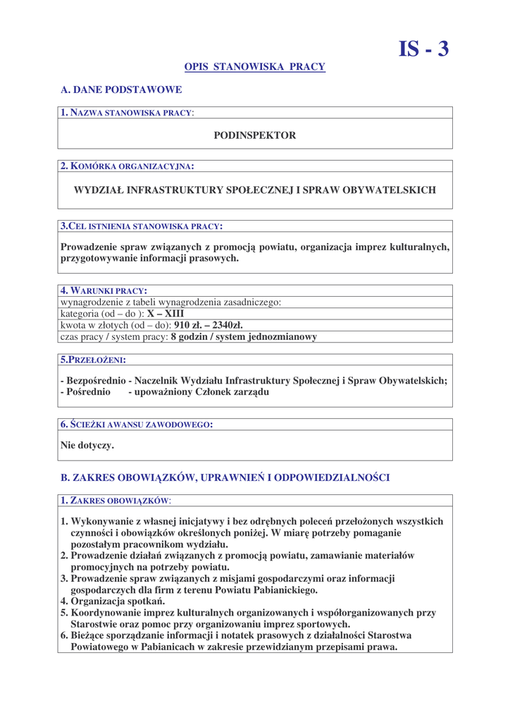 OPIS STANOWISKA PRACY IS - 3 A. DANE PODSTAWOWE 1. NAZWA STANOWISKA PRACY: PODINSPEKTOR 2. KOMÓRKA ORGANIZACYJNA: WYDZIAŁ INFRASTRUKTURY SPOŁECZNEJ I SPRAW OBYWATELSKICH 3.CEL ISTNIENIA STANOWISKA PRACY: Prowadzenie spraw zwi zanych z promocj powiatu, organizacja imprez kulturalnych, przygotowywanie informacji prasowych. 4. WARUNKI PRACY: wynagrodzenie z tabeli wynagrodzenia zasadniczego: kategoria (od – do ): X – XIII kwota w złotych (od – do): 910 zł. – 2340zł. czas pracy / system pracy: 8 godzin / system jednozmianowy 5.PRZEŁO ENI: - Bezpo rednio - Naczelnik Wydziału Infrastruktury Społecznej i Spraw Obywatelskich; - Po rednio - upowa niony Członek zarz du 6. CIE KI AWANSU ZAWODOWEGO: Nie dotyczy. B. ZAKRES OBOWI ZKÓW, UPRAWNIE I ODPOWIEDZIALNO CI 1. ZAKRES OBOWI ZKÓW: 1. Wykonywanie z własnej inicjatywy i bez odr bnych polece przeło onych wszystkich czynno ci i obowi zków okre lonych poni ej. W miar potrzeby pomaganie pozostałym pracownikom wydziału. 2. Prowadzenie działa zwi zanych z promocj powiatu, zamawianie materiałów promocyjnych na potrzeby powiatu. 3. Prowadzenie spraw zwi zanych z misjami gospodarczymi oraz informacji gospodarczych dla firm z terenu Powiatu Pabianickiego. 4. Organizacja spotka . 5. Koordynowanie imprez kulturalnych organizowanych i współorganizowanych przy Starostwie oraz pomoc przy organizowaniu imprez sportowych. 6. Bie ce sporz dzanie informacji i notatek prasowych z działalno ci Starostwa Powiatowego w Pabianicach w zakresie przewidzianym przepisami prawa. 2. ZAKRES ODPOWIEDZIALNO CI: Pracownik b dzie ponosił odpowiedzialno za prawidłowe, zgodne z prawem i terminowe wykonywanie zada okre lonych w zakresie obowi zków opisanych w punkcie 1 oraz za przestrzeganie obowi zków wynikaj cych z przepisów kodeksu pracy, regulaminu organizacyjnego Starostwa Powiatowego w Pabianicach oraz uchwał i zarz dze Rady Powiatu, Zarz du Powiatu i Starosty Pabianickiego. 3. ZAKRES UPRAWNIE : Rozpowszechnianie materiałów promocyjno - informacyjnych o Powiecie Pabianickim. Kontakty zewn trzne. C. WYMAGANIA KWALIFIKACYJNE 1. WYKSZTAŁCENIE : Wy sze, rednie 2. DO WIADCZENIE ZAWODOWE: - Trzy lata pracy, w tym przynajmniej rok pracy w urz dach administracji pa stwowej lub samorz dowej dla osób z rednim wykształceniem. - Do wiadczenie w organizowaniu i prowadzeniu imprez o charakterze kulturalnym i sportowym. - Do wiadczenie w prowadzeniu i kreowaniu wizerunku firmy / instytucji. 3. UPRAWNIENIA: konieczne: Nie dotyczy. po dane: prawo jazdy kategorii B 4. WYMAGANA WIEDZA SPECJALISTYCZNA: - Ustawy o samorz dzie powiatowym, - Ustawy o bezpiecze stwie imprez masowych, - Ustawy o organizowaniu i prowadzeniu działalno ci kulturalnej, - Ustawy o działalno ci po ytku publicznego i o wolontariacie, - Kodeksu Post powania Administracyjnego 5. ZNAJOMO Znajomo POZOSTAŁYCH ZAGADNIE : j. angielskiego lub innego j zyka obcego 6. CECHY OSOBOWO CI: Uczciwy, solidny, punktualny, dokładny, systematyczny, stanowczy, samodzielny i kreatywny w rozwi zywaniu problemów, zaanga owany, lojalny, otwarty na wiedz i ch tny do jej pogł biania, komunikatywny, dyskretny, odporny na stres, yczliwy, opanowany, wysoka kultura osobista. 7.DYSPOZYCYJNO : W sytuacjach tego wymagaj cych mo e wyst pi potrzeba pozostawania w dyspozycji przeło onego po godzinach pracy i w dni wolne od pracy. 8.UMIEJ TNO : Sporz dzania informacji i notatek prasowych, umiej tno korzystania z przepisów prawa, umiej tno pracy w zespole, umiej tno logicznego my lenia, umiej tno słuchania i wysławiania si . 9. OBSŁUGA -KOMPUTERY, SYSTEMY I PROGRAMY KOMPUTEROWE, MASZYNY, NARZ DZIA: Obsługa komputera, kserokopiarki, faxu Opis stanowiska sporz dził: Jacek Barasi ski - Naczelnik Wydziału Infrastruktury Społecznej i Spraw Obywatelskich Pabianice, dnia 12 czerwca 2007r.