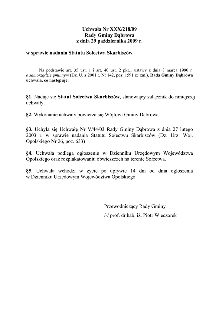Uchwała Nr XXX/218/09 Rady Gminy Dąbrowa z dnia 29 października 2009 r. w sprawie nadania Statutu Sołectwa Skarbiszów Na podstawie art. 35 ust. 1 i art. 40 ust. 2 pkt.1 ustawy z dnia 8 marca 1990 r. o samorządzie gminnym (Dz. U. z 2001 r. Nr 142, poz. 1591 ze zm.), Rada Gminy Dąbrowa uchwala, co następuje: §1. Nadaje się Statut Sołectwu Skarbiszów, stanowiący załącznik do niniejszej uchwały. §2. Wykonanie uchwały powierza się Wójtowi Gminy Dąbrowa. §3. Uchyla się Uchwałę Nr V/44/03 Rady Gminy Dąbrowa z dnia 27 lutego 2003 r. w sprawie nadania Statutu Sołectwu Skarbiszów (Dz. Urz. Woj. Opolskiego Nr 26, poz. 633) §4. Uchwała podlega ogłoszeniu w Dzienniku Urzędowym Województwa Opolskiego oraz rozplakatowaniu obwieszczeń na terenie Sołectwa. §5. Uchwała wchodzi w życie po upływie 14 dni od dnia ogłoszenia w Dzienniku Urzędowym Województwa Opolskiego. Przewodniczący Rady Gminy /-/ prof. dr hab. iż. Piotr Wieczorek Załącznik do Uchwały Nr XXX/218/09 Rady Gminy Dąbrowa z dnia 29 października 2009 r. STATUTU SOŁECTWA SKARBISZÓW Postanowienia ogólne. §1. Ilekroć w Statucie jest mowa o: 1) Sołectwie – należy przez to rozumieć Sołectwo Skarbiszów, 2) Radzie – należy przez to rozumieć Radę Gminy Dąbrowa, 3) Wójcie – należy przez to rozumieć Wójta Gminy Dąbrowa, 4) Statucie – należy przez to rozumieć Statut Sołectwa 5) Organy Gminy – należy przez to rozumieć Radę Gminy Dąbrowa i Wójta Gminy Dąbrowa. Nazwa, obszar Sołectwa. §2. Sołectwo Skarbiszów jest jednostką pomocniczą Gminy Dąbrowa i obejmuje obszar 1086,4700 ha. §3.1. Sołectwo tworzą jego wszyscy mieszkańcy. 2. Sołectwo działa na podstawie przepisów prawa, a w szczególności: 1) ustawy o samorządzie gminnym, 2) Statutu Gminy Dąbrowa, 3) postanowień niniejszego Statutu. 3. Sołectwo nie posiada osobowości prawnej. 4. W obrocie cywilnoprawnym Sołectwo może występować tylko za pośrednictwem organów Gminy. Zakres działania Sołectwa §4. Do zadań Sołectwa należy zapewnienie jego mieszkańcom udziału w realizacji zadań Gminy, w szczególności : 1) działanie wśród mieszkańców Sołectwa na rzecz godzenia interesów partykularnych z interesem wspólnym i koniecznością zachowania istniejących wartości społecznych, 2) tworzenie warunków do pełnego udziału mieszkańców w życiu publicznym Sołectwa, 3) reprezentowanie interesu jej mieszkańców względem organów administracji publicznej i innych podmiotów życia publicznego, 4) organizowanie zbiorowej działalności Sołectwa, 5) uczestnictwo w podejmowaniu przez organy Gminy rozstrzygnięć prawnych i administracyjnych dotyczących Sołectwa, 6) występowanie do Rady o sfinansowanie szczególnie ważnych zadań, 7) współpraca z radnymi wybranymi z terenu Sołectwa. Zakres zadań przekazywanych Sołectwu oraz sposób ich realizacji §5. Sołectwo ma prawo wnosić do Rady o przekazanie mu do realizacji następujących zadań: 1) administrowanie i używanie mienia przekazanego do dyspozycji Sołectwa oraz rozporządzanie dochodami z tego tytułu, 2) samodzielne gospodarowanie środkami przydzielonymi do dyspozycji Sołectwa w budżecie Gminy na realizację zadań przekazanych uchwałą Rady, 3) organizowanie na terenie Sołectwa tradycyjnych świąt, dni, obchodów i rocznic, kultywowanie obrzędów i tradycji, 4) współpraca z organizacjami pozarządowymi działającymi na terenie Sołectwa i wspieranie ich projektów w zakresie kultury fizycznej i rekreacji, 5) promowanie ekologii wśród mieszkańców i dbałości o środowisko naturalne. §6.1. Określa się następujące sposoby realizacji zadań przekazanych Sołectwu, a mianowicie: Zadanie z §5 pkt.1. Sołectwu mogą być przekazane do korzystania tylko składniki mienia komunalnego znajdującego się na jego terenie, Przekazanie Sołectwu mienia komunalnego może nastąpić tylko na cele publiczne określone jako zadania własne Gminy. Sołectwo powinno spełnić następujące warunki, aby został mu przekazany określony składnik mienia komunalnego: − zebranie wiejskie powinno podjąć uchwałę o wystąpieniu do Wójta o przekazanie sołectwu danego składnika mienia komunalnego, jak również o upoważnieniu sołtysa do wystąpienia ze stosownym wnioskiem, − wniosek powinien mieć formę pisemną i powinien zawierać : − szczegółowy opis celu na jaki ma być wykorzystane mienie, − wskazanie składników mienia komunalnego niezbędnych do realizacji celu, − proponowany czas korzystania z mienia, − wskazanie osoby, która będzie ponosiła odpowiedzialność za przekazane mienie komunalne. Przekazanie Sołectwu składników mienia komunalnego następuje na podstawie umowy podpisanej przez Wójta i Sołtysa oraz protokołu zdawczo-odbiorczego, zawierającego dokładny opis przekazywanego mienia. Z chwilą spełnienia powyższych warunków , Sołectwo samodzielnie dokonuje czynności formalnych, w tym cywilno-prawnych, polegających zawieraniu odpłatnych umów najmu lub dzierżawy oraz czynności faktycznych polegających na używaniu mienia na własne potrzeby, jak również pobieraniu pożytków i przychodów z tego mienia. Obowiązkiem Sołectwa jest wykorzystywanie mienia zgodnie z przeznaczeniem, utrzymywania go w stanie niepogorszonym i jego ochrona. Gospodarując wydzieloną częścią mienia komunalnego, Sołectwo kieruje się zasadami ujętymi w przepisach prawa (legalności, rzetelności, celowości i gospodarności) oraz ponosi odpowiedzialność za prawidłowe gospodarowanie mieniem. W razie uzyskania z przekazanego mienia dochodów, Sołectwo samodzielnie wyznacza zadania do sfinansowania, z uwzględnieniem zadań ujętych w §5. Zadanie z §5pkt. 2 Samodzielne gospodarowanie środkami przydzielonymi Sołectwu następuje poprzez uchwalenie załącznika do uchwały budżetowej zawierającego: a) wydatki jednostki pomocniczej w układzie działów i rozdziałów; b) wysokość kwoty, do