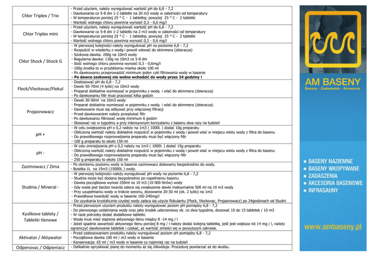 Chlor Triplex / Trio Chlor Triplex mini Chlor Shock / Shock G Flock/Vlockovac/Flokul Projasnowacz pH + pH Zazimowacz / Zima Studnia / Mineral - Kyslikove tablety / Tabletki tlenowe Aktivator / Aktywator Odpenovac / Odpieniacz - Przed użyciem, należy wyregulować wartość pH do 6,8 - 7,2 - Dawkowanie co 5-8 dni 1-2 tabletki na 20 m3 wody w zależności od temperatury - W temperaturze poniżej 25 ° C - 1 tabletkę; powyżej 25 ° C - 2 tabletki - Wartość wolnego chloru powinna wynosić 0,3 - 0,6 mg/l - Przed użyciem, należy wyregulować wartość pH do 6,8 - 7,2 - Dawkowanie co 5-8 dni 1-2 tabletki na 2 m3 wody w zależności od temperatury - W temperaturze poniżej 25 ° C - 1 tabletkę; powyżej 25 ° C - 2 tabletki - Wartość wolnego chloru powinna wynosić 0,3 - 0,6 mg/l - W pierwszej kolejności należy wyregulować pH na poziomie 6,8 - 7,2 - Rozpuścić w wiaderku z wodą i powoli wlewać do skimmera (zbieracza) - Szokowa dawka: 200g na 10m3 wody - Regularna dawka: 130g na 10m3 co 5-8 dni - Ilość wolnego chloru powinna wynosić 0,3 - 0,6mg/l - 100g środka to w przybliżeniu miarka około 100 ml - Po dawkowaniu przeprowadzić minimum jeden cykl filtrowania wody w basenie - Po dawce szokowej nie wolno wchodzić do wody przez 24 godziny ! - Dostosować pH do 6,8 - 7,2 - Dawki 50-70ml (4 łyżki) na 10m3 wody - Preparat dokładnie wymieszać w pojemniku z wodą i wlać do skimmera (zbieracza) - Po dawkowaniu filtr musi pracować kilka godzin - Dawki 30-50ml na 10m3 wody - Preparat dokładnie wymieszać w pojemniku z wodą i wlać do skimmera (zbieracza) - Dawkowanie musi się odbywać przy włączonej filtracji - Przed dawkowaniem należy przepłukać filtr - Po dawkowaniu filtrować wodę minimum 6 godzin - Stosować raz w tygodniu a przy intensywnym korzystaniu z basenu dwa razy na tydzień - W celu zwiększenia pH o 0,2 należy na 1m3 ( 1000l. ) dodać 10g preparatu - Obliczoną wartość należy dokładnie rozpuścić w pojemniku z wodą i powoli wlać w miejscu wlotu wody z filtra do basenu - Do prawidłowego rozprowadzenia preparatu musi być włączony filtr - 100 g preparatu to około 150 ml - W celu zmniejszenia pH o 0,2 należy na 1m3 ( 1000l. ) dodać 15g preparatu - Obliczoną wartość należy dokładnie rozpuścić w pojemniku z wodą i powoli wlać w miejscu wlotu wody z filtra do basenu - Do prawidłowego rozprowadzenia preparatu musi być włączony filtr - 250 g preparatu to około 150 ml - Po obniżeniu poziomu wody w basenie zazimowacz dolewamy bezpośrednio do wody. - Butelka 1L na 15m3 (15000L ) wody. - W pierwszej kolejności należy wyregulować pH wody na poziomie 6,8 - 7,2 - Studnia może być dodana bezpośrednio po napełnieniu basenu - Dawka początkowa wynosi 250ml na 10 m3 (10 000 litrów) wody - Gdy woda jest bardzo twarda zaleca się zwiększenie dawki maksymalnie 500 ml na 10 m3 wody - Przy uzupełnianiu wody w trakcie sezonu, dozowanie 20-30 ml (ok. 2 łyżki) na 1m3 - Prawidłowa twardość wody w basenie 160-240mg/l - Do uzyskania krystalicznie czystej wody zaleca się użycie flokulantu (Flock, Vlockovac, Projasnowacz) po 24godzinach od Studni - Przed pierwszym użyciem produktu należy wyregulować poziom pH pomiędzy 6,8 - 7,2 - Do pierwszego uzdatniania wody oraz jako środek uderzeniowy ok. co dwa tygodnie, dozować 10 do 15 tabletek / 10 m3 - W razie potrzeby dodać dodatkowe tabletki. - Woda musi mieć stężenie aktywnego tlenu między 8 -14 mg / l - Jeżeli spadnie zawartość aktywnego tlenu poniżej 8 mg / l należy dodać kolejną tabletkę, jeśli jest większa niż 14 mg / l, należy ograniczyć dawkowanie tabletek i czekać, aż wartość zmieści się w powyższym zakresie. - Przed zastosowaniem produktu należy wyregulować poziom pH pomiędzy 6,8 - 7,2 - Początkowa dawka 100 ml / m3 wody w basenie - Konserwacja: 65 ml / m3 wody w basenie co najmniej raz na tydzień - Delikatnie opryskiwać pianę do momentu aż się zlikwiduje. Procedurę powtarzać aż do skutku.