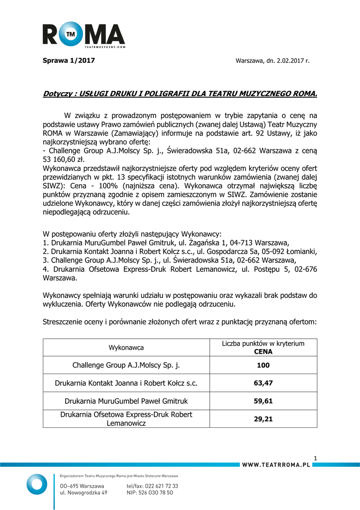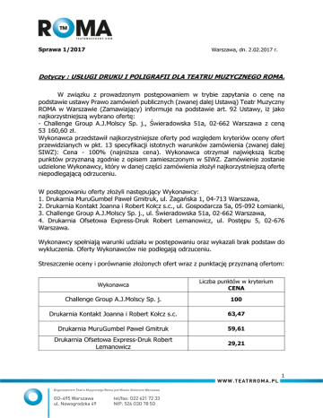 Sprawa 1/2017 Warszawa, dn. 2.02.2017 r. Dotyczy : USŁUGI DRUKU I POLIGRAFII DLA TEATRU MUZYCZNEGO ROMA. W związku z prowadzonym postępowaniem w trybie zapytania o cenę na podstawie ustawy Prawo zamówień publicznych (zwanej dalej Ustawą) Teatr Muzyczny ROMA w Warszawie (Zamawiający) informuje na podstawie art. 92 Ustawy, iż jako najkorzystniejszą wybrano ofertę: - Challenge Group A.J.Molscy Sp. j., Świeradowska 51a, 02-662 Warszawa z ceną 53 160,60 zł. Wykonawca przedstawił najkorzystniejsze oferty pod względem kryteriów oceny ofert przewidzianych w pkt. 13 specyfikacji istotnych warunków zamówienia (zwanej dalej SIWZ): Cena - 100% (najniższa cena). Wykonawca otrzymał największą liczbę punktów przyznaną zgodnie z opisem zamieszczonym w SIWZ. Zamówienie zostanie udzielone Wykonawcy, który w danej części zamówienia złożył najkorzystniejszą ofertę niepodlegającą odrzuceniu. W postępowaniu oferty złożyli następujący Wykonawcy: 1. Drukarnia MuruGumbel Paweł Gmitruk, ul. Żagańska 1, 04-713 Warszawa, 2. Drukarnia Kontakt Joanna i Robert Kołcz s.c., ul. Gospodarcza 5a, 05-092 Łomianki, 3. Challenge Group A.J.Molscy Sp. j., ul. Świeradowska 51a, 02-662 Warszawa, 4. Drukarnia Ofsetowa Express-Druk Robert Lemanowicz, ul. Postępu 5, 02-676 Warszawa. Wykonawcy spełniają warunki udziału w postępowaniu oraz wykazali brak podstaw do wykluczenia. Oferty Wykonawców nie podlegają odrzuceniu. Streszczenie oceny i porównanie złożonych ofert wraz z punktację przyznaną ofertom: Wykonawca Liczba punktów w kryterium CENA Challenge Group A.J.Molscy Sp. j. 100 Drukarnia Kontakt Joanna i Robert Kołcz s.c. 63,47 Drukarnia MuruGumbel Paweł Gmitruk 59,61 Drukarnia Ofsetowa Express-Druk Robert Lemanowicz 29,21 1 Punktacja w kryterium „Cena” została przyznana na podstawie wzoru matematycznego umieszczonego w SIWZ: Oferta najkorzystniejsza cenowo Cena oferty analizowanej X 100 pkt. Zgodnie z art. 94 ust. 1 pkt. 2 Ustawy, Zamawiający zamierza zawrzeć umowę w sprawie zamówienia publicznego w terminie nie krótszym niż 10 dni od dnia przesłania zawiadomienia o wyborze najkorzystniejszej oferty. Zawiadomienia zostały przesłane pocztą (nie wszyscy Wykonawcy dysponują faksem). Zamawiający podpiszę umowę najwcześniej w dniu 14.02.2017 r. 2