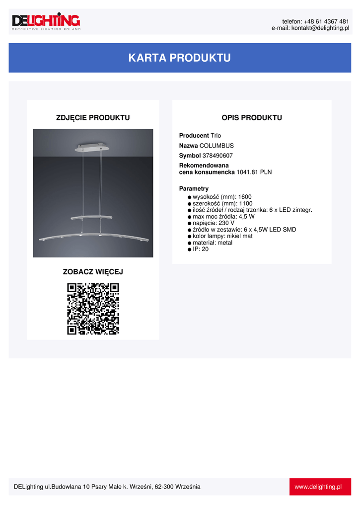 telefon: +48 61 4367 481 e-mail: [email protected] KARTA PRODUKTU ZDJĘCIE PRODUKTU OPIS PRODUKTU Producent Trio Nazwa COLUMBUS Symbol 378490607 Rekomendowana cena konsumencka 1041.81 PLN Parametry ● wysokość (mm): 1600 ● szerokość (mm): 1100 ● ilość źródeł / rodzaj trzonka: 6 x LED zintegr. ● max moc źródła: 4,5 W ● napięcie: 230 V ● źródło w zestawie: 6 x 4,5W LED SMD ● kolor lampy: nikiel mat ● materiał: metal ● IP: 20 ZOBACZ WIĘCEJ DELighting ul.Budowlana 10 Psary Małe k. Wrześni, 62-300 Września www.delighting.pl