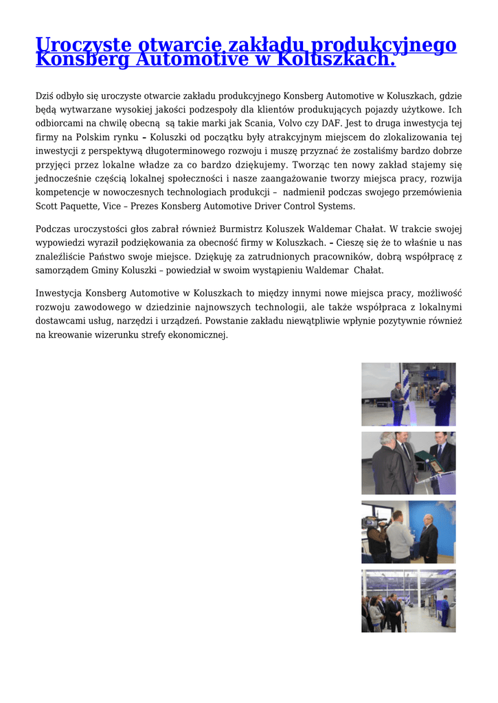 Uroczyste otwarcie zakładu produkcyjnego Konsberg Automotive w Koluszkach. Dziś odbyło się uroczyste otwarcie zakładu produkcyjnego Konsberg Automotive w Koluszkach, gdzie będą wytwarzane wysokiej jakości podzespoły dla klientów produkujących pojazdy użytkowe. Ich odbiorcami na chwilę obecną są takie marki jak Scania, Volvo czy DAF. Jest to druga inwestycja tej firmy na Polskim rynku – Koluszki od początku były atrakcyjnym miejscem do zlokalizowania tej inwestycji z perspektywą długoterminowego rozwoju i muszę przyznać że zostaliśmy bardzo dobrze przyjęci przez lokalne władze za co bardzo dziękujemy. Tworząc ten nowy zakład stajemy się jednocześnie częścią lokalnej społeczności i nasze zaangażowanie tworzy miejsca pracy, rozwija kompetencje w nowoczesnych technologiach produkcji – nadmienił podczas swojego przemówienia Scott Paquette, Vice – Prezes Konsberg Automotive Driver Control Systems. Podczas uroczystości głos zabrał również Burmistrz Koluszek Waldemar Chałat. W trakcie swojej wypowiedzi wyraził podziękowania za obecność firmy w Koluszkach. – Cieszę się że to właśnie u nas znaleźliście Państwo swoje miejsce. Dziękuję za zatrudnionych pracowników, dobrą współpracę z samorządem Gminy Koluszki – powiedział w swoim wystąpieniu Waldemar Chałat. Inwestycja Konsberg Automotive w Koluszkach to między innymi nowe miejsca pracy, możliwość rozwoju zawodowego w dziedzinie najnowszych technologii, ale także współpraca z lokalnymi dostawcami usług, narzędzi i urządzeń. Powstanie zakładu niewątpliwie wpłynie pozytywnie również na kreowanie wizerunku strefy ekonomicznej.
