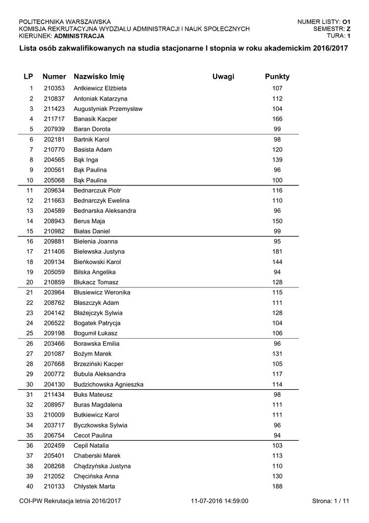 Lista osób zakwalifikowanych na studia stacjonarne I stopnia w roku akademickim 2016/2017 LP Numer Nazwisko Imię 1 210353 Antkiewicz Elżbieta 107 2 210837 Antoniak Katarzyna 112 3 211423 Augustyniak Przemysław 104 4 211717 Banasik Kacper 166 5 207939 Baran Dorota 99 6 202181 Bartnik Karol 98 7 210770 Basista Adam 120 8 204565 Bąk Inga 139 9 200561 Bąk Paulina 96 10 205068 Bąk Paulina 100 11 209634 Bednarczuk Piotr 116 12 211663 Bednarczyk Ewelina 110 13 204589 Bednarska Aleksandra 96 14 208943 Berus Maja 150 15 210982 Białas Daniel 99 16 209881 Bielenia Joanna 95 17 211406 Bielewska Justyna 181 18 209134 Bieńkowski Karol 144 19 205059 Bilska Angelika 94 20 210859 Blukacz Tomasz 128 21 203964 Blusiewicz Weronika 115 22 208762 Błaszczyk Adam 111 23 204142 Błażejczyk Sylwia 128 24 206522 Bogatek Patrycja 104 25 209198 Bogumił Łukasz 106 26 203466 Borawska Emilia 96 27 201087 Bożym Marek 131 28 207668 Brzeziński Kacper 105 29 200772 Bubula Aleksandra 117 30 204130 Budzichowska Agnieszka 114 31 211434 Buks Mateusz 98 32 208957 Buras Magdalena 111 33 210009 Butkiewicz Karol 111 34 203717 Byczkowska Sylwia 96 35 206754 Cecot Paulina 94 36 202459 Cepil Natalia 103 37 205401 Chaberski Marek 113 38 208268 Chądzyńska Justyna 110 39 212052 Chęcińska Anna 130 40 210133 Chłystek Marta 188 COI-PW Rekrutacja letnia 2016/2017 Uwagi 11-07-2016 14:59:00 Punkty Strona: 1 / 11 Lista osób zakwalifikowanych na studia stacjonarne I stopnia w roku akademickim 2016/2017 LP Numer Nazwisko Imię 41 208347 Chodak Katarzyna 100 42 209042 Chołody Agata 122 43 210766 Chomicz Olga 110 44 211293 Chrościcka Magdalena 103 45 209117 Chudorlińska Klaudia 97 46 205291 Chwedoruk Michał 120 47 210516 Cichecka Monika 100 48 209161 Cichocki Krzysztof 120 49 211925 Cichucka Karolina 112 50 211297 Cieśla Monika 139 51 212335 Cieślak Magda 101 52 204578 Ciok Anna 94 53 206945 Cioth Dominik 96 54 206624 Ciża Magdalena 107 55 206720 Cwalina Natalia 108 56 211540 Czaplicka Karolina 97 57 205916 Czarnecka Klaudia 145 58 205778 Czmut Marta 98 59 207901 Dąbrowska Klaudia 122 60 203739 Dębała Katarzyna 106 61 204097 Dębska Marzena 108 62 200048 Dołęga-Kozierowska Weronika 104 63 210809 Domagała Weronika 94 64 205207 Drab Katarzyna 122 65 200527 Drabent Małgorzata 111 66 211873 Drozd Karolina 96 67 211631 Dudkiewicz Daria 159 68 211426 Dudzicki Patryk 140 69 203031 Dybiec Agata 96 70 209396 Dyczewski Kamil 95 71 204277 Dziamara Michał 122 72 205811 Epsztein Tadeusz 107 73 211855 Fajst Marcin 136 74 208071 Filipek Kamil 95 75 201517 Filipiak Anita 119 76 208793 Floriańczyk Emilia 125 77 211771 Frank Marita 113 78 212054 Frąk Konrad 104 79 209732 Furmankowski Krzysztof 113 80 211551 Gabrylewicz Zuzanna 98 COI-PW Rekrutacja letnia 2016/2017 Uwagi 11-07-2016 14:59:00 Punkty Strona: 2 / 11 Lista osób zakwalifikowanych na studia stacjonarne I stopnia w roku akademickim 2016/2017 LP Numer Nazwisko Imię 81 205581 Gajda Magdalena 102 82 210415 Gaj-Demczuk Małgorzata 108 83 201075 Galbarczyk Sylwia 94 84 211384 Gańko Kamil 104 85 210194 Gardocka Anna 107 86 211618 Gawrońska Agata 112 87 211250 Gąsowski Konrad 113 88 210414 Głazek Dorota 105 89 200453 Gmur Kinga 103 90 209450 Godala Dariusz 118 91 211956 Golian Bianka 101 92 202140 Gołębiewska Kinga 100 93 212080 Gołębiowska Wioletta 101 94 208410 Goss Daria 96 95 210302 Górka Joanna 134 96 208429 Górniak Bartłomiej 99 97 205809 Grabowicz Adam 158 98 208834 Grajewski Bartosz 95 99 210279 Gralewicz Mateusz 101 100 212306 Gref Piotr 159 101 202803 Gromek Kinga 145 102 204284 Gronowska Aleksandra 159 103 200224 Grot Dominik 99 104 205725 Grzegrzółka Sebastian 124 105 206928 Grzejszczak Agnieszka 108 106 209399 Grzeszczyk Paula 129 107 205057 Gugałka Wiktoria 119 108 209121 Gurczyńska Adrianna 109 109 211885 Gut Agnieszka 99 110 211239 Guz Piotr 152 111 205402 Hejwosz Mateusz 100 112 208755 Hetnał Piotr 149 113 208195 Hibner Aleksander 108 114 205734 Hincmann Katarzyna 155 115 208357 HUSA EMIL 105 116 202309 Iwaniuk Adrian 112 117 209401 Izdebska Wioletta 119 118 201727 Jaczewski Przemysław 100 119 201807 Jagiełło Maria 123 120 203798 Janiszewska Anna 113 COI-PW Rekrutacja letnia 2016/2017 Uwagi 11-07-2016 14:59:00 Punkty Strona: 3 / 11 Lista osób zakwalifikowanych na studia stacjonarne I stopnia w roku akademickim 2016/2017 LP Numer Nazwisko Imię 121 207623 Jarosz Tamara 106 122 204235 Jarząbska Żaneta 110 123 212128 Jastrzębski Maciej 113 124 211584 Jaworska Angelika 120 125 205833 Jaworska Martyna 134 126 211472 Jaworska Sylwia 103 127 201070 Jaworski Patryk 94 128 212000 Jedynak Mateusz 104 129 210728 Jeż Angelika 96 130 203771 Jęda Sylwia 130 131 205825 JĘDRAL MARTYNA 102 132 207254 Jurko Alicja 95 133 206504 Kaczmarska Joanna 150 134 208530 Kamińska Dominika 144 135 204054 Kapuścik Michał 123 136 211954 Karbownik Bogusława 106 137 204606 Kartowicz Anna 122 138 204899 Kawecki Bartłomiej 103 139 204205 Kępiński Kamil 194 140 206264 Kęska Michał 141 206251 Kęska Piotr 102 142 206125 Kicińska Dominika 109 143 209232 Kiepura Przemysław 101 144 206004 Kisiołek Anna 137 145 209599 Klamut Weronika 102 146 210471 Klepacz Kacper 147 147 211597 Kłossek Karolina 107 148 204944 Kołakowska Klaudia 106 149 209013 Kołodziejczyk Julia 114 150 203956 Kondratiuk Iuliia 151 201827 Kongiel Jakub 113 152 206011 Konieczna Marta 119 153 208734 Kopeć Natalia 116 154 210961 Kopyt Małgorzata 94 155 206119 Korczak Anna 116 156 207545 Kornaszewska Marta 156 157 206559 Korzeń Gabriela 143 158 209176 Kosidło Paulina 122 159 200442 Kosmala Karolina 98 160 209315 Kosowska Anna 95 COI-PW Rekrutacja letnia 2016/2017 Uwagi KP KP,OM 11-07-2016 14:59:00 Punkty 95 95 Strona: 4 / 11 Lista osób zakwalifikowanych na studia stacjonarne I stopnia w roku akademickim 2016/2017 LP Numer Nazwisko Imię 161 203074 Koszyk Paulina 104 162 201436 Koślicka Dominika 118 163 212031 Kot Aleksandra 111 164 211753 Kowal Anna 103 165 211983 Kowalczyk Klaudia 152 166 
