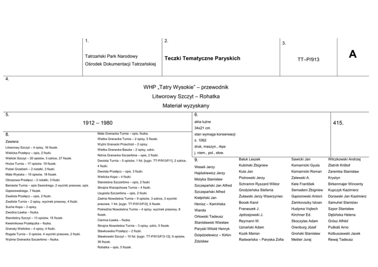 1. 2. Tatrzański Park Narodowy Teczki Tematyczne Paryskich 3. Ośrodek Dokumentacji Tatrzańskiej A TT–P/913 4. WHP „Tatry Wysokie” – przewodnik Litworowy Szczyt – Rohatka Materiał wyzyskany 5. 6. 1912 – 1980 akta luźne 415. 34x21 cm 8. Zawiera: Litworowy Szczyt – 4 opisy, 16 fiszek. Wielicka Przełęcz – opis, 2 fiszki. Wielicki Szczyt – 20 opisów, 3 szkice, 27 fiszek. Hruba Turnia – 17 opisów, 19 fiszek. Polski Grzebień – 2 notatki, 3 fiszki. Mała Wysoka – 10 opisów, 18 fiszek. Obrazowa Przełęcz – 2 notatki, 3 fiszki. Baniasta Turnia – opis Sawickiego, 2 wycinki prasowe, opis Gąsiorowskiego, 7 fiszek. Zwalista Przełęcz – opis, 2 fiszki. Zwalista Turnia – 2 opisy, wycinek prasowy, 4 fiszki. Sucha Kopa – 3 opisy. Zwodna Ławka – fiszka. Staroleśny Szczyt – 13 opisów, 15 fiszek. Kwietnikowa Przełączka – fiszka. Granaty Wielickie – 4 opisy, 4 fiszki. Rogata Turnia – 5 opisów, 4 wycinki prasowe, 2 fiszki. Wyżnia Granacka Szczerbina – fiszka. Mała Granacka Turnia – opis, fiszka. stan wymaga konserwacji Wielka Granacka Turnia – 2 opisy, 5 fiszek. s. 1062 Wyżni Granacki Przechód – 2 opisy. Wielka Granacka Baszta – 2 opisy, szkic. Niżnia Granacka Szczerbina – opis, 2 fiszki. druk, maszyn., rkps j. niem., pol., słow. 9. Bałuk Leszek Sawicki Jan Wilczkowski Andrzej 4 fiszki. Weseli Jerzy Kubiński Zbigniew Komarnicki Gyula Zlatník Krištof Dwoista Przełęcz – opis, 3 fiszki. Hajdukiewicz Jerzy Kula Jan Komarnicki Roman Zaremba Stanisław Motyka Stanisław Piotrowski Jerzy Zalewski A. Krystyn Szczepański Jan Alfred Schramm Ryszard Wiktor Kele František Birkenmajer Wincenty Usypista Szczerbina – opis, 2 fiszki. Szczepański Alfred Grodzieńska Stefania Semadeni Zbigniew Kupczyk Kazimierz Zadnia Nowoleśna Turnia – 9 opisów, 3 szkice, 3 wycinki Kiełpiński Jan Żuławski Jerzy Wawrzyniec Gąsiorowski Antoni Dorawski Jan Kazimierz prasowe, 1 fot. [sygn. TT-P/913/F/2], 6 fiszek. Henisz – Kamińska Bocek Karol Zamkovszky Istvan Samuhel Stanislav Pośrednia Nowoleśna Turnia – 4 opisy, wycinek prasowy, 8 Wanda Franaszek J. Hudyma Vojtech Szpor Stanisław Orłowski Tadeusz Jędrzejowski J. Kirchner Ed. Dębińska Helena Stanisławski Wiesław Reymann W. Skoczylas Adam Grósz Alfréd Paryski Witold Henryk Uznański Adam Orenburg Józef Puškáš Arno Sławkowski Szczyt – 10 fot. [sygn. TT-P/913/F/3-12], 9 opisów, Dziędzielewicz – Kirkin Kozik Marian Groński Stanisław Kolbuszewski Jacek 36 fiszek. Zdzisław Radwańska – Paryska Zofia Mešter Juraj Rewaj Tadeusz Dwoista Turnia – 5 opisów, 1 fot. [sygn. TT-P/913/F/1], 2 szkice, Wielicka Kopa – 4 fiszki. Staroleśna Szczerbina – opis, 2 fiszki. Skrajna Warzęchowa Turnia – 4 fiszki. fiszek. Ciemna Ławka – fiszka. Skrajna Nowoleśna Turnia – 3 opisy, szkic, 5 fiszek. Sławkowska Przełęcz – 2 fiszki. Rohatka – opis, 5 fiszek.