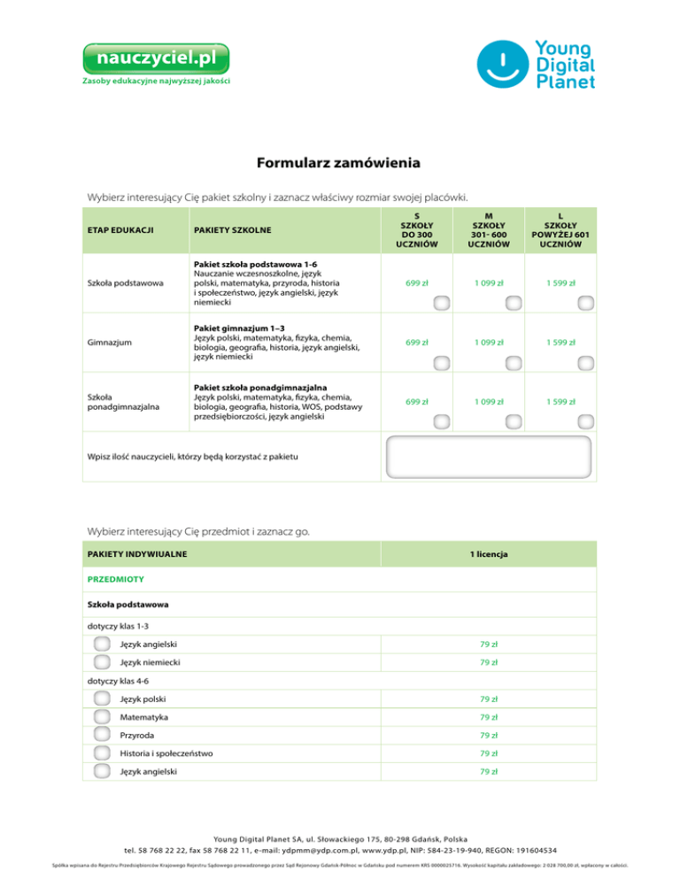 Formularz zamówienia Wybierz interesujący Cię pakiet szkolny i zaznacz właściwy rozmiar swojej placówki. S szkoły do 300 uczniów M szkoły 301- 600 uczniów L szkoły powyżej 601 uczniów Szkoła podstawowa Pakiet szkoła podstawowa 1-6 Nauczanie wczesnoszkolne, język polski, matematyka, przyroda, historia i społeczeństwo, język angielski, język niemiecki 699 zł 1 099 zł 1 599 zł Gimnazjum Pakiet gimnazjum 1–3 Język polski, matematyka, fizyka, chemia, biologia, geografia, historia, język angielski, język niemiecki 699 zł 1 099 zł 1 599 zł Szkoła ponadgimnazjalna Pakiet szkoła ponadgimnazjalna Język polski, matematyka, fizyka, chemia, biologia, geografia, historia, WOS, podstawy przedsiębiorczości, język angielski 699 zł 1 099 zł 1 599 zł Etap edukacji Pakiety szkolne Wpisz ilość nauczycieli, którzy będą korzystać z pakietu Wybierz interesujący Cię przedmiot i zaznacz go. Pakiety indywiualne 1 licencja Przedmioty Szkoła podstawowa dotyczy klas 1-3 Język angielski 79 zł Język niemiecki 79 zł dotyczy klas 4-6 Język polski 79 zł Matematyka 79 zł Przyroda 79 zł Historia i społeczeństwo 79 zł Język angielski 79 zł Young Digital Planet SA, ul. Słowackiego 175, 80-298 Gdańsk, Polska tel. 58 768 22 22, fax 58 768 22 11, e-mail: [email protected], www.ydp.pl, NIP: 584-23-19-940, REGON: 191604534 Spółka wpisana do Rejestru Przedsiębiorców Krajowego Rejestru Sądowego prowadzonego przez Sąd Rejonowy Gdańsk-Północ w Gdańsku pod numerem KRS 0000025716. Wysokość kapitału zakładowego: 2 028 700,00 zł, wpłacony w całości. Gimnazjum Język polski 79 zł Matematyka 79 zł Fizyka 79 zł Chemia 79 zł Biologia 79 zł Geografia 79 zł Historia 79 zł Język angielski 79 zł Język niemiecki 79 zł kursy językowe Pingwin Alex i przyjaciele 159,90 zł Angielski dla dzieci WOW! 189,90 zł Angielski z Cambrige 199,00 zł Język francuski D’accord 189,90 zł krusy specjalistyczne Mój pierwszy biznes 79,00 zł eduROM Przyroda Na ratunek Planecie 79,00 zł Cena licencji szkolnej obejmuje dostęp do zasobów edukacyjnych on-line na 12 miesięcy. Ważność kodów licencyjnych wynosi 30dni. Niniejszy cennik nie stanowi oferty w rozumieniu art. 66 Kodeksu cywilnego, a jedynie zaproszenie do zawarcia umowy handlowej w rozumieniu art. 71 Kodeksu cywilnego. DANE ZAMAWIAJĄCEGO: osoba prywatna Nazwa szkoły/instytucji/firmy: Adres: ul. i nr lok.: Kod pocztowy: Miejscowość: Tel: Fax: Oświadczam, że jestem płatnikiem VAT e-mail: NIP: Oświadczam, iż zapoznałem się i akceptuję Regulamin Sklepu Internetowego www.sklep.ydp.com.pl * Wyrażam zgodę na przetwarzanie zamieszczonych w formularzu danych, w tym w szczególności moich danych osobowych, o których mowa w art. 6 ust. 1 ustawy z dnia 29 sierpnia 1997 r. o ochronie danych osobowych (Dz.U. 1997 Nr 133, poz. 883), w celach związanych z promocją i marketingiem produktów i usług YDP S.A., przesyłania informacji handlowych, a także w celach statystycznych. Upoważniam firmę Young Digital Planet SA do wystawienia faktury VAT bez mojego podpisu. *brak zaznaczenia powyższego uniemożliwia zawarcia umowy z YDP S.A. Data: podpis: ��������������������������������������������������������������������������������������������� Dodatkowe informacje i zamówienia: telefonicznie 58 768 22 99 58 768 22 22 faxem 58 349 44 11 58 768 22 11 e-mailem [email protected] [email protected] listownie Young Digital Planet SA ul. Słowackiego 175 80-298 Gdańsk Young Digital Planet SA, ul. Słowackiego 175, 80-298 Gdańsk, Polska tel. 58 768 22 22, fax 58 768 22 11, e-mail: [email protected], www.ydp.pl, NIP: 584-23-19-940, REGON: 191604534 Spółka wpisana do Rejestru Przedsiębiorców Krajowego Rejestru Sądowego prowadzonego przez Sąd Rejonowy Gdańsk-Północ w Gdańsku pod numerem KRS 0000025716. Wysokość kapitału zakładowego: 2 028 700,00 zł, wpłacony w całości.