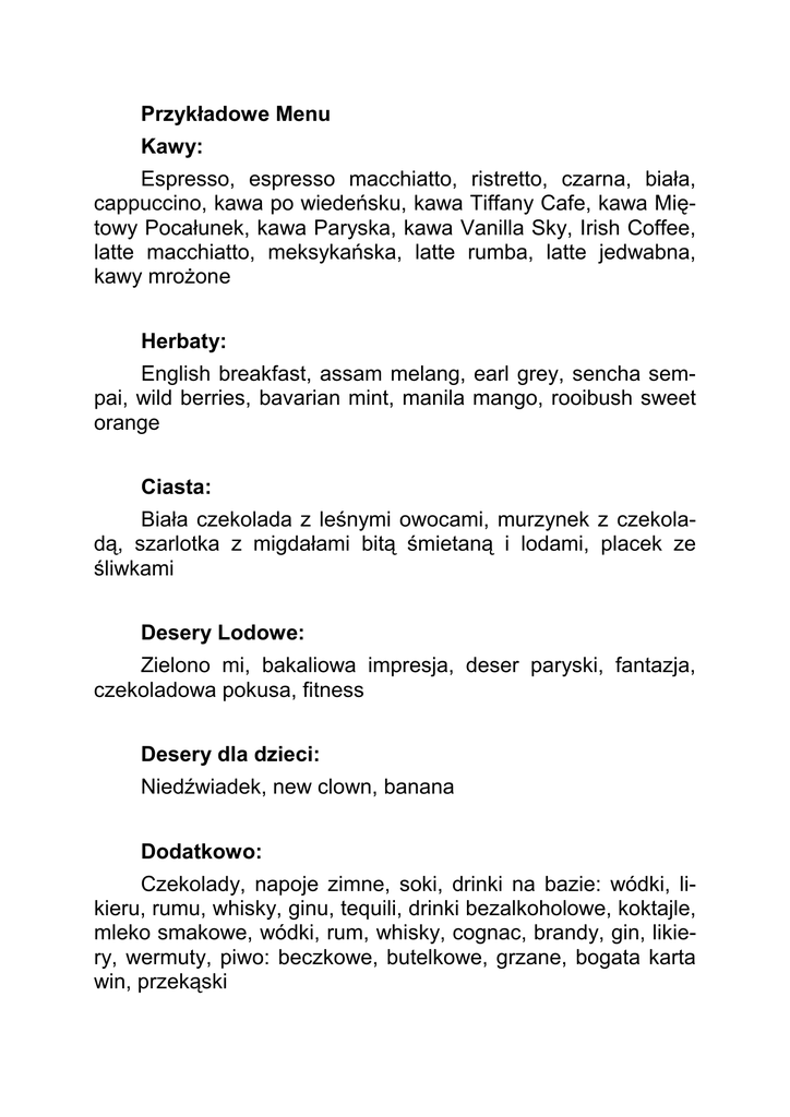 Przykładowe Menu Kawy: Espresso, espresso macchiatto, ristretto, czarna, biała, cappuccino, kawa po wiedeńsku, kawa Tiffany Cafe, kawa Miętowy Pocałunek, kawa Paryska, kawa Vanilla Sky, Irish Coffee, latte macchiatto, meksykańska, latte rumba, latte jedwabna, kawy mroŜone Herbaty: English breakfast, assam melang, earl grey, sencha sempai, wild berries, bavarian mint, manila mango, rooibush sweet orange Ciasta: Biała czekolada z leśnymi owocami, murzynek z czekoladą, szarlotka z migdałami bitą śmietaną i lodami, placek ze śliwkami Desery Lodowe: Zielono mi, bakaliowa impresja, deser paryski, fantazja, czekoladowa pokusa, fitness Desery dla dzieci: Niedźwiadek, new clown, banana Dodatkowo: Czekolady, napoje zimne, soki, drinki na bazie: wódki, likieru, rumu, whisky, ginu, tequili, drinki bezalkoholowe, koktajle, mleko smakowe, wódki, rum, whisky, cognac, brandy, gin, likiery, wermuty, piwo: beczkowe, butelkowe, grzane, bogata karta win, przekąski