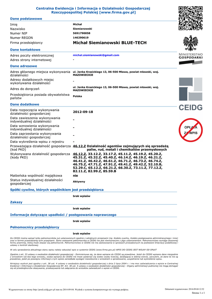 Centralna Ewidencja i Informacja o Działalności Gospodarczej Rzeczypospolitej Polskiej [www.firma.gov.pl] Dane podstawowe Imię Nazwisko Numer NIP Numer REGON Michał Firma przedsiębiorcy Michał Siemianowski BLUETECH Siemianowski 5691790058 146290619 Dane kontaktowe Adres poczty elektronicznej Adres strony internetowej [email protected] Dane adresowe Adres głównego miejsca wykonywania ul. Janka Krasickiego 13, 06500 Mława, powiat mławski, woj. MAZOWIECKIE działalności Adresy dodatkowych miejsc wykonywania działalności Adres do doręczeń ul. Janka Krasickiego 13, 06500 Mława, powiat mławski, woj. MAZOWIECKIE Przedsiębiorca posiada obywatelstwa państw Polska Dane dodatkowe Data rozpoczęcia wykonywania działalności gospodarczej Data zawieszenia wykonywania indywidualnej działalności Data wznowienia wykonywania indywidualnej działalności Data zaprzestania wykonywania działalności gospodarczej Data wykreślenia wpisu z rejestru Przeważająca działalność gospodarcza (kod PKD) Wykonywana działalność gospodarcza (kody PKD) Małżeńska wspólność majątkowa Status indywidualnej działalności gospodarczej 20120918 46.12.Z Działalność agentów zajmujących się sprzedażą paliw, rud, metali i chemikaliów przemysłowych 46.12.Z, 33.12.Z, 33.17.Z, 45.11.Z, 45.19.Z, 45.20.Z, 45.31.Z, 45.32.Z, 45.40.Z, 46.14.Z, 46.19.Z, 46.21.Z, 46.41.Z, 46.42.Z, 46.61.Z, 46.71.Z, 46.73.Z, 46.74.Z, 46.75.Z, 47.71.Z, 47.91.Z, 49.41.Z, 49.42.Z, 52.10.B, 52.29.C, 65.12.Z, 66.21.Z, 66.30.Z, 73.11.Z, 77.12.Z, 82.11.Z, 82.99.Z, 85.59.B nie Aktywny Spółki cywilne, których wspólnikiem jest przedsiębiorca brak wpisów Zakazy brak wpisów Informacje dotyczące upadłości / postępowania naprawczego brak wpisów Pełnomocnicy przedsiębiorcy brak wpisów Do CEIDG można wpisać tylko pełnomocników już ustanowionych zgodnie z odrębnymi przepisami (np. Kodeks cywilny, Kodeks postępowania administracyjnego i inne) oraz w formie przewidzianej tymi przepisami. Samo wskazanie pełnomocnika w CEIDG nie jest równoznaczne z jego ustanowieniem. Pełnomocnictwo wymaga stosownej formy pisemnej, którą może okazać się pełnomocnik. Pełnomocnictwo w CEIDG nie ma zastosowania w sprawach prowadzonych na podstawie Ordynacji podatkowej i ustawy o kontroli skarbowej. W celu sprawdzenia aktualnego stanu wpisu należy odszukać wpis w systemie CEIDG (www.firma.gov.pl) WPIS DO CEIDG JEST WOLNY OD OPŁAT Zgodnie z art. 33 ustawy o swobodzie działalności gospodarczej Domniemywa się, że dane wpisane do CEIDG są prawdziwe. Jeżeli do CEIDG wpisano dane niezgodnie z wnioskiem lub bez tego wniosku, osoba wpisana do CEIDG nie może zasłaniać się wobec osoby trzeciej, działającej w dobrej wierze, zarzutem, że dane te nie są prawdziwe, jeżeli po powzięciu informacji o tym wpisie zaniedbała wystąpić niezwłocznie z wnioskiem o sprostowanie, uzupełnienie lub wykreślenie wpisu. Niniejszy wydruk jest zgodny z art. 38 ust. 4 ustawy o swobodzie działalności gospodarczej z dnia 2 lipca 2004 r. i ma moc zaświadczenia o wpisie w Centralnej Ewidencji i Informacji o Działalności Gospodarczej RP. Art. 38 ust. 5 ustawy o swobodzie działalności gospodarczej Organy administracji publicznej nie mogą domagać się od przedsiębiorców okazywania, przekazywania lub załączania do wniosków zaświadczeń o wpisie w CEIDG. Wygenerowano ze strony http://prod.ceidg.gov.pl stan na 20140904. Wydruk z systemu komputerowego nie wymaga podpisu. Dokument wygenerowano: 20140904 12:52 Strona 1 z 1