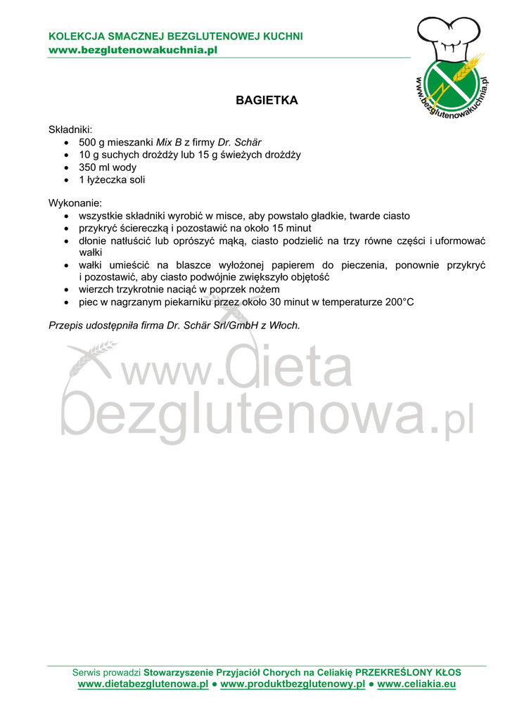 KOLEKCJA SMACZNEJ BEZGLUTENOWEJ KUCHNI www.bezglutenowakuchnia.pl BAGIETKA Składniki: 500 g mieszanki Mix B z firmy Dr. Schär 10 g suchych drożdży lub 15 g świeżych drożdży 350 ml wody 1 łyżeczka soli Wykonanie: wszystkie składniki wyrobić w misce, aby powstało gładkie, twarde ciasto przykryć ściereczką i pozostawić na około 15 minut dłonie natłuścić lub oprószyć mąką, ciasto podzielić na trzy równe części i uformować wałki wałki umieścić na blaszce wyłożonej papierem do pieczenia, ponownie przykryć i pozostawić, aby ciasto podwójnie zwiększyło objętość wierzch trzykrotnie naciąć w poprzek nożem piec w nagrzanym piekarniku przez około 30 minut w temperaturze 200°C Przepis udostępniła firma Dr. Schär Srl/GmbH z Włoch. Serwis prowadzi Stowarzyszenie Przyjaciół Chorych na Celiakię PRZEKREŚLONY KŁOS www.dietabezglutenowa.pl ● www.produktbezglutenowy.pl ● www.celiakia.eu