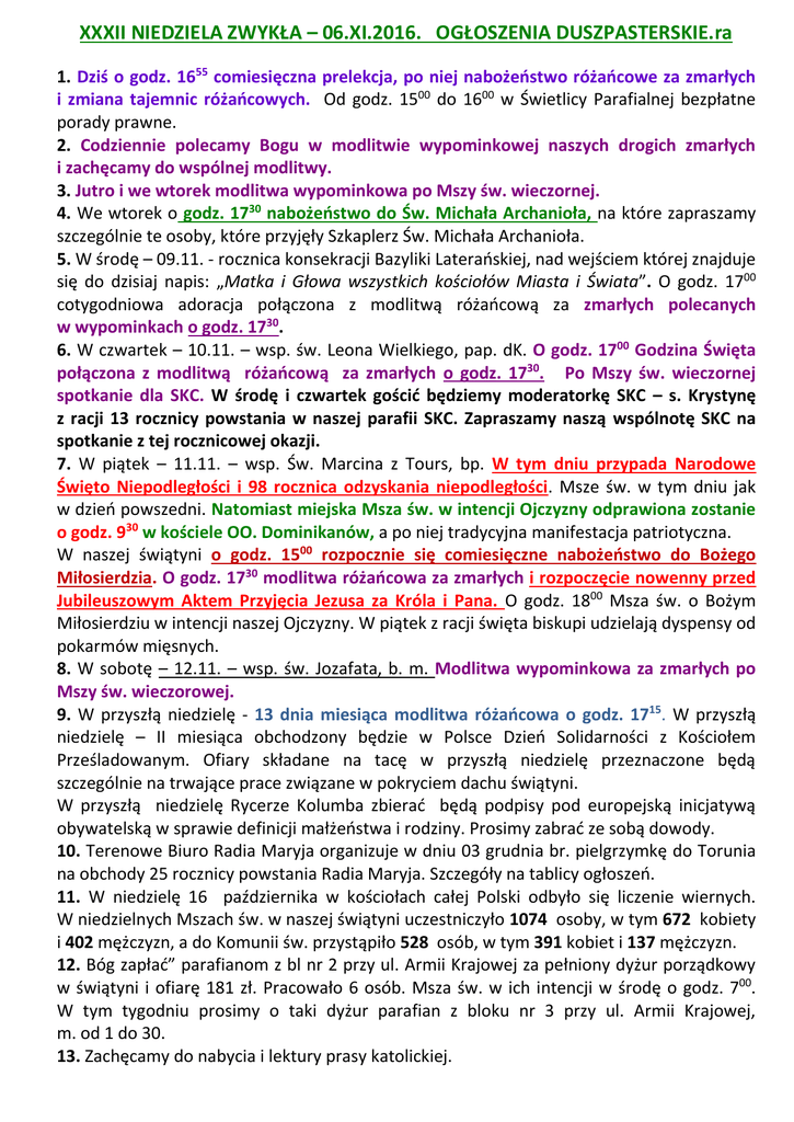 XXXII NIEDZIELA ZWYKŁA – 06.XI.2016. OGŁOSZENIA DUSZPASTERSKIE.ra 1. Dziś o godz. 1655 comiesięczna prelekcja, po niej nabożeństwo różańcowe za zmarłych i zmiana tajemnic różańcowych. Od godz. 1500 do 1600 w Świetlicy Parafialnej bezpłatne porady prawne. 2. Codziennie polecamy Bogu w modlitwie wypominkowej naszych drogich zmarłych i zachęcamy do wspólnej modlitwy. 3. Jutro i we wtorek modlitwa wypominkowa po Mszy św. wieczornej. 4. We wtorek o godz. 1730 nabożeństwo do Św. Michała Archanioła, na które zapraszamy szczególnie te osoby, które przyjęły Szkaplerz Św. Michała Archanioła. 5. W środę – 09.11. - rocznica konsekracji Bazyliki Laterańskiej, nad wejściem której znajduje się do dzisiaj napis: „Matka i Głowa wszystkich kościołów Miasta i Świata”. O godz. 1700 cotygodniowa adoracja połączona z modlitwą różańcową za zmarłych polecanych w wypominkach o godz. 1730. 6. W czwartek – 10.11. – wsp. św. Leona Wielkiego, pap. dK. O godz. 1700 Godzina Święta połączona z modlitwą różańcową za zmarłych o godz. 1730. Po Mszy św. wieczornej spotkanie dla SKC. W środę i czwartek gościć będziemy moderatorkę SKC – s. Krystynę z racji 13 rocznicy powstania w naszej parafii SKC. Zapraszamy naszą wspólnotę SKC na spotkanie z tej rocznicowej okazji. 7. W piątek – 11.11. – wsp. Św. Marcina z Tours, bp. W tym dniu przypada Narodowe Święto Niepodległości i 98 rocznica odzyskania niepodległości. Msze św. w tym dniu jak w dzień powszedni. Natomiast miejska Msza św. w intencji Ojczyzny odprawiona zostanie o godz. 930 w kościele OO. Dominikanów, a po niej tradycyjna manifestacja patriotyczna. W naszej świątyni o godz. 1500 rozpocznie się comiesięczne nabożeństwo do Bożego Miłosierdzia. O godz. 1730 modlitwa różańcowa za zmarłych i rozpoczęcie nowenny przed Jubileuszowym Aktem Przyjęcia Jezusa za Króla i Pana. O godz. 1800 Msza św. o Bożym Miłosierdziu w intencji naszej Ojczyzny. W piątek z racji święta biskupi udzielają dyspensy od pokarmów mięsnych. 8. W sobotę – 12.11. – wsp. św. Jozafata, b. m. Modlitwa wypominkowa za zmarłych po Mszy św. wieczorowej. 9. W przyszłą niedzielę - 13 dnia miesiąca modlitwa różańcowa o godz. 1715. W przyszłą niedzielę – II miesiąca obchodzony będzie w Polsce Dzień Solidarności z Kościołem Prześladowanym. Ofiary składane na tacę w przyszłą niedzielę przeznaczone będą szczególnie na trwające prace związane w pokryciem dachu świątyni. W przyszłą niedzielę Rycerze Kolumba zbierać będą podpisy pod europejską inicjatywą obywatelską w sprawie definicji małżeństwa i rodziny. Prosimy zabrać ze sobą dowody. 10. Terenowe Biuro Radia Maryja organizuje w dniu 03 grudnia br. pielgrzymkę do Torunia na obchody 25 rocznicy powstania Radia Maryja. Szczegóły na tablicy ogłoszeń. 11. W niedzielę 16 października w kościołach całej Polski odbyło się liczenie wiernych. W niedzielnych Mszach św. w naszej świątyni uczestniczyło 1074 osoby, w tym 672 kobiety i 402 mężczyzn, a do Komunii św. przystąpiło 528 osób, w tym 391 kobiet i 137 mężczyzn. 12. Bóg zapłać” parafianom z bl nr 2 przy ul. Armii Krajowej za pełniony dyżur porządkowy w świątyni i ofiarę 181 zł. Pracowało 6 osób. Msza św. w ich intencji w środę o godz. 700. W tym tygodniu prosimy o taki dyżur parafian z bloku nr 3 przy ul. Armii Krajowej, m. od 1 do 30. 13. Zachęcamy do nabycia i lektury prasy katolickiej.