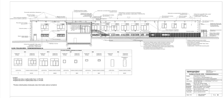 * Projektowane pokrycie 1xpapa termozgrzewalna nawierzchniowa Wywietrzaki starej kotłowni zdemontować Rynna do wymiany, proj. nowa PCV Projektowany daszek z płyt akrylowych na wspornikach ze stali nierdzewnej wg producenta daszku Projektowana deska okapowa 8x15cm Kraty wentylacyjne stropodachu wymienić na nowe metalowe ocynkowane Zardzewiałe wywietrzaki dachowe zdemontować wymienić na nowe Rura spustowa do wymiany, proj. nowa PCV Rura spustowa do wymiany, proj. nowa PCV SO12 SO4 Okno do wymiany SO12 SO12 SO7 SO7 SO7 SO12 SO12 N N Projektowany daszek z płyt akrylowych na wspornikach ze stali nierdzewnej wg producenta daszku N Ist. oczyścić i naprawić Uziom do wymiany Stare kratki nawiewne do demontażu-montaż nawiewników ściennych higrosterowalnych np. EHT AERECO lub równoważnych Okno do wymiany SD2 Rynna do wymiany, proj. nowa PCV Rura spustowa do wymiany, proj. nowa PCV SO12 * Projektowane wdmuchnięcie w przestrzeń wentylowaną stropodachu granulatu z wełny mineralnej o współczynniku λ=0,042 [W/m*K] gr. 15cm Uziom do wymiany SO7 Izolacja ścian metodą BSO "lekką -mokrą" styropianem o grubości 15 cm, o współczynniku λ =0,040 (W/mK) Uziom do wymiany SO4 SO7 SO7 Zardzewiałe wywietrzaki dachowe zdemontować wymienić na nowe Projektowana deska okapowa 8x15cm Daszek z poliwenglanu do demontażu Okno do wymiany Rura spustowa do wymiany, proj. nowa PCV * Wdmuchnięcie w przestrzeń wentylowaną stropodachu granulatu z wełny mineralnej o współczynniku λ=0,042 [W/m*K] gr. 15cm SO8 SO8 SO8 Murek i schody naprawić, ubytki uzupełnić SO8 9x1 5 35 N SO8 SO8 N N N N N Kraty wentylacyjne stropodachu wymienić na nowe metalowe, ocynkowane Balustrada do oczyszczenia i pomalowania Uziom do wymiany Płytki schodów i podestu rozebrać, wyłożyć nowe antypoślizgowe na kleju mrozoodpornym N Kraty do demontażu Kraty do demontażu Kraty do demontażu Mur piwniczny odkopać ,osuszyć, ocieplić styropianem o grubości 15 cm, o współczynniku λ =0,040 (W/mK) od poziomu górnej powierzchni fundamentu do dolnej ramy okien piwnicznych na obrębie piwnicy, w miejscu magazynu biblioteki,następnie wykonać nową izolację pionową przeciwwilgociową z foli kubełkowej do wysokości gruntu zakończyć listwą (ist. fundament pozmarować emulsją asfaltową). Powyżej listwy ścianę tynkować tynkiem żywicznym Odpadający tynk skuć Izolacja ścian metodą BSO "lekką -mokrą" styropianem o grubości 15 cm, o współczynniku λ =0,040 (W/mK) ELEW. POŁUDN.WEW. - TERMOMODERNIZACJA 1:100 Istniejący styropian ściany piwnicznej rozebrać, mur piwniczny osuszyć,wykonać nową izolację pionową przeciwwilgociową a następnie izolacja termoczna ścian metodą BSO "lekką -mokrą" styropianem o grubości 15 cm, o współczynniku λ =0,040 (W/mK) do poziomu gruntu STOLARKA OKIENNA I DRZWIOWA DO WYMIANY SO12 SO4 Kształt okna istniejący Kształt okna projektowany Kształt okna istniejący SO7 Kształt okna projektowany Kształt okna istniejący SO8 Kształt okna projektowany Kształt okna istniejący SD2 Kształt okna projektowany Kształt drzwi istniejący Kształt drzwi projektowany Drzwi techniczne blaszane ILOŚĆ SZTUK 2 WYMIAR W ŚWIETLE OŚCIEŻY ILOŚĆ SZTUK 241/221 6 WYMIAR W ŚWIETLE OŚCIEŻY 248/221 ILOŚĆ SZTUK 6 WYMIAR W ŚWIETLE OŚCIEŻY 80/91 ILOŚĆ SZTUK 6 WYMIAR W ŚWIETLE OŚCIEŻY 82/51 ILOŚĆ SZTUK 1 WYMIAR W ŚWIETLE OŚCIEŻY Audyty energetyczne Projekty budynków energooszczędnych Projekty termomodernizacji http://www.termoprojekt.eu 90/210 ELEWACJA POŁUDN. WEW. - TERMOMODERNIZACJA Inwestor Uwaga!!! *Projektowane okna o współczynniku Umax =1,3 W/m2K *Projektowane drzwi o współczynniku Umax=1,7 W/m2K *Wymiary stolarki podano orientacyjnie, okna i drzwi należy zmierzyć na budowie Obiekt Adres obiektu Projektant architektury: Sprawdzający architekturę: Województwo Wielkopolskie 61-713 Poznań, ul. Aleja Niepodległości nr 34 Termomodernizacja budynku internatu Wielkopolskiego Samorządowego Centrum Kształcenia Zawodowego i Ustawicznego 63-400 Ostrów Wlkp., ul. Limanowskiego 17, dz. nr 5/12, 6/4, 9/3, 10/8, 10/4 mgr inż. arch. Wojciech Gubała UAN-7342/71/81 spec. architekt. mgr inż. arch. Dagmara Doruch-Sobczak 74/WP-OIA/OKK/2010 spec. architekt. Opracował: Nr uprawnień: mgr inż. Andrzej Cempel Opracowała: mgr inż. Agnieszka Dominik Skala 1:100 BN-10.9/24/83 spec. konstr.budowl. Data opracowania Czerwiec 2015 Nr rys. 09