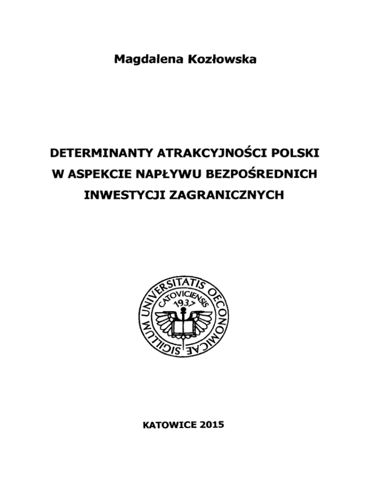 Magdalena Koztowska DETERMINANTY ATRAKCYJNOSCI POLSKI W ASPEKCIE NAPtYWU BEZPOSREDNICH INWESTYCJI ZAG RANICZNYCH KATOWICE 2015 Spis tresci Wst^p 7 Rozdziat 1 Teoretyczne aspekty BIZ 11 1.1. Podstawowe poj^cia 1.2. Wprowadzenie do przeglydu teorii BIZ 1.3. Przeglyd teorii BIZ 1.3.1. Teorie z punktu widzenia celöw i mozliwosci inwestora 1.3.2. Teorie z punktu widzenia lokalizacji 1.3.3. Teorie eklektyczne 1.4. Motywy podejmowania BIZ 11 24 30 30 45 61 69 Rozdziat 2 Atrakcyjnosc inwestycyjna z punktu widzenia lokalizacji BIZ 78 2.1. Atrakcyjnosc inwestycyjna 2.2. Klimat inwestycyjny jako glöwna determinanta atrakcyjnosci inwestycyjnej 2.3. Ryzyko inwestycyjne 2.4. Skutki BIZ dla kraju goszcz^ccgo w kontekscie wplywu najego atrakcyjnosc inwestycyjny 127 Rozdziaf 3 Atrakcyjnosc Polski dla BIZ w latach 1990-2013 134 3.1. Skala, dynamika i strukture BIZ 3.2. Uwarunkowania polityczne, makroekonomiczne i spoleczne 3.2.1. Polityka rzyduwobec BIZ 3.2.2. Instytucjonalne uwarunkowania polityki pieni^znej, budzetowej i kursowej 3.2.3. Stabilnosc systemu finansowego 3.2.4. Przeglcjd podstawowych wskazniköw makroekonomicznych 3.2.5. Dostgp do unijnych srodköw finansowych 3.2.6. Strategiczne polozenie 3.2.7. Znaczqcy rynek zbytu 3.2.8. Zasoby kadrowe 3.2.9. Atrakcyjnosc pobytu 78 92 108 134 136 136 140 141 149 151 152 153 153 154 3.2.10. Czionkostwo w strukturach mi^dzynarodowych 3.2.11. Wysoki poziom rozwoju spoiecznego 3.3. Uwarunkowania prawne 3.4. Dzialania promocyjne ukierunkowane na naph vv BIZ 3.5. Polska na tle wybranychkrajöw 3.6. Motywy i bariery naplywii BIZ do Polski 154 155 155 177 192 200 Rozdziai 4 Mezoekonomiczna atrakcyjnosc Polski dla BIZ - zmiany, stan obecny i perspektywy 206 4.1. Atrakcyjnosc sektorowa i branzowa 4.1.1. Glöwne determinanty atrakcyjnosci inwestycyjnej sektoröw i branz gospodarki 4.1.2. Dostgjnosc grantow rz^dowych 4.1.3. Mozliwosc uzyskania pomocy zagranicznej 4.1.4. Inne formy pomocy 4.1.5. Dzialalnosc grup przcdsi^biorstw i instytucji otoczenia biznesu 4.2. Atrakcyjnosc regionow 4.2.1. Funkcjonowanie SSE 4.2.2. Dostg) do fimduszy unijnych 4.2.3. Dzialania promocyjne 206 207 213 217 219 220 222 228 232 234 Zakonczenie 237 Bibliografia 245 Spisrysunköw 261 Spistabel 261