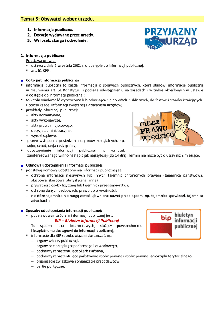 Temat 5: Obywatel wobec urzędu. 1. Informacja publiczna. 2. Decyzje wydawane przez urzędy. 3. Wniosek, skarga i odwołanie. 1. Informacja publiczna: Podstawa prawna: ustawa z dnia 6 września 2001 r. o dostępie do informacji publicznej, art. 61 KRP, Co to jest informacja publiczna? informacja publiczna to każda informacja o sprawach publicznych, która stanowi informację publiczną w rozumieniu art. 61 Konstytucji i podlega udostępnieniu na zasadach i w trybie określonych w ustawie o dostępie do informacji publicznej; to każda wiadomość wytworzona lub odnosząca się do władz publicznych, do faktów i stanów istniejących. Dotyczy każdej informacji związanej z działaniem urzędów; przykłady informacji publicznej: akty normatywne, akty wykonawcze, akty prawa miejscowego, decyzje administracyjne, wyroki sądowe, prawo wstępu na posiedzenia organów kolegialnych, np. sejm, senat, sesja rady gminy; udostępnienie informacji publicznej na wniosek zainteresowanego winno nastąpić jak najszybciej (do 14 dni). Termin nie może być dłuższy niż 2 miesiące. Odmowa udostępnienia informacji publicznej: podstawą odmowy udostępnienia informacji publicznej są: ochrona informacji niejawnych lub innych tajemnic chronionych prawem (tajemnica państwowa, służbowa, skarbowa, statystyczna i inne), prywatność osoby fizycznej lub tajemnica przedsiębiorstwa, ochrona danych osobowych, prawo do prywatności, niektóre tajemnice nie mogą zostać ujawnione nawet przed sądem, np. tajemnica spowiedzi, tajemnica adwokacka, Sposoby udostępniania informacji publicznej: podstawowym źródłem informacji publicznej jest: BIP – Biuletyn Informacji Publicznej To system stron internetowych, służący powszechnemu i bezpłatnemu dostępowi do informacji publicznej, informacje dla BIP są zobowiązani dostarczać, np: organy władzy publicznej, organy samorządu gospodarczego i zawodowego, podmioty reprezentujące Skarb Państwa, podmioty reprezentujące państwowe osoby prawne i osoby prawne samorządu terytorialnego, organizacje związkowe i organizacje pracodawców, partie polityczne. 2. Decyzje wydawane przez urzędy: Urząd – nazwy urzędów, z którymi obywatel styka się w codziennym życiu. w prawie administracyjnym KPA pojecie urzędu może być rozumiane w kilku znaczeniach: jako zwyczajowa nazwa zespołu kompetencji, np. urząd prezydenta, urząd wojewody, urząd burmistrza; jako element nazwy organu administracji publicznej, np. Naczelnik Urzędu Skarbowego; jako aparat pomocniczy organu administracji publicznej, np. Urząd Gminy, Urząd Miasta, Urząd Celny, Urząd Stanu Cywilnego. 3. Wniosek, skarga i odwołanie: Co trzeba wiedzieć? decyzja: informacja urzędu, która kończy sprawę. Decyzja rozstrzyga sprawę albo kończy postępowanie w danej instancji. Na decyzję służy odwołanie, które wstrzymuje wykonanie decyzji; postanowienie: informacja pojawiająca się w trakcie postępowania, nierozstrzygająca sprawę. Na postanowienie służy zażalenie, które nie wstrzymuje wykonania postanowienia. Co dalej? jeśli obywatel nie jest zadowolony z decyzji urzędu lub postanowienia, może się od nich odwołać. Musisz wtedy wnieść odwołanie wskazując, czego się domagasz (zmiany, uchylenia); obok odwołania od decyzji i zażalenia od postanowienia obywatelowi przysługuje inna możliwość wpływania na działanie władz – skarga i wniosek. By skarga mogła zostać rozpatrzona, musi spełniać określone wymogi: imię i nazwisko osoby składającej skargę, oznaczenie adresata, wskazanie naruszenia prawa, uzasadnienie, podpis; wniosek, to formalna prośba o podjęcie określonych działań lub wykonanie określonej czynności; skarga, to środek kontroli przysługujący każdemu podmiotowi. Przedmiotem skargi może być: zaniedbanie, nienależyte wykonanie, naruszenie praworządności, przewlekłość postępowania. Terminy: 7, 14, miesiąc lub dłużej.
