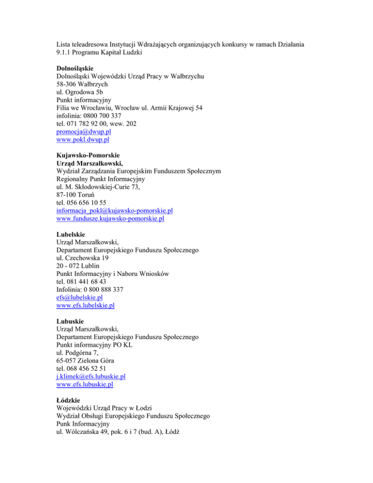 Lista teleadresowa Instytucji WdraŜających organizujących konkursy w ramach Działania 9.1.1 Programu Kapitał Ludzki Dolnośląskie Dolnośląski Wojewódzki Urząd Pracy w Wałbrzychu 58-306 Wałbrzych ul. Ogrodowa 5b Punkt informacyjny Filia we Wrocławiu, Wrocław ul. Armii Krajowej 54 infolinia: 0800 700 337 tel. 071 782 92 00, wew. 202 [email protected] www.pokl.dwup.pl Kujawsko-Pomorskie Urząd Marszałkowski, Wydział Zarządzania Europejskim Funduszem Społecznym Regionalny Punkt Informacyjny ul. M. Skłodowskiej-Curie 73, 87-100 Toruń tel. 056 656 10 55 [email protected] www.fundusze.kujawsko-pomorskie.pl Lubelskie Urząd Marszałkowski, Departament Europejskiego Funduszu Społecznego ul. Czechowska 19 20 - 072 Lublin Punkt Informacyjny i Naboru Wniosków tel. 081 441 68 43 Infolinia: 0 800 888 337 [email protected] www.efs.lubelskie.pl Lubuskie Urząd Marszałkowski, Departament Europejskiego Funduszu Społecznego Punkt informacyjny PO KL ul. Podgórna 7, 65-057 Zielona Góra tel. 068 456 52 51 [email protected] www.efs.lubuskie.pl Łódzkie Wojewódzki Urząd Pracy w Łodzi Wydział Obsługi Europejskiego Funduszu Społecznego Punk Informacyjny ul. Wólczańska 49, pok. 6 i 7 (bud. A), Łódź tel/fax. 042 634 88 30 tel. 042 632 01 12 w.119,120 [email protected] http://efs.wup.lodz.pl Małopolskie Wojewódzki Urząd Pracy w Krakowie Plac Na Stawach 1 30-107 Kraków Punkt Informacyjny EFS tel. 012 424 07 37 [email protected] www.wup-krakow.pl Mazowieckie Mazowiecka Jednostka WdraŜania Programów Unijnych ul. Jagiellońska 74 03-301 Warszawa Punkt Informacyjny dla Beneficjentów tel. 0 801 101 101 [email protected] www.mazowia.eu Opolskie Wojewódzki Urząd Pracy w Opolu ul. Głogowska 25c, 45-315 Opole Punkt Informacji o EFS pokój nr 14 tel. 077 44 16 754 fax. 077 44 16 599 [email protected] [email protected] www.pokl.opole.pl Podkarpackie Wojewódzki Urząd Pracy w Rzeszowie ul. Lisa Kuli 20 35-025 Rzeszów Wydział Koordynacji PO KL ul. Zygmuntowska 9 (I piętro) tel. 017 850 92 73 [email protected] www.wup-rzeszow.pl Podlaskie Urząd Marszałkowski Województwa Podlaskiego Departament Europejskiego Funduszu Społecznego ul. Gen. F. Kleeberga 20 15 - 691 Białystok tel. 085 654 82 00 Punkt Informacji pokój 10 tel. 0 801 308 013 [email protected] www.pokl.wrotapodlasia.pl Pomorskie Urząd Marszałkowski Województwa Pomorskiego Departament EFS ul. Augustyńskiego 2, 80 - 819 Gdańsk Główny Punkt Informacyjny Funduszy Europejskich tel. 058 32 68 148 fax. 058 32 68 134 [email protected] [email protected] Konsultacje telefoniczne i e-mailowe tel. 058 326 82 15 [email protected], [email protected], [email protected] Śląskie Urząd Marszałkowski Województwa Śląskiego, Wydział Europejskiego Funduszu Społecznego ul. Ligonia 46 40 - 037 Katowice Punkt Informacyjny Europejskiego Funduszu Społecznego tel. 032 202 41 40 fax. 032 254 54 71 [email protected] http://efs.silesia-region.pl/ Świętokrzyskie Świętokrzyskie Biuro Rozwoju Regionalnego Biuro Programu Operacyjnego Kapitał Ludzki ul. Jagiellońska 70 25 - 956 Kielce Punkt Informacyjny tel. 041 335 05 02 wew. 107 [email protected] www.pokl.sbrr.pl Warmińsko-Mazurskie Urząd Marszałkowski, Departament Europejskiego Funduszu Społecznego ul. Emilii Plater 1, 10 - 562 Olsztyn Informacje o POKL Biuro Informacji i Promocji, tel. 089 521 97 21 [email protected] www.efs.warmia.mazury.pl Wielkopolskie Wojewódzki Urząd Pracy w Poznaniu Wydział Funduszy Unii Europejskiej ul. Kościelna 37 60-537 Poznań Punkt Informacyjny EFS tel. 061 846 38 72 tel/fax. 061 846 38 23 [email protected] http://efs.wup.poznan.pl Zachodniopomorskie Wojewódzki Urząd Pracy w Szczecinie Wydział Europejskiego Funduszu Społecznego ul. A. Mickiewicza 41 Punkt Konsultacyjny EFS w Szczecinie ul. A. Mickiewicza 41, pok. 211 tel. 091 42 56 163 tel. 091 42 56 164 [email protected] Punkt Konsultacyjny EFS w Koszalinie ul. Słowiańska 15a, pok. 25,26 tel. 94 34 45 025/ 026 [email protected] www.wup.pl/pokl