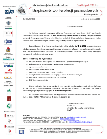 BMP11/06/2015 Racibórz, 11 czerwca 2015 Szanowni Państwo W imieniu redakcji magazynu „Chemia Przemysłowa” oraz firmy BMP’ serdecznie zapraszam Państwa do udziału w XIV Konferencji Naukowo-Technicznej „Bezpieczeństwo Instalacji Przemysłowych”, która odbędzie się w dniach 5-6 listopada br. w Kędzierzynie-Koźlu. Honorowym Gospodarzem jest Grupa Azoty Zakłady Azotowe Kędzierzyn S.A. Przewidujemy, iż w konferencji weźmie udział około 170 osób reprezentujących wiodące zakłady chemiczne, azotowe i tworzyw sztucznych, rafinerie i petrochemie, elektrownie oraz przyzakładowe straże pożarne. W konferencji wezmą również udział firmy oferujące rozwiązania techniczne dla ww. branż. Zakres tematyczny dla wystawców: • bezpieczeństwo rurociągów, baz paliwowych i systemów energetycznych, • zabezpieczenia przeciwpożarowe i przeciwwybuchowe, • aparatura pomiarowa, • automatyka zabezpieczeniowa, • systemy wczesnego wykrywania pożarów, • narzędzia informatyczne wspomagające pracę służb ratowniczych, • produkty i rozwiązania techniczne dla stref Ex, • BHP i ochrona osobista. Mamy nadzieję, iż program spotkania oraz szerokie możliwości promocji skłonią Państwa do udziału w przygotowywanym spotkaniu. Zachęcamy również do promocji na łamach konferencyjnego wydania magazynu „Chemia Przemysłowa”. W przypadku zainteresowania ofertą prosimy o przesłanie karty uczestnictwa faksem na numer 032 / 414 97 73 lub mailem do dnia 31 sierpnia br. Z wyrazami szacunku Beata Fas dyrektor ds. handlu i marketingu BMP’ Kontakt: Magdalena Kozicka, tel. 602 694 574,32/4153317 wew.38, [email protected] Beata Fas, tel. 694 848 853, 32/4153317 wew.33, [email protected] Ewa Zygmunt, tel. 606 337 384, 32/4153317 wew. 17, [email protected] Małgorzata Pozimska, tel. 792 679 044, 32/4152921 wew. 36, [email protected] FORMULARZ INFORMACYJNY I. Partner główny – oferta obejmuje: 1. 2. 3. 4. Przyznanie tytułu partnera głównego konferencji „Bezpieczeństwo instalacji przemysłowych”. Prezentację firmy do 15 min (istnieje możliwość podziału referatu na 2 części). Pokrycie kosztów udziału dla 3 osób z firmy (wyżywienie, materiały, zakwaterowanie 1 doba). Wyeksponowanie na zaproszeniach, plakatach, transparentach i pismach oraz w obiektach, w których będzie przebiegać impreza, nazwy firmy i logo jako sponsora konferencji. 5. Eksponowanie firmy podczas całej imprezy (stoisko w atrakcyjnym miejscu, prezentacja w dobrym czasie, możliwość wystawienia rollupów na sali konferencyjnej). 6. Udostępnienie powierzchni wystawienniczej do 6 m2 (zabudowa własna firmy). 7. Reklama A4 w magazynie „Chemia Przemysłowa”. 8. Możliwość ustawienia rollupu na sali konferencyjnej. 9. Zamieszczenie informacji o firmie w materiałach konferencyjnych (1 strona B5, wersja czarno-biała). 10. Baner na stronie portalu www.kierunekchemia.pl przez 1 miesiąc. Koszt promocji: 17 000 zł II. Partner – oferta obejmuje: 1. 2. 3. 4. Przyznanie tytułu partnera konferencji „Bezpieczeństwo instalacji przemysłowych”. Prezentację firmy do 15 min. Pokrycie kosztów udziału dla 2 osób z firmy (wyżywienie, materiały, zakwaterowanie 1 doba Hotel Izabella). Wyeksponowanie na zaproszeniach, plakatach, transparentach i pismach oraz w obiektach, w których będzie przebiegać impreza, nazwy firmy i logo jako partnera. 5. Eksponowanie firmy podczas całej imprezy (stoisko w atrakcyjnym miejscu, prezentacja w dobrym czasie, możliwość wystawienia rollupów na sali konferencyjnej). 6. Udostępnienie powierzchni wystawienniczej do 4 m2 (zabudowa własna firmy). 7. Reklama A4 w magazynie „Chemia Przemysłowa”. 8. Możliwość ustawienia rollupu na sali konferencyjnej. 9. Zamieszczenie informacji o firmie w materiałach konferencyjnych (1 strona B5, wersja czarno-biała). 10. Baner na stronie portalu www.kierunekchemia.pl przez 1 miesiąc. Koszt promocji: 13 000 zł III. Inne formy promocji: a) PAKIET I (stoisko + prezentacja + reklama): 1. 2. 3. 4. b) Koszt: 6 500 zł PAKIET II (prezentacja + reklama): 1. 2. 3. c) Powierzchnia wystawiennicza 2 m2 (zabudowa własna). Prezentacja firmy do 15 min (prezentację należy dostarczyć do operatora sprzętu na nośniku elektronicznym na ok. 2 godz. przed prezentacją). Reklama A4 w magazynie „Chemia Przemysłowa”. Zamieszczenie informacji o firmie w materiałach konferencyjnych (1 strona, wersja czarno-biała). Prezentacja firmy do 15 min. Zamieszczenie informacji o firmie w materiałach konferencyjnych (1 strona, wersja czarno-biała). Reklama A4 w magazynie „Chemia Przemysłowa”. Koszt: 4 900 zł PAKIET III (prezentacja): 4. 5. Prezentacja firmy do 15 min. Zamieszczenie informacji o firmie w materiałach konferencyjnych (1 strona, wersja czarno-biała). Koszt: 3 000 zł d) PAKIET IV (stoisko + reklama): 1. 2. 3. e) Koszt: 3 900 zł PAKIET V (stoisko): 1. 2. f) Powierzchnia wystawiennicza 2 m2 (zabudowa własna). Reklama A4 w magazynie „Chemia Przemysłowa”. Zamieszczenie informacji o firmie w materiałach konferencyjnych (1 strona, wersja czarno-biała). Powierzchnia wystawiennicza 2 m2 (zabudowa własna). Zamieszczenie informacji o firmie w materiałach konferencyjnych (1 strona, wersja czarno-biała). Koszt: 2 500 zł PAKIET VI (baner): 1. 2. Powierzchnia na wystawienie banera reklamowego w części wystawienniczej (zapewniamy powierzchnię wystawienniczą – szerokość do 1,5 m). Zamieszczenie informacji o firmie w materiałach konferencyjnych (1 strona, wersja czarno-biała). Koszt: 900 zł IV. Promocja w materiałach konferencyjnych: a) wpis w materiałach konferencyjnych (cz/b, 1xB5): 200 zł b) dystrybucja materiałów reklamowych firmy poprzez umieszczenie ich w materiałach konferencyjnych (1 str. A4): 700 zł c) baner na www.kierunekchemia.pl: 500 zł V. Roczna prenumerata magazynu „Chemia Przemysłowa”: 110,57 zł VI. Koszty uczestnictwa (obowiązkowe): - dla 1 osoby przy wykupi
