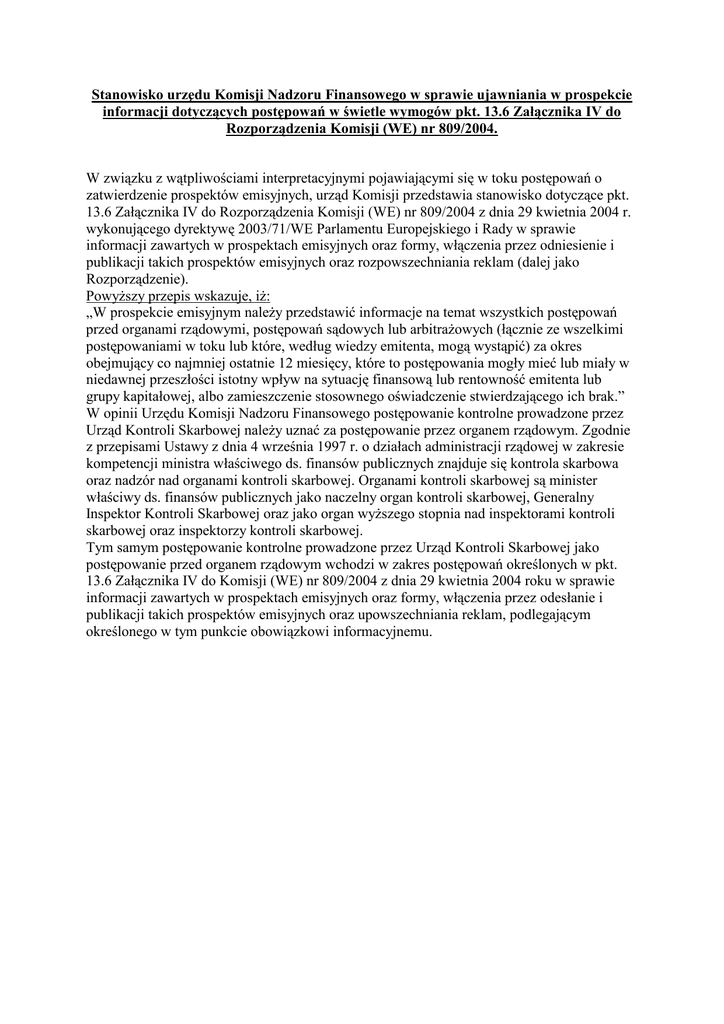 Stanowisko urzędu Komisji Nadzoru Finansowego w sprawie ujawniania w prospekcie informacji dotyczących postępowań w świetle wymogów pkt. 13.6 Załącznika IV do Rozporządzenia Komisji (WE) nr 809/2004. W związku z wątpliwościami interpretacyjnymi pojawiającymi się w toku postępowań o zatwierdzenie prospektów emisyjnych, urząd Komisji przedstawia stanowisko dotyczące pkt. 13.6 Załącznika IV do Rozporządzenia Komisji (WE) nr 809/2004 z dnia 29 kwietnia 2004 r. wykonującego dyrektywę 2003/71/WE Parlamentu Europejskiego i Rady w sprawie informacji zawartych w prospektach emisyjnych oraz formy, włączenia przez odniesienie i publikacji takich prospektów emisyjnych oraz rozpowszechniania reklam (dalej jako Rozporządzenie). PowyŜszy przepis wskazuje, iŜ: „W prospekcie emisyjnym naleŜy przedstawić informacje na temat wszystkich postępowań przed organami rządowymi, postępowań sądowych lub arbitraŜowych (łącznie ze wszelkimi postępowaniami w toku lub które, według wiedzy emitenta, mogą wystąpić) za okres obejmujący co najmniej ostatnie 12 miesięcy, które to postępowania mogły mieć lub miały w niedawnej przeszłości istotny wpływ na sytuację finansową lub rentowność emitenta lub grupy kapitałowej, albo zamieszczenie stosownego oświadczenie stwierdzającego ich brak.” W opinii Urzędu Komisji Nadzoru Finansowego postępowanie kontrolne prowadzone przez Urząd Kontroli Skarbowej naleŜy uznać za postępowanie przez organem rządowym. Zgodnie z przepisami Ustawy z dnia 4 września 1997 r. o działach administracji rządowej w zakresie kompetencji ministra właściwego ds. finansów publicznych znajduje się kontrola skarbowa oraz nadzór nad organami kontroli skarbowej. Organami kontroli skarbowej są minister właściwy ds. finansów publicznych jako naczelny organ kontroli skarbowej, Generalny Inspektor Kontroli Skarbowej oraz jako organ wyŜszego stopnia nad inspektorami kontroli skarbowej oraz inspektorzy kontroli skarbowej. Tym samym postępowanie kontrolne prowadzone przez Urząd Kontroli Skarbowej jako postępowanie przed organem rządowym wchodzi w zakres postępowań określonych w pkt. 13.6 Załącznika IV do Komisji (WE) nr 809/2004 z dnia 29 kwietnia 2004 roku w sprawie informacji zawartych w prospektach emisyjnych oraz formy, włączenia przez odesłanie i publikacji takich prospektów emisyjnych oraz upowszechniania reklam, podlegającym określonego w tym punkcie obowiązkowi informacyjnemu.