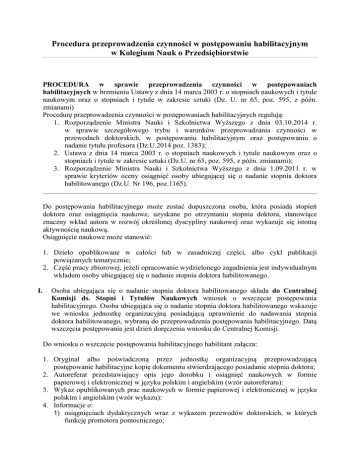 Procedura przeprowadzenia czynności w postępowaniu habilitacyjnym w Kolegium Nauk o Przedsiębiorstwie PROCEDURA w sprawie przeprowadzenia czynności w postępowaniach habilitacyjnych w brzmieniu Ustawy z dnia 14 marca 2003 r. o stopniach naukowych i tytule naukowym oraz o stopniach i tytule w zakresie sztuki (Dz. U. nr 65, poz. 595, z późn. zmianami) Procedurę przeprowadzenia czynności w postępowaniach habilitacyjnych regulują: 1. Rozporządzenie Ministra Nauki i Szkolnictwa Wyższego z dnia 03.10.2014 r. w sprawie szczegółowego trybu i warunków przeprowadzania czynności w przewodach doktorskich, w postępowaniu habilitacyjnym oraz postępowaniu o nadanie tytułu profesora (Dz.U.2014 poz. 1383); 2. Ustawa z dnia 14 marca 2003 r. o stopniach naukowych i tytule naukowym oraz o stopniach i tytule w zakresie sztuki (Dz.U. nr 65, poz. 595, z późn. zmianami); 3. Rozporządzenie Ministra Nauki i Szkolnictwa Wyższego z dnia 1.09.2011 r. w sprawie kryteriów oceny osiągnięć osoby ubiegającej się o nadanie stopnia doktora habilitowanego (Dz.U. Nr 196, poz.1165). Do postępowania habilitacyjnego może zostać dopuszczona osoba, która posiada stopień doktora oraz osiągnięcia naukowe, uzyskane po otrzymaniu stopnia doktora, stanowiące znaczny wkład autora w rozwój określonej dyscypliny naukowej oraz wykazuje się istotną aktywnością naukową. Osiągnięcie naukowe może stanowić: 1. Dzieło opublikowane w całości lub w zasadniczej części, albo cykl publikacji powiązanych tematycznie; 2. Część pracy zbiorowej, jeżeli opracowanie wydzielonego zagadnienia jest indywidualnym wkładem osoby ubiegającej się o nadanie stopnia doktora habilitowanego. I. Osoba ubiegająca się o nadanie stopnia doktora habilitowanego składa do Centralnej Komisji ds. Stopni i Tytułów Naukowych wniosek o wszczęcie postępowania habilitacyjnego. Osoba ubiegająca się o nadanie stopnia doktora habilitowanego wskazuje we wniosku jednostkę organizacyjną posiadającą uprawnienie do nadawania stopnia doktora habilitowanego, wybraną do przeprowadzenia postępowania habilitacyjnego. Datą wszczęcia postępowania jest dzień doręczenia wniosku do Centralnej Komisji. Do wniosku o wszczęcie postępowania habilitacyjnego habilitant załącza: 1. Oryginał albo poświadczoną przez jednostkę organizacyjną przeprowadzającą postępowanie habilitacyjne kopię dokumentu stwierdzającego posiadanie stopnia doktora; 2. Autoreferat przedstawiający opis jego dorobku i osiągnięć naukowych w formie papierowej i elektronicznej w języku polskim i angielskim (wzór autoreferatu): 3. Wykaz opublikowanych prac naukowych w formie papierowej i elektronicznej w języku polskim i angielskim (wzór wykazu): 4. Informacje o: 1) osiągnięciach dydaktycznych wraz z wykazem przewodów doktorskich, w których funkcję promotora pomocniczego; 2) współpracy z instytucjami, organizacjami i towarzystwami naukowymi w kraju i 3) 4) 5) 6) zagranicą; działalności popularyzującej naukę; analizę bibliometryczną potwierdzoną przez Bibliotekę SGH na podstawie złożonego wniosku i załączonych materiałów. Informacje znajdują się pod adresem: http:/biblioteka.sgh.waw.pl/pl/bibliometria tekty publikacji naukowych, które stanowią podstawę wszczęcia postepowania habilitacyjnego; informacje umożliwiające bezpośredni kontakt z wnioskodawcą (adres zameldowania, nr telefonu, adres e-mail). 5. W przypadku gdy osiągnięciem naukowym jest część pracy zbiorowej, habilitant przedkłada oświadczenia wszystkich jej współautorów, określające indywidualny wkład każdego z nich w jej powstanie. Habilitant jest zwolniony z obowiązku przedłożenia oświadczenia w przypadku śmierci współautora, uznania go za zmarłego albo jego trwałego uszczerbku na zdrowiu, uniemożliwiającego uzyskanie wymaganego oświadczenia. Wkład we współautorstwo powinien być określony bardzo precyzyjnie, w tym również procentowo. Kryteria oceny osiągnięć habilitanta zawiera Rozporządzenie Ministra Nauki i Szkolnictwa Wyższego z dnia 1.09.2011 r. w sprawie kryteriów oceny osiągnięć osoby ubiegającej się o nadanie stopnia doktora habilitowanego. II. III. IV. V. VI. VII. Wniosek o wszczęcie postępowania habilitacyjnego wraz załącznikami habilitant przedkłada w formie papierowej i elektronicznej. Wniosek o wszczęcie postępowania habilitacyjnego wraz z autoreferatem habilitanta zostaje zamieszczony na stronie internetowej Centralnej Komisji. Centralna Komisja w terminie 14 dni dokonuje oceny formalnej wniosku. W przypadku uznania wniosku za niekompletny lub nieodpowiadający wymogom ustawy, Centralna Komisja wzywa do uzupełnienia, wskazując sposób i wyznaczając termin uzupełnienia wniosku Po dokonaniu oceny formalnej wniosku Centralna Komisja zwraca habilitantowi oryginał dokumentu stwierdzającego posiadanie stopnia doktora. Centralna Komisja występuje do rady jednostki wskazanej przez habilitanta o podjęcie uchwały w sprawie wyrażenia zgody na przeprowadzenie postępowania habilitacyjnego i wskazania sekretarza komisji habilitacyjnej oraz jednego recenzenta. Uchwała Rady Kolegium w tej sprawie podejmowana jest w głosowaniu tajnym. W przypadku, gdy Rada wskazana przez wnioskodawcę nie wyrazi zgody na przeprowadzenie postępowania habilitacyjnego, postępowanie prowadzi jednostka organizacyjna posiadająca uprawnienia do nadawania stopnia doktora habilitowanego wyznaczona przez Centralną Komisję. Centralna Komisja wyznacza inną jednostkę do przeprowadzenia przewodu w ciągu 14 dni. Koszty postepowania habilitacyjnego osób niebędących pracownikami Kolegium Nauk o Przedsiębiorstwie przejmuje jednostka zatrudniająca habilitanta lub sam kandydat do stopnia doktora habilitowanego na zasadach określonych w stosownej umowie. Centralna Komisja w terminie 6 tygodni od dnia otrzymania wniosku spełniającego wymagania formalne powołuje komisję habilitacyjną w celu przeprowadzenia 