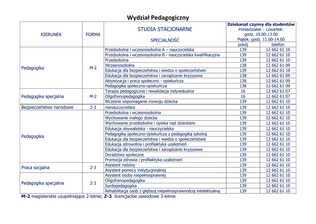 Wydział Pedagogiczny KIERUNEK FORMA STUDIA STACJONARNE SPECJALNOŚĆ Pedagogika M-2 Pedagogika specjalna M-2 Bezpieczeństwo narodowe Z-3 Pedagogika Praca socjalna Z-3 Pedagogika specjalna Z-3 Przedszkolna i wczesnoszkolna A – nauczycielska Przedszkolna i wczesnoszkolna B - nauczycielska kwalifikacyjna Przedszkolna Wczesnoszkolna Edukacja dla bezpieczeństwa i wiedza o społeczeństwie Edukacja dla bezpieczeństwa i zarządzanie kryzysowe Aktywizacja i praca społeczno - opiekuńcza Pedagogika społeczno-opiekuńcza Terapia pedagogiczna i rewalidacja indywidualna Oligofrenopedagogika Wczesne wspomaganie rozwoju dziecka nienauczycielska Przedszkolna i wczesnoszkolna Wychowanie małego dziecka Wychowanie przedszkolne i opieka nad dzieckiem Edukacja obywatelska - nauczycielska Pedagogika społeczno-opiekuńcza z pedagogiką szkolną Edukacja dla bezpieczeństwa i wiedza o społeczeństwie Edukacja zdrowotna i profilaktyka uzależnień Edukacja dla bezpieczeństwa i zarządzanie kryzysowe Doradztwo społeczne Promocja zdrowia i profilaktyka uzależnień Asystent rodziny Asystent pomocy instytucjonalnej Asystent osoby niepełnosprawnej Oligofrenopedagogika Surdopedagogika Rehabilitacja osób z głębszą niepełnosprawnością intelektualną M-2 magisterskie uzupełniające 2-letnie; Z-3 licencjackie zawodowe 3-letnie Dziekanat czynny dla studentów Poniedziałek – czwartek: godz. 10.00-13.00 Piątek: godz. 11.00-14.00 pokój telefon 139 12 662 61 10 139 12 662 61 10 139 12 662 61 10 138 12 662 61 09 139 12 662 61 10 138 12 662 61 09 138 12 662 61 09 138 12 662 61 09 16 12 662 61 07 16 12 662 61 07 139 12 662 61 10 139 12 662 61 10 139 12 662 61 10 139 12 662 61 10 139 12 662 61 10 139 12 662 61 10 139 12 662 61 10 139 12 662 61 10 139 12 662 61 10 139 12 662 61 10 139 12 662 61 10 139 12 662 61 10 139 12 662 61 10 139 12 662 61 10 139 12 662 61 10 139 12 662 61 10 139 12 662 61 10 139 12 662 61 10
