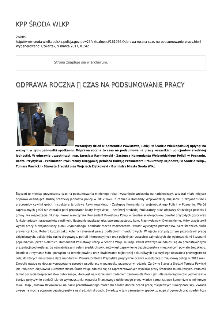 KPP ŚRODA WLKP Źródło: http://www.sroda-wielkopolska.policja.gov.pl/w25/aktualnosci/161926,Odprawa-roczna-czas-na-podsumowanie-pracy.html Wygenerowano: Czwartek, 9 marca 2017, 01:42 Strona znajduje się w archiwum. ODPRAWA ROCZNA CZAS NA PODSUMOWANIE PRACY Wczorajszy dzień w Komendzie Powiatowej Policji w Środzie Wielkopolskiej upłynął na ważnym w życiu jednostki spotkaniu. Odprawa roczna to czas na podsumowania pracy wszystkich policjantów średzkiej jednostki. W odprawie uczestniczył insp. Jarosław Rzymkowski - Zastępca Komendanta Wojewódzkiego Policji w Poznaniu, Beata Przybylska - Prokurator Prokuratury Okręgowej pełniąca funkcję Prokuratora Prokuratury Rejonowej w Środzie Wlkp., Tomasz Pawlicki – Starosta Średzki oraz Wojciech Ziętkowski – Burmistrz Miasta Środa Wlkp. Styczeń to miesiąc przynoszący czas na podsumowania minionego roku i wysunięcie wniosków na nadchodzący. Wczoraj miała miejsce odprawa oceniająca służbę średzkiej jednostki policji w 2012 roku. Z ramienia Komendy Wojewódzkiej miejscowi funkcjonariusze i pracownicy cywilni gościli inspektora Jarosława Rzymkowskiego - Zastępcę Komendanta Wojewódzkiego Policji w Poznaniu. Wśród zaproszonych gości nie zabrakło pani prokurator Beaty Przybylskej – szefowej średzkiej Prokuratury oraz włodarzy średzkiego powiatu i gminy. Na rozpoczęcie mł.insp. Paweł Wawrzyniak Komendant Powiatowy Policji w Środzie Wielkopolskiej powitał przybyłych gości oraz funkcjonariuszy i pracowników cywilnych. Następnie przekazał głos swojemu zastępcy kom. Przemysławowi Dymarskiemu, który przedstawił wyniki pracy funkcjonariuszy pionu kryminalnego. Komisarz mocno zaakcentował wzrost wykrytych przestępstw. Szef średzkich służb prewencji kom. Robert Łuczak jako kolejny referował pracę podległych mundurowych. W ujęciu statystycznym przedstawił pracę dzielnicowych, policjantów ruchu drogowego, patroli interwencyjnych oraz policyjnych zespołów zajmujących się wykroczeniami i czynami popełnianymi przez nieletnich. Komendant Powiatowy Policji w Środzie Wlkp. mł.insp. Paweł Wawrzyniak odniósł się do przedstawionych prezentacji podkreślając, że najważniejszym celem średzkich policjantów jest zapewnienie bezpieczeństwa mieszkańcom powiatu średzkiego. Dbanie o utrzymanie ładu i porządku na terenie powiatu oraz likwidowanie najbardziej dokuczliwych dla zwykłego obywatela przestępstw to cele, do których nieustannie dążą mundurowi. Prokurator Beata Przybylska pozytywnie oceniła współpracę z miejscową policją w 2012 roku. Zwróciła uwagę na dobrze wypracowane sposoby współpracy w przypadku przemocy w rodzinie. Zarówno Starosta Średzki Tomasz Pawlicki jak i Wojciech Ziętkowski Burmistrz Miasta Środa Wlkp. odnieśli się do zaprezentowanych wyników pracy średzkich mundurowych. Podnieśli temat poczucia bezpieczeństwa publicznego, które jest najważniejszym zadaniem zarówno dla Policji jak i dla samorządowców. Jednocześnie bardzo pozytywnie odnieśli się do wykorzystania wsparcia finansowego udzielonego przez władze samorządowe komendzie w minionym roku. Insp. Jarosław Rzymkowski na bazie przedstawionego materiału bardzo dobrze ocenił pracę miejscowych funkcjonariuszy. Zwrócił uwagę na mocną poprawę bezpieczeństwa na średzkich drogach. Świadczy o tym zauważalny spadek zdarzeń drogowych oraz spadek liczy osób rannych i zabitych w 2012 roku. Komendant podkreślił, że Policja ma dużo obszarów na których działa, jednak celem pracy mundurowych powinno być dążenie do zmniejszania występowania przestępstw oraz do zwiększania ich wykrywalności. J. Rzymkowski pochwalił również miejscowych policjantów za wzrost liczby zatrzymań sprawców przestępstw na gorącym uczynku. Zastępca komendanta w swym wystąpieniu odniósł się do zmian i reorganizacji związanych z działaniem garnizonu wielopolskiego dotyczących m.in. funkcjonowania laboratoriów policyjnych czy stworzenia Centrum Poszukiwań Osób Zaginionych. Inspektor podziękował policjantom za pracę związaną z zabezpieczeniem Mistrzostw EURO i za zaangażowanie w codzienne wykonywanie obowiązków służbowych. GALERIA FOTO: /jednostka/OdprawaRoczna/rok2012 Ocena: 0/5 (0) Tweetnij