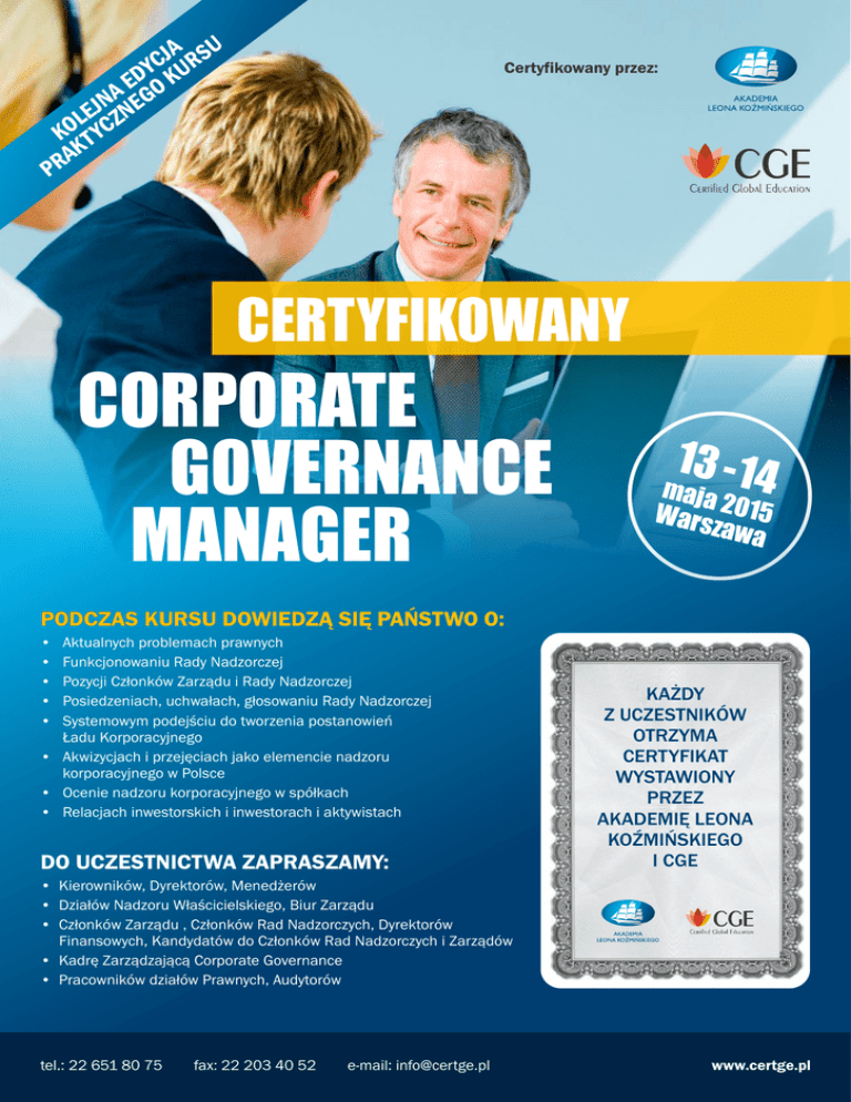 JA RSU C DY KU E O NA EG J LE CZN O K TY AK R P Certyfikowany przez: CERTYFIKOWANY CORPORATE GOVERNANCE MANAGER 13 - 14 maja Wars 2015 zawa PODCZAS KURSU DOWIEDZĄ SIĘ PAŃSTWO O: • • • • • Aktualnych problemach prawnych Funkcjonowaniu Rady Nadzorczej Pozycji Członków Zarządu i Rady Nadzorczej Posiedzeniach, uchwałach, głosowaniu Rady Nadzorczej Systemowym podejściu do tworzenia postanowień Ładu Korporacyjnego • Akwizycjach i przejęciach jako elemencie nadzoru korporacyjnego w Polsce • Ocenie nadzoru korporacyjnego w spółkach • Relacjach inwestorskich i inwestorach i aktywistach DO UCZESTNICTWA ZAPRASZAMY: KAŻDY Z UCZESTNIKÓW OTRZYMA CERTYFIKAT WYSTAWIONY PRZEZ AKADEMIĘ LEONA KOŹMIŃSKIEGO I CGE • Kierowników, Dyrektorów, Menedżerów • Działów Nadzoru Właścicielskiego, Biur Zarządu • Członków Zarządu , Członków Rad Nadzorczych, Dyrektorów Finansowych, Kandydatów do Członków Rad Nadzorczych i Zarządów • Kadrę Zarządzającą Corporate Governance • Pracowników działów Prawnych, Audytorów tel.: 22 651 80 75 fax: 22 203 40 52 e-mail: [email protected] www.certge.pl CERTYFIKOWANY CORPORATE GOVERNANCE MANAGER PARTNER KURSU: Akademia Leona Koźmińśkiego Akademia Leona Koźmińskiego jest niepubliczną szkołą wyższą o statusie akademii. Została założona w 1993 roku. Według międzynarodowego rankingu „Financial Times” jest najlepszą szkołą biznesu w Europie Środkowo-Wschodniej. Od 13 lat zwycięża w krajowych rankingach edukacyjnych publikowanych przez „Perspektywy” i „Rzecz-pospolitą”. Posiada międzynarodowe akredytacje AACSB, EQUIS i AMBA. W ramach tzw. oceny parametrycznej jednostek naukowych dla badań w zakresie nauk ekonomicznych uzyskała najwyższą, pierwszą kategorię.W ALK studiuje 8000 osób. Akademia prowadzi studia licencjackie, magisterskie i doktoranckie w języku polskim i angielskim, a także studia podyplomowe, w tym programy MBA. W ofercie uczelni znajdują się również szkolenia, kursy, korporacyjne programy rozwojowe, organizacja konferencji, seminariów i spotkań, pozyskiwanie zewnętrznego finansowania na usługi szkoleniowo-doradcze oraz badawcze. Certified Global Education Sp. z o.o. jest firmą szkoleniową od kilku lat obecną na polskim rynku kładącą nacisk na edukację biznesową popartą certyfikatami. Dąży do tego by być platformą szkoleniową udostępniającą klientom najwyższej jakości certyfikowane szkolenia ze wszystkich dziedzin zarówno w rozumieniu funkcjonalnym biorąc pod uwagę funkcje/działy w organizacji jak i branżowym uwzględniając specyfikę poszczególnych sektorów gospodarczych. Naszym celem nadrzędnym jest spełnianie potrzeb biznesowych naszych klientów poprzez realizację szkoleń o najwyższych standardach jakości bazujących na międzynarodowym know-how w zakresie edukacji biznesowej. Wszystkie budowane przez nas programy przygotowywane są w oparciu o szczegółowe badania rynku i analizowane są pod kątem ich praktycznej przydatności w biznesie. Trenerzy i prelegenci, których zapraszamy wywodzą się przede wszystkim ze środowisk biznesowych, nie brakuje wśród nich również prawników, autorytetów naukowych jak i przedstawicieli administracji publicznej. Szanowni Państwo, zapraszamy do uczestnictwa w kursie pt. „Certyfikowany Corporate Governance Manager”, który poprowadzą wybitni eksperci, praktycy, prawnicy. Partnerem kursu jest Akademia Leona Koźmińskiego. Kurs ukierunkowany jest w szczególności dla obecnych i przyszłych członków zarządu i rad nadzorczych. Udział w grupie składających się z osób pochodzących z różnych spółek pozwala zapoznać się z funkcjonowaniem organów w różnych spółkach. W trakcie kursu uczestnicy zapoznają się z najnowszymi trendami w zakresie wewnętrznego funkcjonowania zarządów, rad nadzorczych oraz ogólnych stosunków między organami spółki. Celem kursu jest zapoznanie uczestników jak można wzmocnić odpowiedzialność i wydajność organów, a jednocześnie poprawiając swoją zdolność do przyczynienia się znacząco do działań korporacyjnych nadzoru. Uczestnicy w trakcie kursu dowiedzą się jak zaprojektować odpowiednie struktury i dobrać odpowiednich członków, aby skutecznie nadzorować i monitorować działalność zarządu, w tym także w trakcie kryzysu. Istotnym elementem będzie także zapoznanie się uczestników z systemowym podejściem do tworzenia postanowień Ładu Korporacyjnego. Po ukończeniu kursu uczestniczy nabędą wiedze i narzędzia, które powinny ich wspomagać w działaniach mających na celu zapewnienia większego nadzoru korporacyjnego. Uczestnicy kursu otrzymają certyfikat wydany przez Akademię Leona Koźmińskiego i CGE. Serdecznie zapraszamy do uczestnictwa. Z poważaniem, Anna Milewska Kierownik projektu KONTAKT Anna Milewska tel.: 22 651 80 75 www.certge.pl fax: 22 203 40 52 e-mail: [email protected] Kierownik projektu e-mail: [email protected] tel: 604 152 181 fax: 22 203 40 52 13 - 14 maja Wars 2015 zawa CERTYFIKOWANY CORPORATE GOVERNANCE MANAGER Dzień 1 SESJA I 9:30 – 12:30 AKTUALNE PROBLEMY PRAWNE • Ile „kosztują” błędy formalne w praktyce • „walki akcjonariuszy” w praktyce • jak pozbawia się akcjonariusza będącego spółką kapitałową prawa głosu na zgromadzeniu spółki kapitałowej • jak mniejszościowi akcjonariusze mogą realnie bronić się przed działaniami akcjonariuszy większościowych i działaniami organów spółek • jak próbowano wrogo przejąć znaną spółkę i dlaczego nic z tego nie wyszło GŁÓWNE ASPEKTY FUNKCJONOWANIA RADY NADZORCZEJ • Powołanie i mandat członka Rady Nadzorczej • Kadencja, prawa i obowiązki przewodniczącego rady, wiceprzewodniczącego rady, sekretarza i pozostałych członków rady • Członek rady delegowany do czasowego wykonywania czynności członka zarządu • Absolutorium, wygaśnięcie mandatu POZYCJA CZŁONKÓW ZARZ
