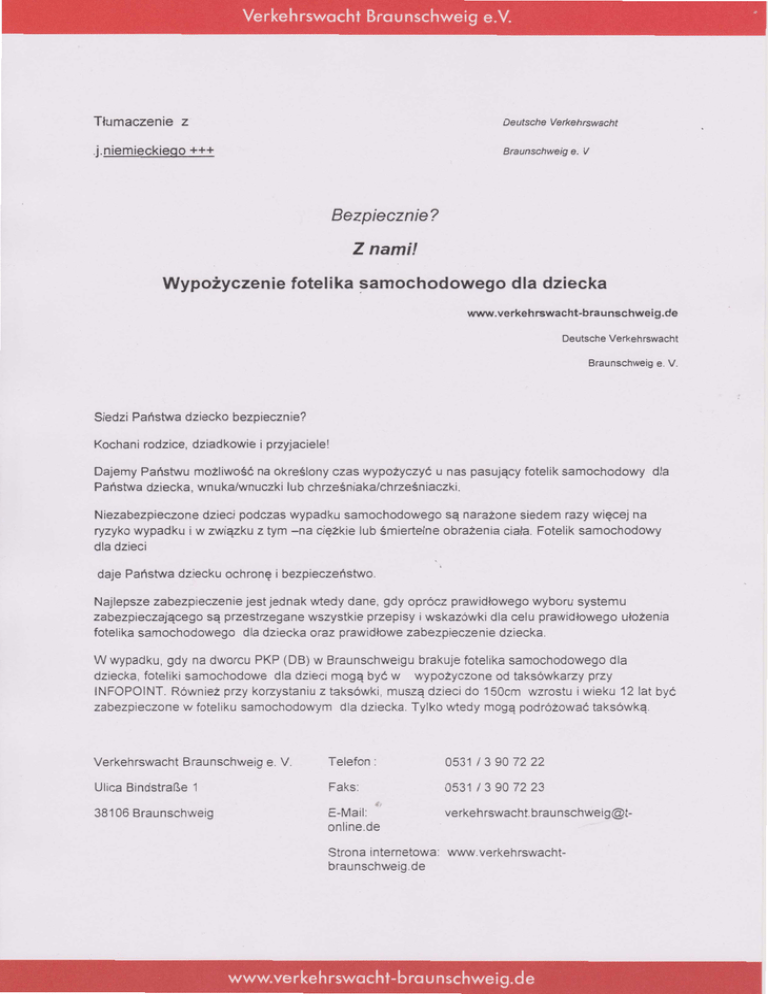 Verkehrswacht Braunschweig e.V. . Tlurnaczenie z Deutsche Verkehrswacht .j.niemieckiego +++ Braunschweig e. V Bezpiecznie? Z nami! Wypozyczenie fotelika samochodowego dia dziecka www.verkehrswacht-braunschweig.de Deutsche Verkehrswacht Braunschweig e. V. Siedzi Par'lstwa dziecko bezpiecznie? Kochani rodzice, dziadkowie i przyjaciele! Oajemy Par'lstwu rnozliwosc na okreslony czas wypozyczyc u nas pasujacy fotelik samochodowy Par'lstwa dziecka, wnuka/wnuczki lub chrzesniaka/chrzesniaczki. dia Niezabezpieczone dzieci podczas wypadku samochodowego sa narazone siedem razy wiecej na ryzyko wypadku i w zwiazku z tym -na ciezkie lub srniertelne obrazenia ciala. Fotelik samochodowy dia dzieci daje Par'lstwa dziecku ochrone i bezpieczer'lstwo. Najlepsze zabezpieczenie jest jednak wtedy dane, gdy opr6cz prawidloweqo wyboru systemu zabezpieczajqcego sa przestrzegane wszystkie przepisy i wskaz6wki dia celu prawidfowego ulozenia fotelika samochodowego dia dziecka oraz prawidlowe zabezpieczenie dziecka. W wypadku, gdy na dworcu PKP (OB) w Braunschweigu brakuje fotelika samochodowego dia dziecka, foteliki samochodowe dia dzieci rnoqa byc w wypozyczone od taks6wkarzy przy INFOPOINT. Rowniez przy korzystaniu z taks6wki, rnusza dzieci do 150cm wzrostu i wieku 12 lat byc zabezpieczone w foteliku samochodowym dia dziecka. Tylko wtedy rnoqa podrozowac taksowka. Telefon: 0531 I 3 90 72 22 Ulica Bindstraße 1 Faks: 0531 I 3 90 72 23 38106 Braunschweig E-Mail: online.de verkehrswacht. braunschweig@t- Strona internetowa: braunschweig.de www.verkehrswacht- Verkehrswacht Braunschweig e. V. www.verkehrswacht-braunschweig.de